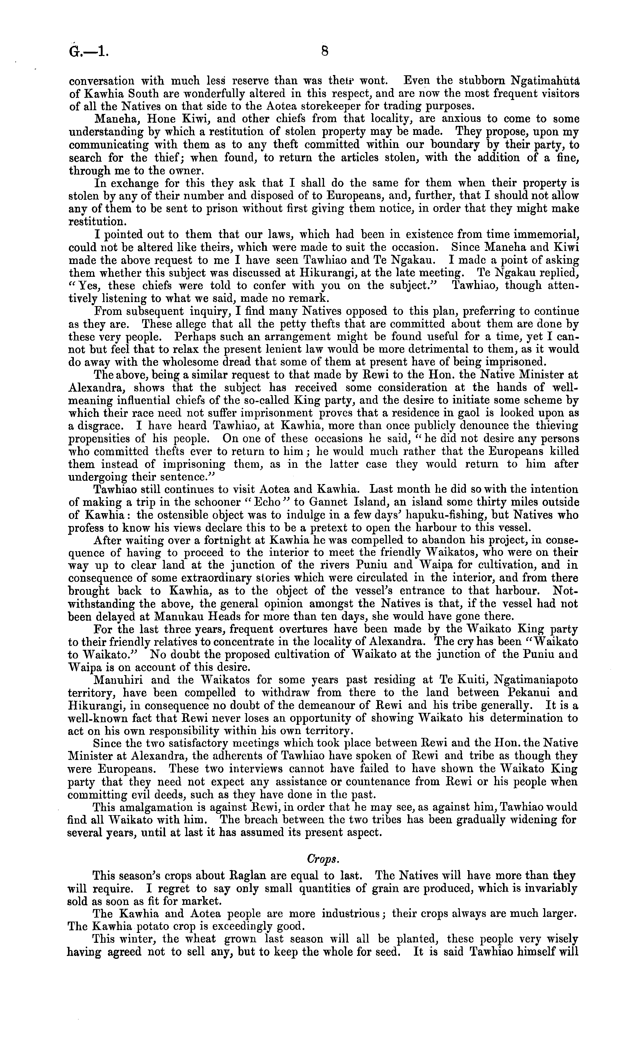 conversation with much less reserve thau was their wont. Even the stubborn Ngatimahiita of Kawhia South are wonderfully altered in this respect, and are now the most frequent visitors of all the Natives on that side to the Aotea storekeeper for trading purposes. Maneha, Hone Kiwi, and other chiefs from that locality, are anxious to come to some understanding by which a restitution of stolen property may be made. They propose, upon my communicating with them as to any theft committed within our "boundary by their party, to search for the thief; when found, to return the articles stolen, with the addition of a fine, through me to the owner. In exchange for this they ask that I shall do the same for them when their property is stolen by any of their number and disposed of to Europeans, and, further, that I should not allow any of them to be sent to prison without first giving them notice, in order that they might make restitution. I pointed out to them that our laws, which had been in existence from time immemorial, could not be altered like theirs, which were made to suit the occasion. Since Maneha and Kiwi made the above request to me I have seen Tawhiao and Te Ngakau. I made a point of asking them whether this subject was discussed at Hikurangi, at the late meeting. Te Ngakau replied, " Yes, these chiefs were told to confer with you on the subject." Tawhiao, though attentively listening to what we said, made no remark. From subsequent inquiry, I find many Natives opposed to this plan, preferring to continue as they are. These allege that all the petty thefts that are committed about them are done by these very people. Perhaps such an arrangement might be found useful for a time, yet I cannot but feel that to relax the present lenient law would be more detrimental to them, as it would do away with the wholesome dread that some of them at present have of being imprisoned. The above, being a similar request to that made by Eewi to the Hon. the Native Minister at Alexandra, shows that the subject has received some consideration at the hands of wellmeaning influential chiefs of the so-called King party, and the desire to initiate some scheme by which their race need not suffer imprisonment proves that a residence in gaol is looked upon as a disgrace. I have heard Tawhiao, at Kawhia, more than once publicly denounce the thieving propensities of his people. On one of these occasions he said, "he did not desire any persons Avho committed thefts ever to return to him ; he would much rather that the Europeans killed them instead of imprisoning them, as in the latter case they would return to him after undergoing their sentence." Tawhiao still continues to visit Aotea and Kawhia. Last month he did so with the intention of making a trip in the schooner " Echo " to Gannet Island, an island some thirty miles outside of Kawhia: the ostensible object was to indulge in a few days' hapuku-fishing, but Natives who profess to know his views declare this to be a pretext to open the harbour to this vessel. After waiting over a fortnight at Kawhia he was compelled to abandon his project, in consequence of having to proceed to the interior to meet the friendly Waikatos, who were on their way up to clear land at the junction of the rivers Puniu and Waipa for cultivation, and in consequence of some extraordinary stories which were circulated in the interior, and from there brought back to Kawhia, as to the object of the vessel's entrance to that harbour. Notwithstanding the above, the general opinion amongst the Natives is that, if the vessel had not been delayed at Manukau Heads for more than ten days, she would have gone there. For the last three years, frequent overtures have been made by the Waikato King party to their friendly relatives to concentrate in the locality of Alexandra. The cry has been "Waikato to Waikato." No doubt the proposed cultivation of Waikato at the junction of the Puniu and Waipa is on account of this desire. Manuhiri and the Waikatos for some years past residing at Te Kuiti, Ngatimaniapoto territory, have been compelled to withdraw from there to the land between Pekanui and Hikurangi, in consequence no doubt of the demeanour of Eewi and his tribe generally. It is a well-known fact that Eewi never loses an opportunity of showing Waikato his determination to act on his own responsibility within his own territory. Since the two satisfactory meetings which took place between Eewi and the Hon. the Native Minister at Alexandra, the adherents of Tawhiao have spoken of Eewi and tribe as though they were Europeans. These two interviews cannot have failed to have shown the Waikato King party that they need not expect any assistance or countenance from Eewi or his people when committing evil deeds, such as they have done in the past. This amalgamation is against Eewi, in order that he may see, as against him, Tawhiao would find all Waikato with him. The breach between the two tribes has been gradually widening for several years, until at last it has assumed its present aspect. Crops. This season's crops about Eaglan are equal to last. The Natives will have more than they will require. I regret to say only small quantities of grain are produced, which is invariably sold as soon as fit for market. The Kawhia and Aotea people are more industrious; their crops always are much larger. The Kawhia potato crop is exceedingly good. This winter, the wheat grown last season will all be planted, these people very wisely having agreed not to sell any, but to keep the whole for seed. It is said Tawhiao himself will