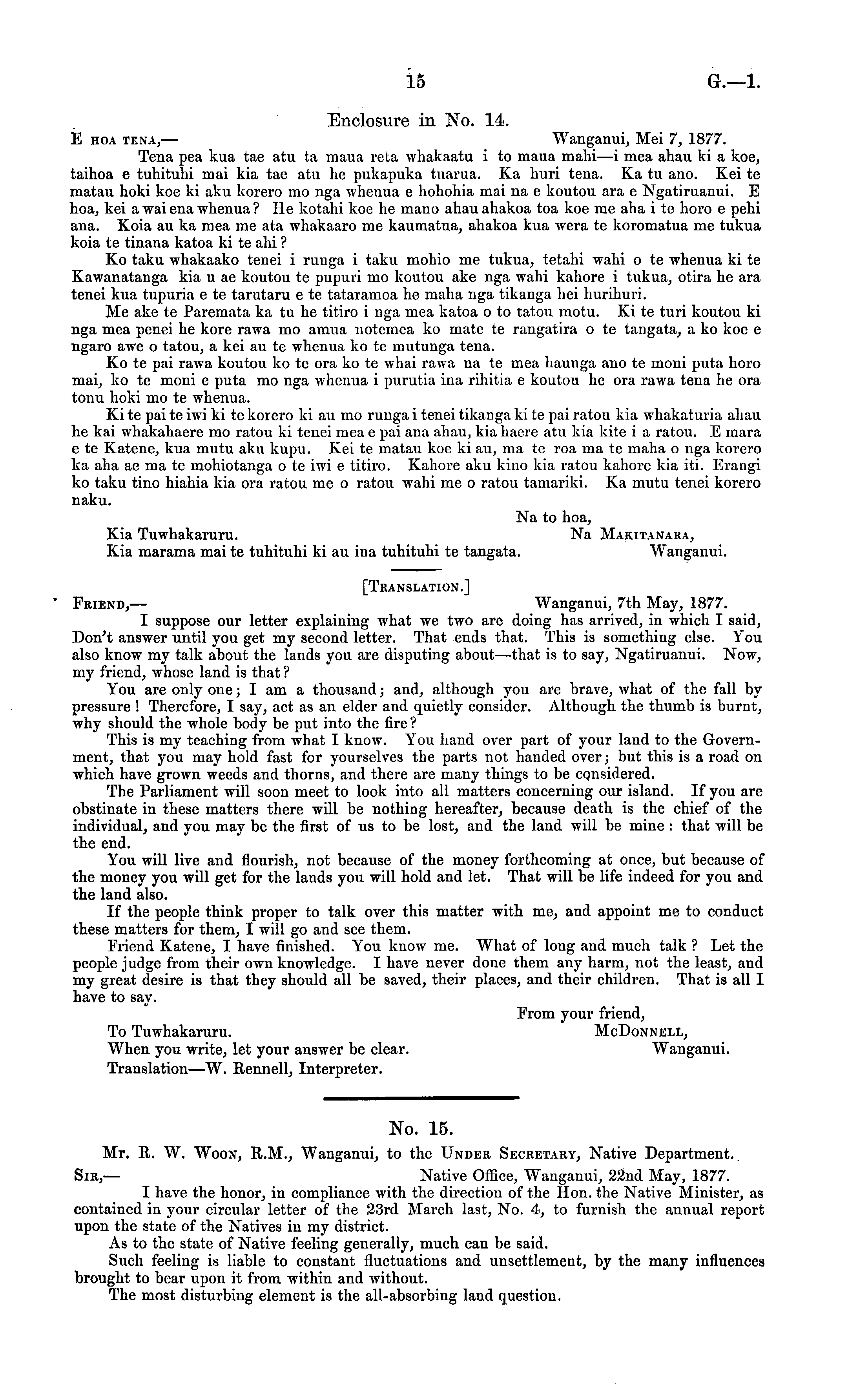 Enclosure in No. 14. E hoa tena, — Wanganui, Mci 7, 1877. Tena pea kua tae atu ta maua reta whakaatu ito maua mahi—i mea ahau ki a koe, taihoa c tuhituhi mai kia tae atu he pukapuka tuarua. Ka huri tena. Ka tv ano. Kei te matau hoki koe ki aku korero mo nga whenua c hohohia mama c koutou ara c Ngatiruanui. E hoa, kei a wai ena whenua ? He kotahi koe he mano ahau ahakoa toa koe me aha i te horo c pehi ana. Koia au ka mea me ata whakaaro me kaumatua, ahakoa kua wera tc koromatua me tukua koia tc tinana katoa kite ahi ? Ko taku whakaako tenei i runga i taku mohio me tukua, tetahi wahi o te whenua kite Kawanatanga kia v ac koutou te pupuri mo koutou ake nga wahi kahore i tukua, otira he ara tenei kua tupuria c te tarutaru c te tataramoa he maha nga tikanga hei hurihuri. Me ake te Paremata ka tv he titiro i nga mea katoa oto tatou motu. Xi te turi koutou ki nga mea penei he kore rawa mo amua notemea ko mate te rangatira o te tangata, a ko koe c ngaro awe o tatou, a kei au te whenua ko te mutunga tena. Ko te pai rawa koutou ko te ora ko te whai rawa na te mea haunga ano te moni puta horo mai, ko te moni c puta mo nga whenua i purutia ma rihitia c koutou he ora rawa tena he ora tonu hold mo te whenua. Xi te pai te iwi kite korero ki au mo runga i tenei tikanga kite pai ratou kia whakaturia ahau he kai whakahaere mo ratou ki tenei mea c pai ana ahau, kia haere atu kia kite i a ratou. E mara etc Katene, kua mutu aku kupu. Kei te matau koe ki au, ma te roa ma te maha o nga korero ka aha ac ma te mohiotanga otc iwi c titiro. Kahore aku kino kia ratou kahore kia iti. Erangi ko taku tino hiahia kia ora ratou me o ratou wahi me o ratou tamariki. Ka mutu tenei korero naku. Na to hoa, Kia Tuwhakaruru. Na Makitanara, Kia marama mai te tuhituhi ki au ma tuhituhi te tangata. Wanganui.