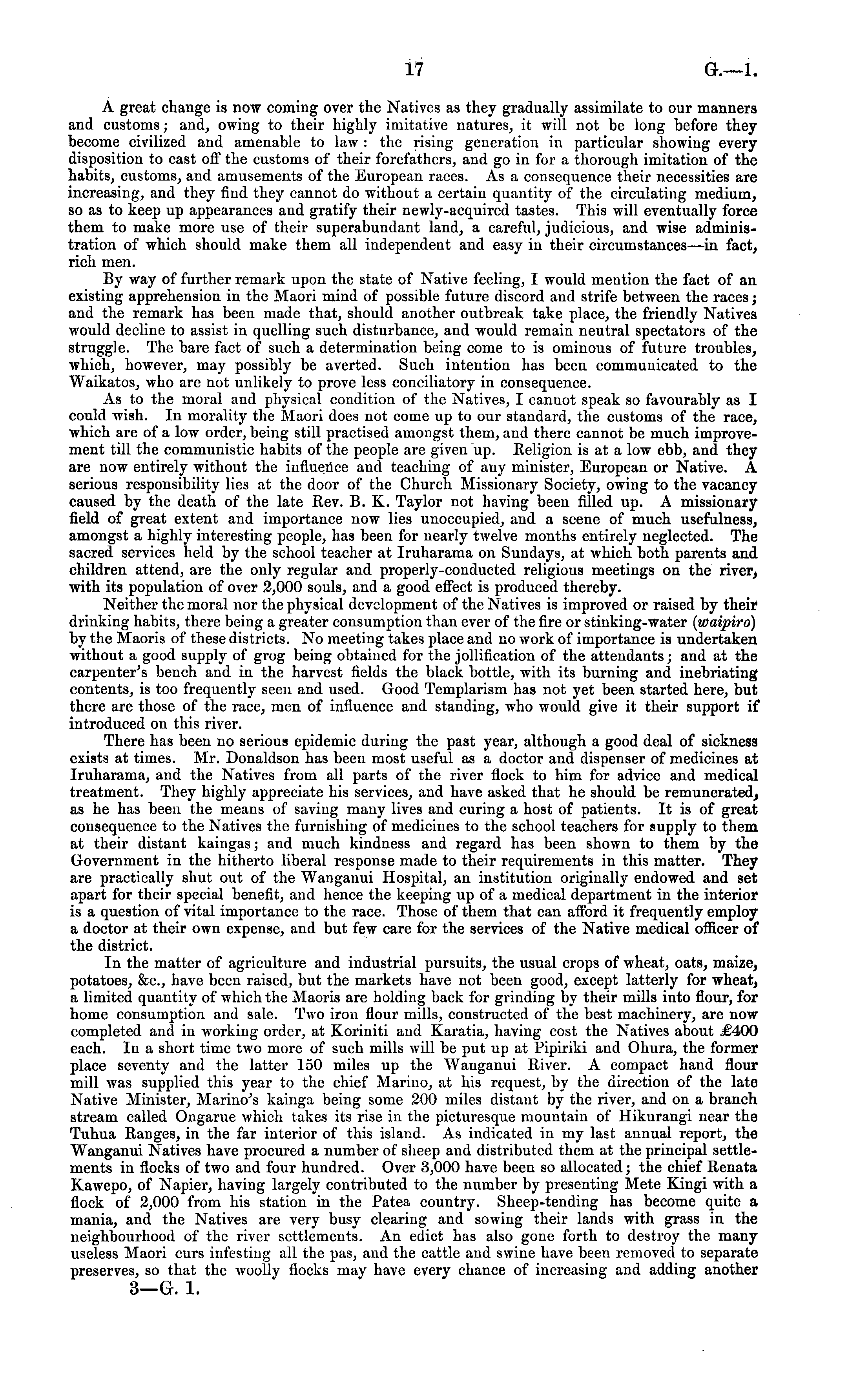 A great change is now coming over the Natives as they gradually assimilate to our manners and customs; and, owing to their highly imitative natures, it will not be long before they become civilized and amenable to law : the rising generation in particular showing every disposition to cast off the customs of their forefathers, and go in for a thorough imitation of the habits, customs, and amusements of the European races. As a consequence their necessities are increasing, and they find they cannot do without a certain quantity of the circulating medium, so as to keep up appearances and gratify their newly-acquired tastes. This will eventually force them to make more use of their superabundant land, a careful, judicious, and wise administration of which should make them all independent and easy in their circumstances—in fact, rich men. By way of further remark upon the state of Native feeling, I would mention the fact of an existing apprehension in the Maori mind of possible future discord and strife between the races; and the remark has been made that, should another outbreak take place, the friendly Natives would decline to assist in quelling such disturbance, and would remain neutral spectators of the struggle. The bare fact of such a determination being come to is ominous of future troubles, which, however, may possibly be averted. Such intention has been communicated to the Waikatos, who are not unlikely to prove less conciliatory in consequence. As to the moral and physical condition of the Natives, I cannot speak so favourably as I could wish. In morality the Maori does not come up to our standard, the customs of the race, which are of a low order, being still practised amongst them, and there cannot be much improvement till the communistic habits of the people are given up. lleligion is at a low ebb, and they are now entirely without the influence and teaching of any minister, European or Native. A serious responsibility lies at the door of the Church Missionary Society, owing to the vacancy caused by the death of the late Eev. B. K. Taylor not having been filled up. A missionary field of great extent and importance now lies unoccupied, and a scene of much usefulness, amongst a highly interesting people, has been for nearly twelve months entirely neglected. The sacred services held by the school teacher at Iruharama on Sundays, at which both parents and children attend, are the only regular and properly-conducted religious meetings on the river, with its population of over 2,000 souls, and a good effect is produced thereby. Neither the moral nor the physical development of the Natives is improved or raised by their drinking habits, there being a greater consumption than ever of the fire or stinking-water [waipiro) by the Maoris of these districts. No meeting takes place and no work of importance is undertaken without a good supply of grog being obtained for the jollification of the attendants; and at the carpenter's bench and in the harvest fields the black bottle, with its burning and inebriating contents, is too frequently seen and used. Good Templarism has not yet been started here, but there are those of the race, men of influence and standing, who would give it their support if introduced on this river. There has been no serious epidemic during the past year, although a good deal of sickness exists at times. Mr. Donaldson has been most useful as a doctor and dispenser of medicines at Iruharama, and the Natives from all parts of the river flock to him for advice and medical treatment. They highly appreciate his services, and have asked that he should be remunerated, as he has been the means of saving many lives and curing a host of patients. It is of great consequence to the Natives the furnishing of medicines to the school teachers for supply to them at their distant kaingas; and much kindness and regard has been shown to them by the Government in the hitherto liberal response made to their requirements in this matter. They are practically shut out of the Wanganui Hospital, an institution originally endowed and set apart for their special benefit, and hence the keeping up of a medical department in the interior is a question of vital importance to the race. Those of them that can afford it frequently employ a doctor at their own expense, and but few care for the services of the Native medical officer of the district. In the matter of agriculture and industrial pursuits, the usual crops of wheat, oats, maize, potatoes, &c, have been raised, but the markets have not been good, except latterly for wheat, a limited quantity of which the Maoris are holding back for grinding by their mills into flour, for home consumption and sale. Two iron flour mills, constructed of the best machinery, are now completed and in working order, at Koriniti and Karatia, having cost the Natives about £400 each. In a short time two more of such mills will be put up at Pipiriki and Ohura, the former place seventy and the latter 150 miles up the W ranganui Eiver. A compact hand flour mill was supplied this year to the chief Marino, at his request, by the direction of the late Native Minister, Marino's kainga being some 200 miles distant by the river, and on a branch stream called Ongaruc which takes its rise in the picturesque mountain of Hikurangi near the Tuhua Eangcs, in the far interior of this island. As indicated in my last annual report, the Whanganui Natives have procured a number of sheep and distributed them at the principal settlements in flocks of two and four hundred. Over 3,000 have been so allocated; the chief Eenata Kawepo, of Napier, having largely contributed to the number by presenting Mete Kingi with a flock of 2,000 from his station in the Patea country. Sheep-tending has become quite a mania, and the Natives are very busy clearing and sowing their lands with grass in the neighbourhood of the river settlements. An edict has also gone forth to destroy the many useless Maori curs inf
