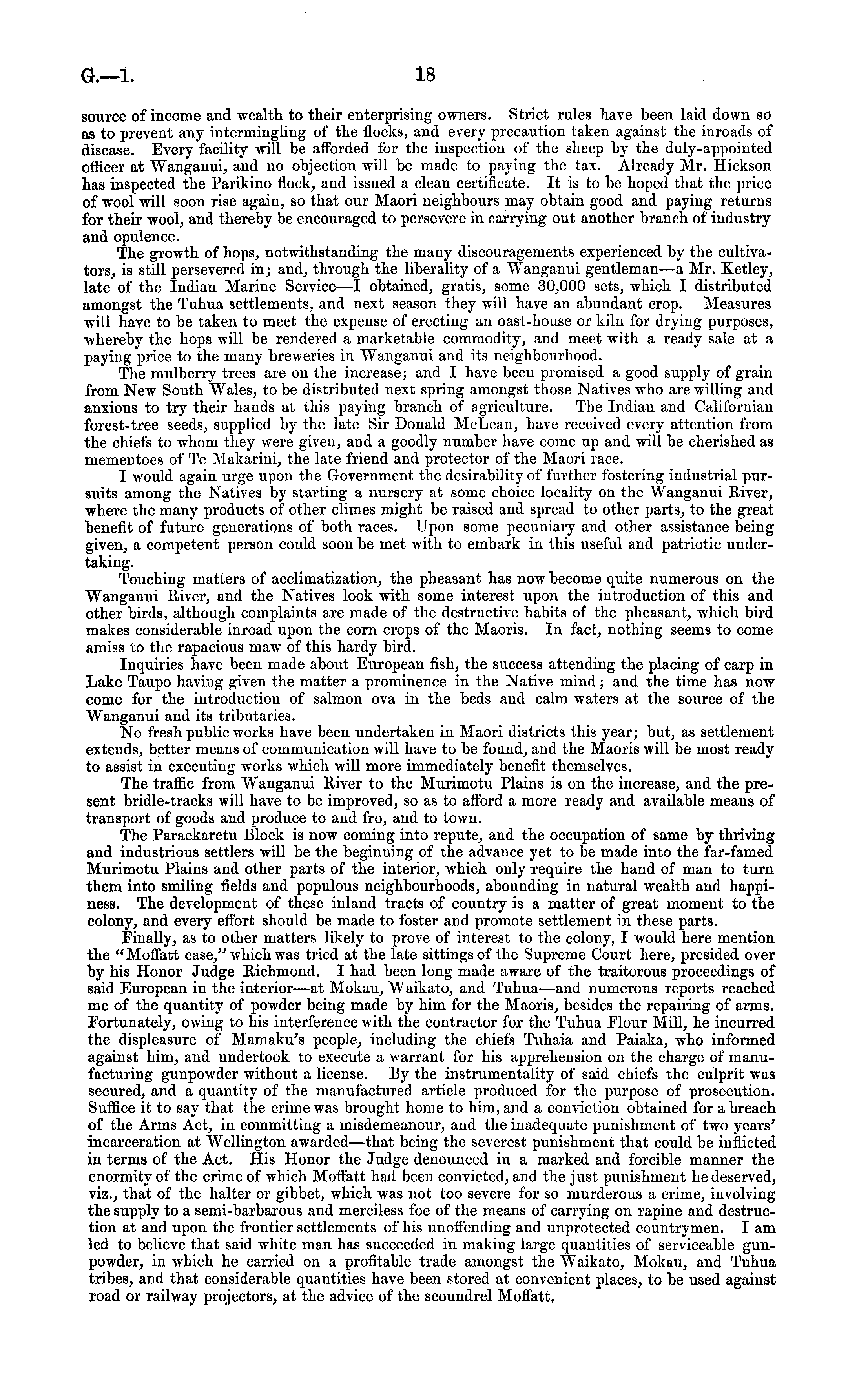 source of income and wealth to their enterprising owners. Strict rules have been laid down so as to prevent any intermingling of the flocks, and every precaution taken against the inroads of disease. Every facility will be afforded for the inspection of the sheep by the duly-appointed officer at Wanganui, and no objection will be made to paying the tax. Already Mr. Hickson has inspected the Parikino flock, and issued a clean certificate. It is to be hoped that the price of wool will soon rise again, so that our Maori neighbours may obtain good and paying returns for their wool, and thereby be encouraged to persevere in carrying out another branch of industry and opulence. The growth of hops, notwithstanding the many discouragements experienced by the cultivators, is still persevered in; and, through the liberality of a Wanganui gentleman—a Mr. Ketley, late of the Indian Marine Service —I obtained, gratis, some 30,000 sets, which I distributed amongst the Tuhua settlements, and next season they will have an abundant crop. Measures will have to be taken to meet the expense of erecting an oast-house or kiln for drying purposes, whereby the hops will be rendered a marketable commodity, and meet with a ready sale at a paying price to the many breweries in Wanganui and its neighbourhood. The mulberry trees are on the increase; and I have been promised a good supply of grain from New South W rales, to be distributed next spring amongst those Natives who are willing and anxious to try their hands at this paying branch of agriculture. The Indian and Californian forest-tree seeds, supplied by the late Sir Donald McLean, have received every attention from the chiefs to whom they were given, and a goodly number have come up and will be cherished as mementoes of Te Makarini, the late friend and protector of the Maori race. I would again urge upon the Government the desirability of further fostering industrial pursuits among the Natives by starting a nursery at some choice locality on the Wanganui Eiver, where the many products of other climes might be raised and spread to other parts, to the great benefit of future generations of both races. Upon some pecuniary and other assistance being given, a competent person could soon be met with to embark in this useful and patriotic undertaking. Touching matters of acclimatization, the pheasant has now become quite numerous on the Wanganui Eiver, and the Natives look with some interest upon the introduction of this and other birds, although complaints are made of the destructive habits of the pheasant, which bird makes considerable inroad upon the corn crops of the Maoris. In fact, nothing seems to come amiss to the rapacious maw of this hardy bird. Inquiries have been made about European fish, the success attending the placing of carp in Lake Taupo having given the matter a prominence in the Native mind; and the time has now come for the introduction of salmon ova in the beds and calm waters at the source of the Wanganui and its tributaries. No fresh public works have been undertaken in Maori districts this year; but, as settlement extends, better means of communication will have to be found, and the Maoris will be most ready to assist in executing works which will more immediately benefit themselves. The traffic from W ranganui Eiver to the Murimotu Plains is on the increase, and the present bridle-tracks will have to be improved, so as to afford a more ready and available means of transport of goods and produce to and fro, and to town. The Paraekaretu Block is now coming into repute, and the occupation of same by thriving and industrious settlers will be the beginning of the advance yet to be made into the far-famed Murimotu Plains and other parts of the interior, which only require the hand of man to turn them into smiling fields and populous neighbourhoods, abounding in natural wealth and happiness. The development of these inland tracts of country is a matter of great moment to the colony, and every effort should be made to foster and promote settlement in these parts. Finally, as to other matters likely to prove of interest to the colony, I would here mention the "Moffatt case," which was tried at the late sittings of the Supreme Court here, presided over by his Honor Judge Eichmond. I had been long made aware of the traitorous proceedings of said European in the interior—at Mokau, W raikato, and Tuhua—and numerous reports reached me of the quantity of powder being made by him for the Maoris, besides the repairing of arms. Fortunately, owing to his interference with the contractor for the Tuhua Flour Mill, he incurred the displeasure of Mamaku's people, including the chiefs Tuhaia and Paiaka, who informed against him, and undertook to execute a warrant for his apprehension on the charge of manufacturing gunpowder without a license. By the instrumentality of said chiefs the culprit was secured, and a quantity of the manufactured article produced for the purpose of prosecution. Suffice it to say that the crime was brought home to him, and a conviction obtained for a breach of the Arms Act, in committing a misdemeanour, and the inadequate punishment of two years' incarceration at Wellington awarded—that being the severest punishment that could be inflicted in terms of the Act. His Honor the Judge denounced in a marked and forcible manner the enormity of the crime of which Moffatt had been convicted, and the just punishment he deserved, viz., that of the halter or gibbet, which was not too severe for so murderous a crime, involving the supply to a semi-barbarous and merciless foe of the means of carrying on rapine and destruction at and upon the frontier settlements of his unoffending and unprotected countrymen. lam led to believe that said white man has succeeded in making large quantities of serviceable gunpowder, in which he carried on a profitable trade amongst the Waikato, Mokau, and Tuhua tribes, and that considerable quantities have been s