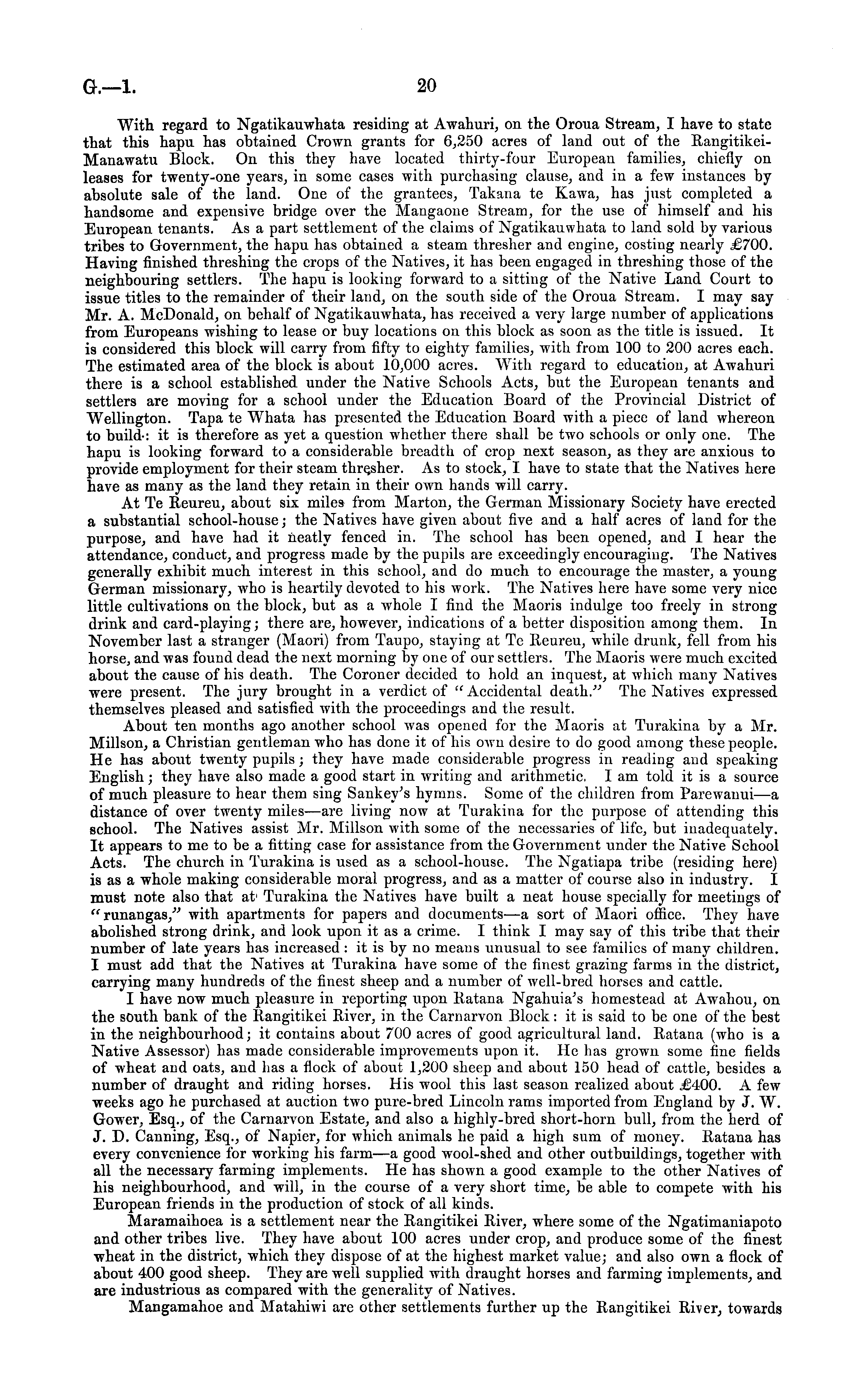 With regard to Ngatikauwhata residing at Awahuri, on the Oroua Stream, I have to state that this hapu has obtained Crown grants for 6,250 acres of land out of the RangitikeiManawatu Block. On this they have located thirty-four European families, chiefly on leases for twenty-one years, in some cases with purchasing clause, and in a few instances by absolute sale of the land. One of the grantees, Takana te Kawa, has just completed a handsome and expensive bridge over the Mangaone Stream, for the use of himself and his European tenants. As a part settlement of the claims of Ngatikauwhata to land sold by various tribes to Government, the hapu has obtained a steam thresher and engine, costing nearly £700. Having finished threshing the crops of the Natives, it has been engaged in threshing those of the neighbouring settlers. The hapu is looking forward to a sitting of the Native Land Court to issue titles to the remainder of their land, on the south side of the Oroua Stream. I may say Mr. A. McDonald, on behalf of Ngatikauwhata, has received a very large number of applications from Europeans wishing to lease or buy locations on this block as soon as the title is issued. It is considered this block will carry from fifty to eighty families, witb from 100 to 200 acres each. The estimated area of the block is about 10,000 acres. With regard to education, at Awahuri there is a school established under the Native Schools Acts, but the European tenants and settlers are moving for a school under the Education Board of the Provincial District of Wellington. Tapa te Whata has presented the Education Board with a piece of land whereon to build-: it is therefore as yet a question whether there shall be two schools or only one. The hapu is looking forward to a considerable breadth of crop next season, as they are anxious to provide employment for their steam thresher. As to stock, I have to state that the Natives here have as many as the land they retain in their own hands will carry. At Te Reureu, about six miles from Marton, the German Missionary Society have erected a substantial school-house; the Natives have given about five and a half acres of land for the purpose, and have had it neatly fenced in. The school has been opened, and I hear the attendance, conduct, and progress made by the pupils are exceedingly encouraging. The Natives generally exhibit much interest in this school, and do much to encourage the master, a young German missionary, who is heartily devoted to his work. The Natives here have some very nice little cultivations on the block, but as a whole I find the Maoris indulge too freely in strong drink and card-playing; there are, howevei*, indications of a better disposition among them. In November last a stranger (Maori) from Taupo, staying at Te Reureu, while drunk, fell from his horse, and was found dead the next morning by one of our settlers. The Maoris were much excited about the cause of his death. The Coroner decided to hold an inquest, at which many Natives were present. The jury brought in a verdict of " Accidental death." The Natives expressed themselves pleased and satisfied with the proceedings and the result. About ten months ago another school was opened for the Maoris at Turakina by a Mr. Millson, a Christian gentleman who has done it of his own desire to do good among these people. He has about twenty pupils; they have made considerable progress in reading and speaking English; they have also made a good start in writing and arithmetic. lam told it is a source of much pleasure to hear them sing Sankey's hymns. Some of the children from Parewanui—a distance of over twenty miles—are living now at Turakina for the purpose of attending this school. The Natives assist Mr. Millson with some of the necessaries of life, but inadequately. It appears to me to be a fitting case for assistance from the Government under the Native School Acts. The church in Turakina is used as a school-house. The Ngatiapa tribe (residing here) is as a whole making considerable moral progress, and as a matter of course also in industry. I must note also that at1 Turakina the Natives have built a neat house specially for meetings of "runangas," with apartments for papers and documents —a sort of Maori office. They have aholished strong drink, and look upon it as a crime. I think I may say of this tribe that their number of late years has increased : it is by no means unusual to see families of many children. I must add that the Natives at Turakina have some of the finest grazing farms in the district, carrying many hundreds of the finest sheep and a number of well-bred horses and cattle. I have now much pleasure in reporting upon Ratana Ngahuia's homestead at Awahou, on the south bank of the Rangitikei River, in the Carnarvon Block: it is said to be one of the best in the neighbourhood; it contains about 700 acres of good agricultural land. Ratana (who is a Native Assessor) has made considerable improvements upon it. He has grown some fine fields of wheat and oats, and has a flock of about 1,200 sheep and about 150 bead of cattle, besides a number of draught and riding horses. His wool this last season realized about £400. A few weeks ago he purchased at auction two pure-bred Lincoln rams imported from England by J. W. Gower, Esq., of the Carnarvon Estate, and also a highly-bred short-horn bull, from the herd of J. D. Canning, Esq., of Napier, for which animals he paid a high sum of money. Ratana has every convenience for working his farm—a good wool-shed and other outbuildings, together with all the necessary farming implements. He has shown a good example to the other Natives of his neighbourhood, and will, in the course of a very short time, be able to compete with his European friends in the production of stock of all kinds. Maramaihoea is a settlement near the Rangitikei River, where some of the Ngatimaniapoto and other tribes live. They have about 100 acres under crop, and produce some