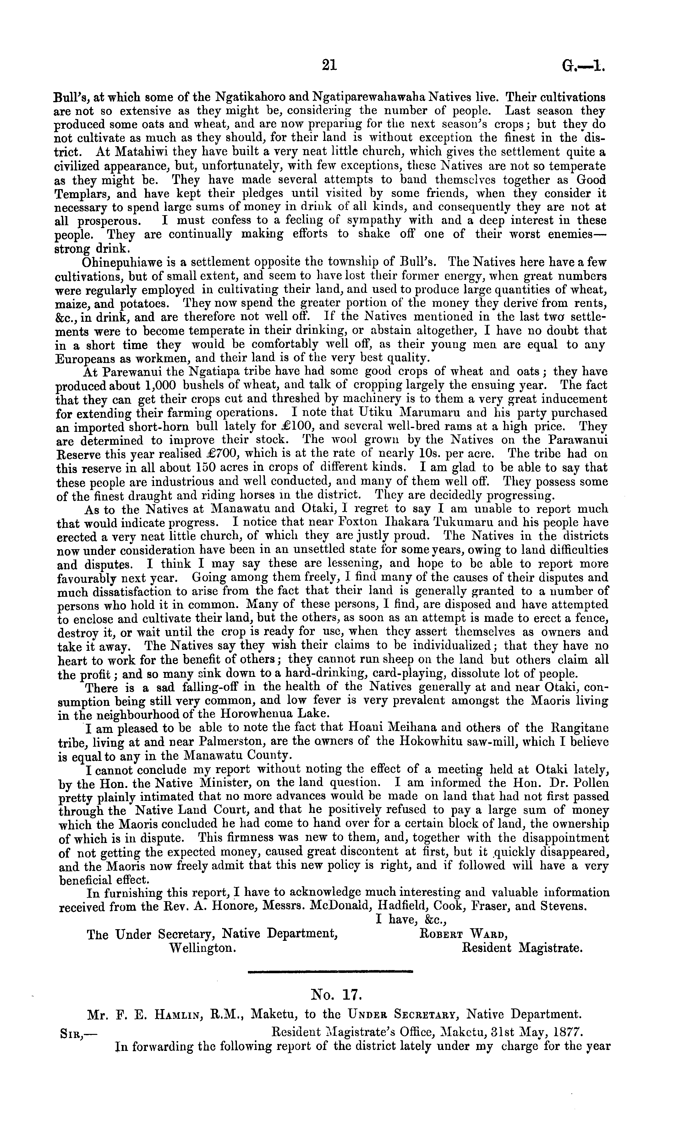 No. 17. Mr. F. E. Hamlin, E.M., Maketu, to the Under Secretary, Native Department. Sir, — Eesident Magistrate's Office, Maketu, 31st May, 1877. In forwarding the following report of the district lately under my charge for the year