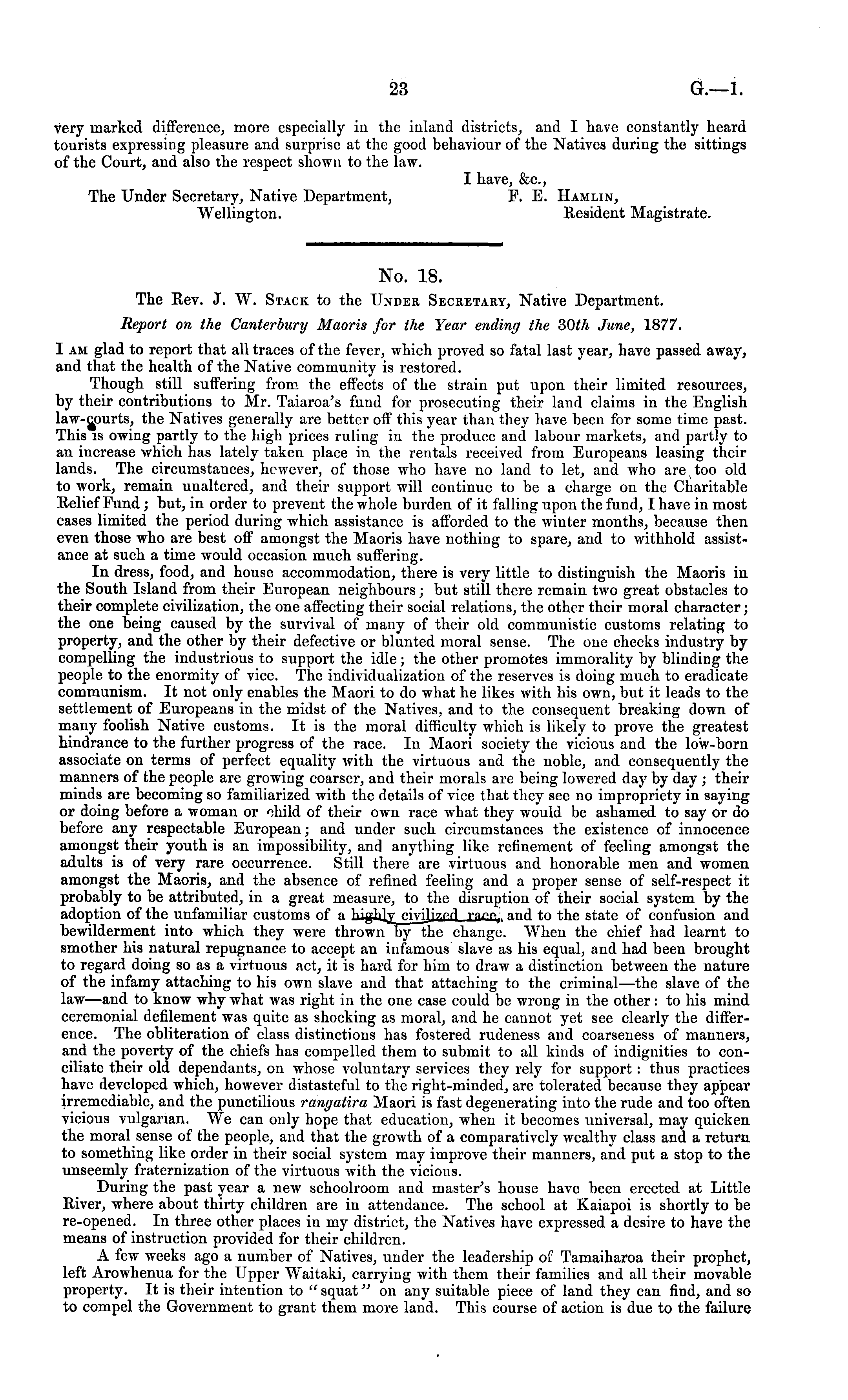 No. 18. The Eev. J. W. Stack to the Under Secretary, Native Department. Report on the Canterbury Maoris for the Year ending the 30th June, 1877. I am glad to report that all traces of the fever, which proved so fatal last year, have passed away, and that the health of the Native community is restored. Though still suffering from the effects of the strain put upon their limited resources, by their contributions to Mr. Taiaroa's fund for prosecuting their land claims in the English law-courts, the Natives generally are better off this year than they have been for some time past. This is owing partly to the high prices ruling in the produce and labour markets, and partly to an increase which has lately taken place in the rentals received from Europeans leasing their lands. The circumstances, however, of those who have no land to let, and who are too old to work, remain unaltered, and their support will continue to be a charge on the Charitable Belief Fund; but, in order to prevent the whole burden of it falling upon the fund, I have in most cases limited the period during which assistance is afforded to the winter months, because then even those who are best off amongst the Maoris have nothing to spare, and to withhold assistance at such a time would occasion much suffering. In dress, food, and house accommodation, there is very little to distinguish the Maoris iv the South Island from their European neighbours; but still there remain two great obstacles to their complete civilization, the one affecting their social relations, the other their moral character; the one being caused by the survival of many of their old communistic customs relating to property, and the other by their defective or blunted moral sense. The one checks industry by compelling the industrious to support the idle; the other promotes immorality by blinding the people to the enormity of vice. The individualization of the reserves is doing much to eradicate communism. It not only enables the Maori to do what he likes with his own, but it leads to the settlement of Europeans in the midst of the Natives, and to the consequent breaking down of many foolish Native customs. It is the moral difficulty which is likely to prove the greatest hindrance to the further progress of the race. In Maori society the vicious and the low-born associate on terms of perfect equality with the virtuous and the noble, and consequently the manners of the people are growing coarser, and their morals are being lowered day by day ; their minds are becoming so familiarized with the details of vice that they see no impropriety in saying or doing before a woman or child of their own race what they would be ashamed to say or do before any respectable European; and under such circumstances the existence of innocence amongst their youth is an impossibility, and anything like refinement of feeling amongst the adults is of very rare occurrence. Still there are virtuous and honorable men and women amongst the Maoris, and the absence of refined feeling and a proper sense of self-respect it probably to be attributed, in a great measure, to the disruption of their social system by the adoption of the unfamiliar customs of a highly civijjyed race, and to the state of confusion and bewilderment into which they were thrown by the change. When the chief had learnt to smother his natural repugnance to accept an infamous slave as his equal, and had been brought to regard doing so as a virtuous act, it is hard for him to draw a distinction between the nature of the infamy attaching to his own slave and that attaching to the criminal—the slave of the law—and to know why what was right in the one case could be wrong in the other: to his mind ceremonial defilement was quite as shocking as moral, and he cannot yet see clearly the difference. The obliteration of class distinctions has fostered rudeness and coarseness of manners, and the poverty of the chiefs has compelled them to submit to all kinds of indignities to conciliate their old dependants, on whose voluntary services they rely for support : thus practices have developed which, however distasteful to the right-minded, are tolerated because they appear irremediable, and the punctilious rangatira Maori is fast degenerating into the rude and too often vicious vulgarian. We can only hope that education, when it becomes universal, may quicken the moral sense of the people, and that the growth of a comparatively wealthy class and a return to something like order in their social system may improve their manners, and put a stop to the unseemly fraternization of the virtuous with the vicious. During the past year a new schoolroom and master's house have been erected at Little Eiver, where about thirty children are in attendance. The school at Kaiapoi is shortly to be re-opened. In three other places in my district, the Natives have expressed a desire to have the means of instruction provided for their children. A few weeks ago a number of Natives, under the leadership of Tamaiharoa their prophet, left Arowhenua for the Upper Waitaki, carrying with them their families and all their movable property. It is their intention to "squat" on any suitable piece of land they can find, and so to compel the Government to grant them more land. This course of action is due to the failure