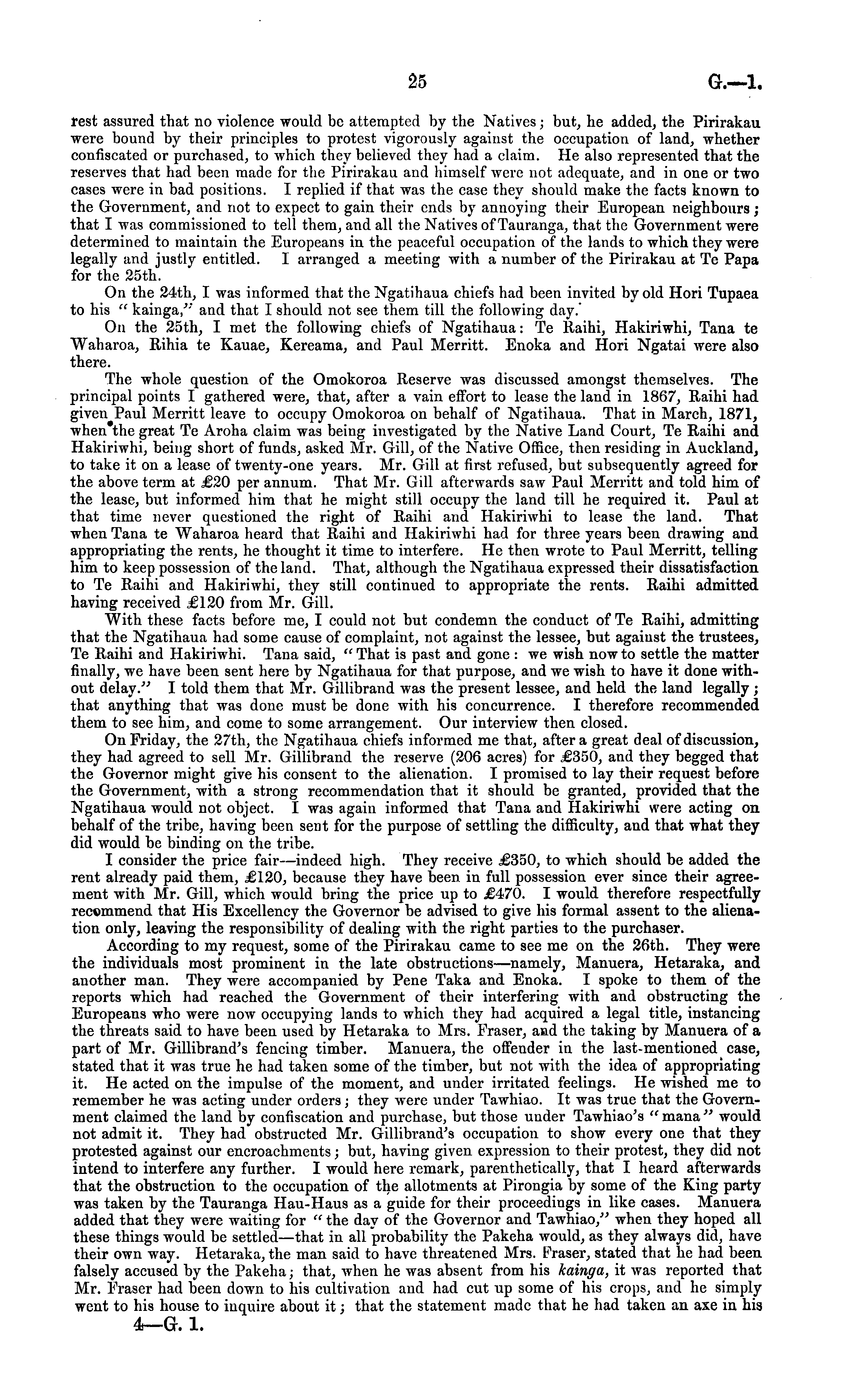 rest assured that no violence would be attempted by the Natives; but, he added, the Pirirakau were bound by their principles to protest vigorously against the occupation of land, whether confiscated or purchased, to which they believed they had a claim. He also represented that the reserves that had been made for the Pirirakau and himself were not adequate, and in one or two cases were in bad positions. I replied if that was the case they should make the facts known to the Government, and not to expect to gain their ends by annoying their European neighbours ; that I was commissioned to tell them, aud all the Natives of Tauranga, that the Government were determined to maintain the Europeans in the peaceful occupation of the lands to which they were legally and justly entitled. I arranged a meeting with a number of the Pirirakau at Te Papa for the 25th. On the 24th, I was informed that the Ngatihaua chiefs had been invited by old Hori Tupaea to his " kainga," and that I should not see them till the following day." On the 25th, I met the following chiefs of Ngatihaua: Te Eaihi, Hakiriwhi, Tana te Waharoa, Eihia te Kauae, Kereama, and Paul Merritt. Enoka and Hori Ngatai were also there. The whole question of the Omokoroa Eeserve was discussed amongst themselves. The principal points I gathered were, that, after a vain effort to lease the land in 1867, Eaihi had given Paul Merritt leave to occupy Omokoroa on behalf of Ngatihaua. That in March, 1871, when the great Te Aroha claim was being investigated by the Native Land Court, Te Eaihi and Hakiriwhi, being short of funds, asked Mr. Gill, of the Native Office, then residing in Auckland, to take it on a lease of twenty-one years. Mr. Gill at first refused, but subsequently agreed for the above term at £20 per annum. That Mr. Gill afterwards saw Paul Merritt and toid him of the lease, but informed him that he might still occupy the land till he required it. Paul at that time never questioned the right of Eaihi and Hakiriwhi to lease the land. That when Tana te Waharoa heard that Eaihi and Hakiriwhi had for three years been drawing and appropriating the rents, he thought it time to interfere. He then wrote to Paul Merritt, telling him to keep possession of the land. That, although the Ngatihaua expressed their dissatisfaction to Te Eaihi and Hakiriwhi, they still continued to appropriate the rents. Eaihi admitted having received £120 from Mr. Gill. With these facts before me, I could not but condemn the conduct of Te Eaihi, admitting that the Ngatihaua had some cause of complaint, not against the lessee, but against the trustees, Te Eaihi and Hakiriwhi. Tana said, " That is past and gone : we wish now to settle the matter finally, we have been sent here by Ngatihaua for that purpose, and we wish to have it done without delay." I told them that Mr. Gillibrand was the present lessee, and held the land legally ; that anything that was done must be done with his concurrence. I therefore recommended them to see him, and come to some arrangement. Our interview then closed. On Friday, the 27th, the Ngatihaua chiefs informed me that, after a great deal of discussion, they had agreed to sell Mr. Gillibrand the reserve (206 acres) for £350, and they begged that the Governor might give his consent to the alienation. I promised to lay their request before the Government, with a strong recommendation that it should be granted, provided that the Ngatihaua would not object. I was again informed that Tana and Hakiriwhi were acting on behalf of the tribe, having been sent for the purpose of settling the difficulty, and that what they did would be binding on the tribe. I consider the price fair—indeed high. They receive £350, to which should he added the rent already paid them, £120, because they have been in full possession ever since their agreement with Mr. Gill, which would bring the price up to £470. I would therefore respectfully recommend that His Excellency the Governor be advised to give his formal assent to the alienation only, leaving the responsibility of dealing with the right parties to the purchaser. According to my request, some of the Pirirakau came to see me on the 26th. They were the individuals most prominent in the late obstructions—namely, Manuera, Hetaraka, and another man. They were accompanied by Pene Taka and Enoka. I spoke to them of the reports which had reached the Government of their interfering with and obstructing the Europeans who were now occupying lands to which they had acquired a legal title, instancing the threats said to have been used by Hetaraka to Mrs. Fraser, and the taking by Manuera of a part of Mr. Gillibrand's fencing timber. Manuera, the offender in the last-mentioned case, stated that it was true he had taken some of the timber, but not with the idea of appropriating it. He acted on the impulse of the moment, and under irritated feelings. He wished me to remember he was acting under orders; they were under Tawhiao. It was true that the Government claimed the land by confiscation and purchase, but those under Tawhiao's " mana " would not admit it. They had obstructed Mr. Gillibrand's occupation to show every one that they protested against our encroachments; but, having given expression to their protest, they did not intend to interfere any further. I would here remark, parenthetically, that I heard afterwards that the obstruction to the occupation of the allotments at Pirongia by some of the King party was taken by the Tauranga Hau-Haus as a guide for their proceedings in like cases. Manuera added that they were waiting for " the day of the Governor and Tawhiao," when they hoped all these things would be settled—that in all probability the Pakeha would, as they always did, have their own way. Hetaraka, the man said to have threatened Mrs. Fraser, stated that he had been falsely accused by the Pakeha; that, when he was absent from his kainga, it was reported that Mr. Fraser had been down to his cultivati