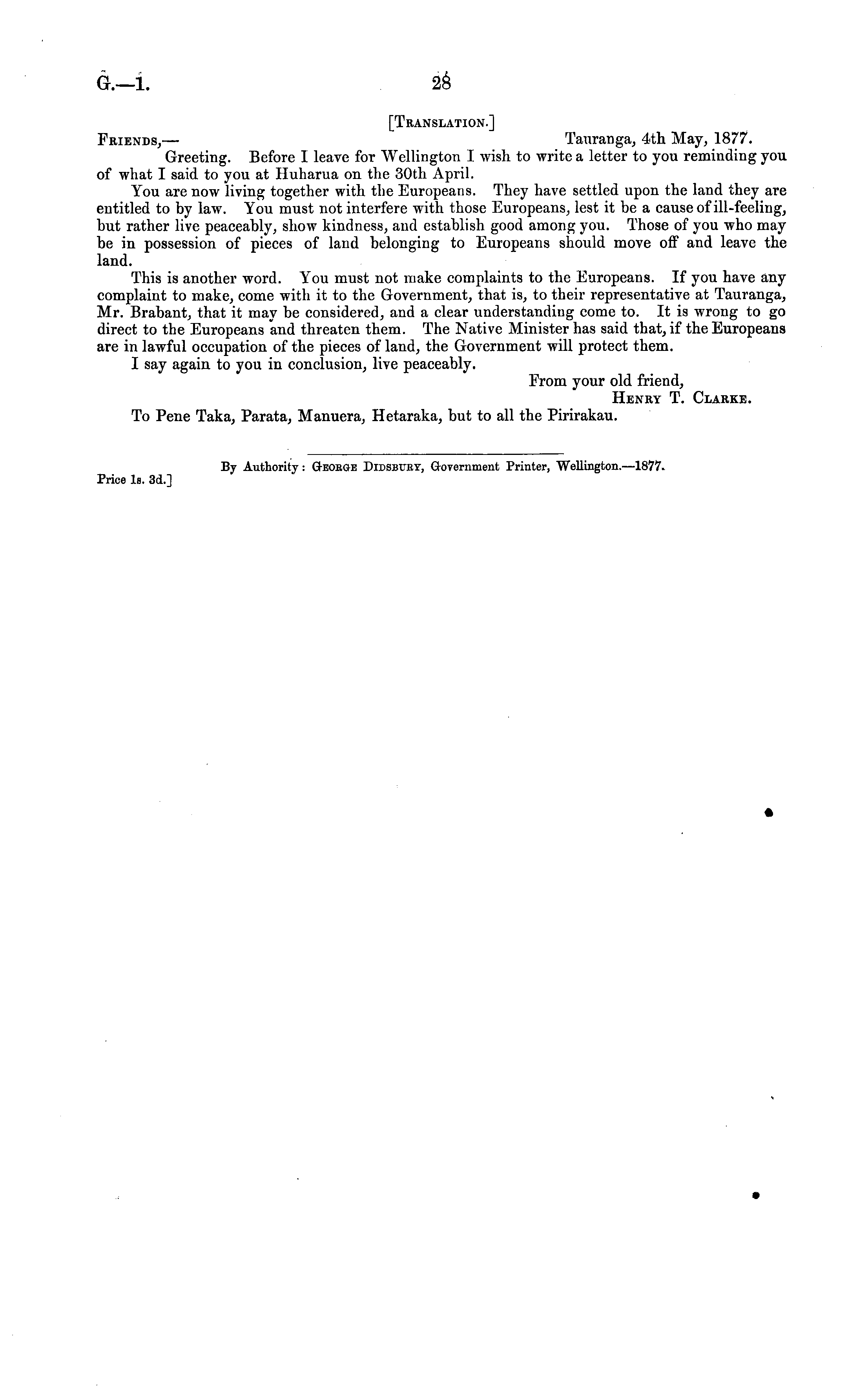 [Translation.] Friends, — Tauranga, 4th May, 1877. Greeting. Before I leave for Wellington I wish to write a letter to you reminding you of what I said to you at Huharua on the 30th April. You are now living together with the Europeans. They have settled upon the land they are entitled to by law. You must not interfere with those Europeans, lest it be a cause of ill-feeling, but rather live peaceably, show kindness, aud establish good among you. Those of you who may be in possession of pieces of land belonging to Europeans should move off and leave the land. This is another word. You must not make complaints to the Europeans. If you have any complaint to make, come with it to the Government, that is, to their representative at Tauranga, Mr. Brabant, that it may be considered, and a clear understanding come to. It is wrong to go direct to the Europeans and threaten them. The Native Minister has said that, if the Europeans are in lawful occupation of the pieces of land, the Government will protect them. I say again to you in conclusion, live peaceably. From your old friend, Henry T. Clarke. To Pene Taka, Parata, Manuera, Hetaraka, but to all the Pirirakau.