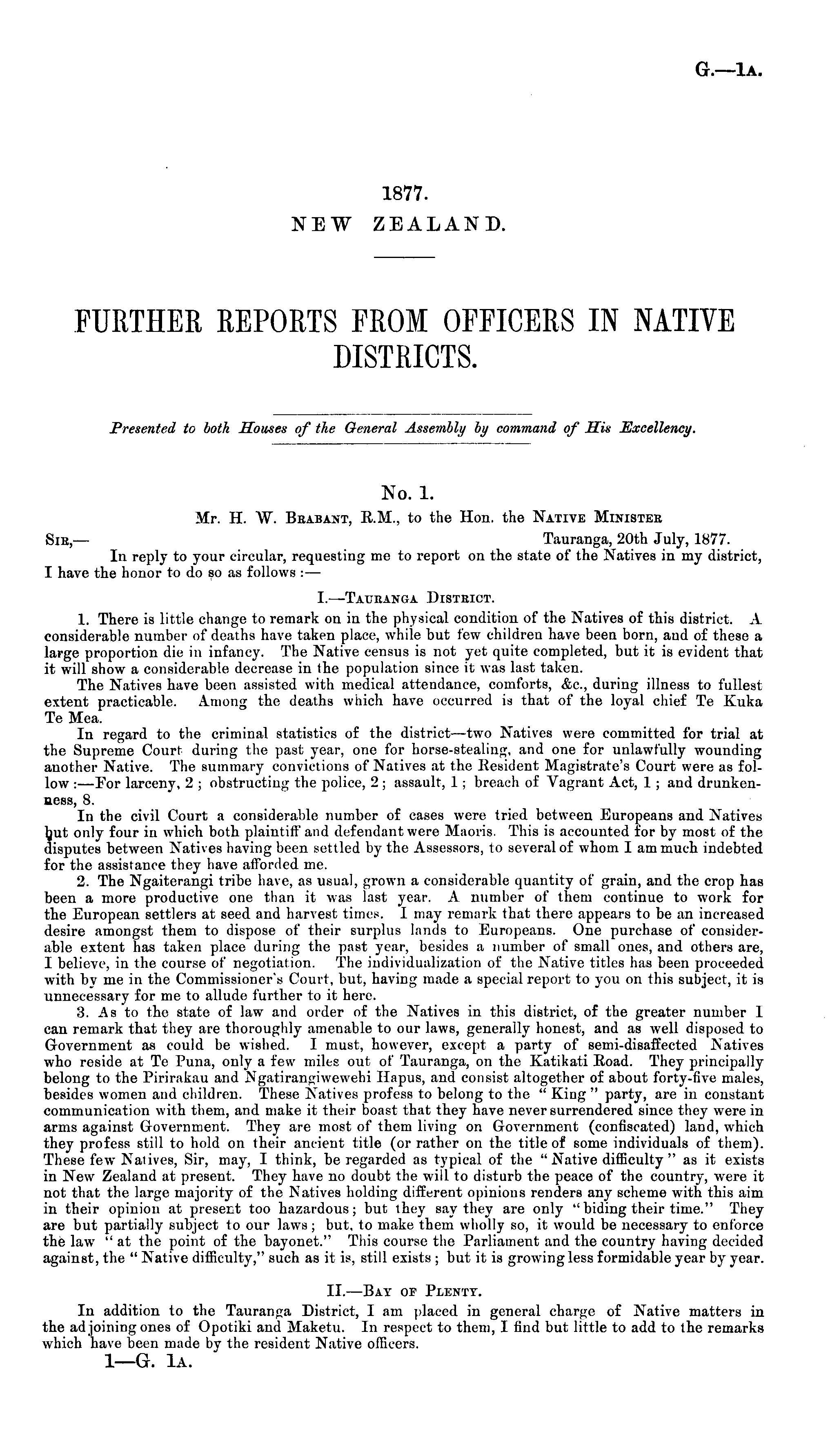 Presented to both Houses of the General Assembly by command of His Excellency. No. 1. Mr. H. W. Brabant, E.M., to the Hon. the Native Minister Sib,— Tauranga, 20th July, 1877. In reply to your circular, requesting me to report on the state of the Natives in my district, I have the honor to do so as follows :— I.—Tauranga District. 1. There is little change to remark on in the physical condition of the Natives of this district. A considerable number of deaths have taken place, while but few children have been born, aud of these a large proportion die in infancy. The Native census is not yet quite completed, but it is evident that it will show a considerable decrease in the population since it was last taken. The Natives have been assisted with medical attendance, comforts, &c, during illness to fullest extent practicable. Among the deaths which have occurred ia that of the loyal chief Te Kuka Te Mea. In regard to the criminal statistics of the district—two Natives were committed for trial at the Supreme Court during the past year, one for horse-stealing, and one for unlawfully wounding another Native. The summary convictions of Natives at the Eesident Magistrate's Court were as follow : —For larceny, 2 ; obstructing the police, 2 ; assault, 1; breach of Vagrant Act, 1 ; and drunkenaess, 8. In the civil Court a considerable number of cases were tried between Europeans and Natives ljut only four in which both plaintiff and defendant were Maoris. This is accounted for by most of the disputes between Natives having been settled by the Assessors, to several of whom I am much indebted for the assistance they have afforded me. 2. The Ngaiterangi tribe have, as usual, grown a considerable quantity of grain, and the crop has been a more productive one than it was last year. A number of them continue to work for the European settlers at seed and harvest times. I may remark that there appears to be an increased desire amongst them to dispose of their surplus lands to Europeans. One purchase of considerable extent has taken place during the past year, besides a number of small ones, and others are, I believe, in the course of negotiation. The individualization of the Native titles has been proceeded with by me in the Commissioner's Court, but, having made a special report to you on this subject, it is unnecessary for me to allude further to it here. 3. As to the state of law and order of the Natives in this district, of the greater number I can remark that they are thoroughly amenable to our laws, generally honest, and as well disposed to Government as could be wished. I must, however, except a party of semi-disaffected Natives who reside at Te Puna, only a few miles out of Tauranga, on the Katikati Eoad. They principally belong to the Pirirakau and Ngatirangiwewehi Hapus, and consist altogether of about forty-five males, besides women aird children. These Natives profess to belong to the " King " party, are in constant communication with them, and make it their boast that they have never surrendered since they were in arms against Government. They are most of them living on Government (confiscated) land, which they profess still to hold on their ancient title (or rather on the title of some individuals of them). These few Natives, Sir, may, I think, be regarded as typical of the " Native difficulty " as it exists in New Zealand at present. They have no doubt the will to disturb the peace of the country, were it not that the large majority of the Natives holding different opinions renders any scheme with this aim in their opinion at present too hazardous; but they say they are only "biding their time." They are but partially subject to our laws; but, to make them wholly so, it would be necessary to enforce the law "at the point of the bayonet." This course the Parliament and the country having decided against, the " Native difficulty," such as it is, still exists ; but it is growing less formidable year by year. II. —Bay of Plenty. In addition to the Tauranga District, I am placed in general charge of Native matters in the adjoining ones of Opotiki and Maketu. In respect to them, I find but little to add to the remarks which have been made by the resident Native officers. I—G. lA.