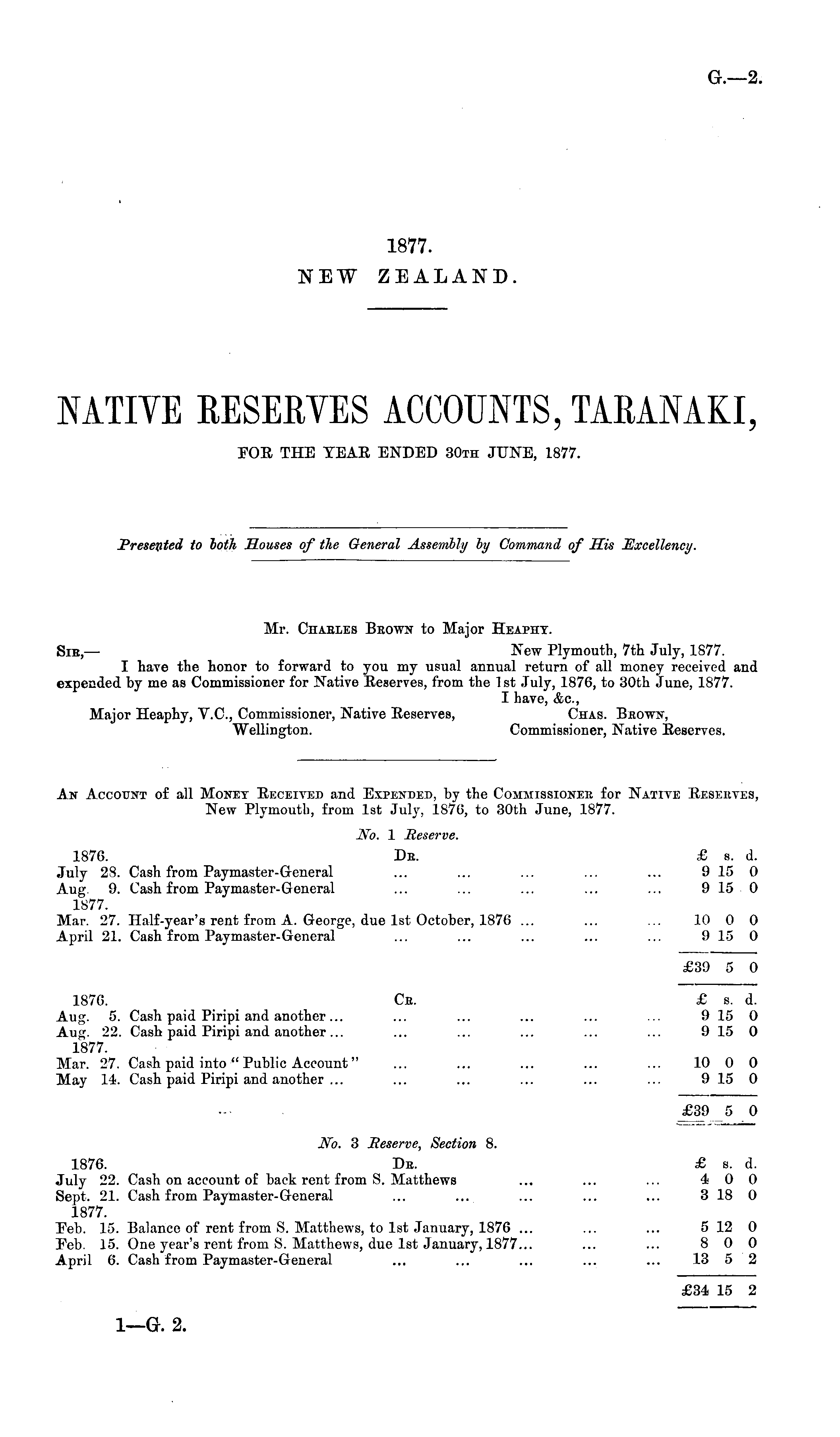 Presented to botJi Souses of the General Assembly by Command of His Excellency. Mr. Chaeles Beown to Major Heaphy. Sib,— New Plymouth, 7th July, 1877. I have the honor to forward to you my usual annual return of all money received and expended by me as Commissioner for Native Eeserves, from the 1st July, 1876, to 30th June, 1877. I have, &c, Major Heaphy, V.C., Commissioner, Native Reserves, Chas. Beown, Wellington. Commissioner, Native Eeserves. An Account of all Monet Received and Expended, by the Commissioner for Native Eeseuves, New Plymouth, from 1st July, 1876, to 30th June, 1877. JVo. 1 Reserve. 1876. De. £ s. d. July 28. Cash from Paymaster-General ... ... ... ... ... 9 15 0 Aug. 9. Cash from Paymaster-General ... ... ... ... ... 9 15 0 1877. Mar. 27. Half-year's rent from A. George, due 1st October, 1876 ... ... ... 10 0 0 April 21. Cash from Paymaster-General ... ... ... ... ... 9 15 0 £39 5 0 1876. Ce. £ s. d. Aug. 5. Cash paid Piripi and another... ... ... ... ... ... 9 15 0 Aug. 22. Cash paid Piripi and another... ... ... ... ... ... 9 15 0 1877. Mar. 27. Cash paid into" Public Account" ... ... ... ... ... 10 0 0 May 14. Cash paid Piripi and another ... ... ... ... ... ... 9 15 0 _£39_5 0 No. 3 Reserve, Section 8. 1876. De. £ s. d. July 22. Cash on account of back rent from S. Matthews ... ... ... 400 Sept. 21. Cash from Paymaster-General ... ... ... ... ... 3 18 0 1877. Feb. 15. Balance of rent from S. Matthews, to 1st January, 1876 ... ... ... 5 12 0 Feb. 15. One year's rent from S. Matthews, due 1st January, 1877... ... ... 8 0 0 April G. Cash from Paymaster-General ... ... ... ... ... 13 5 2 £34 15 2 1—G. 2.