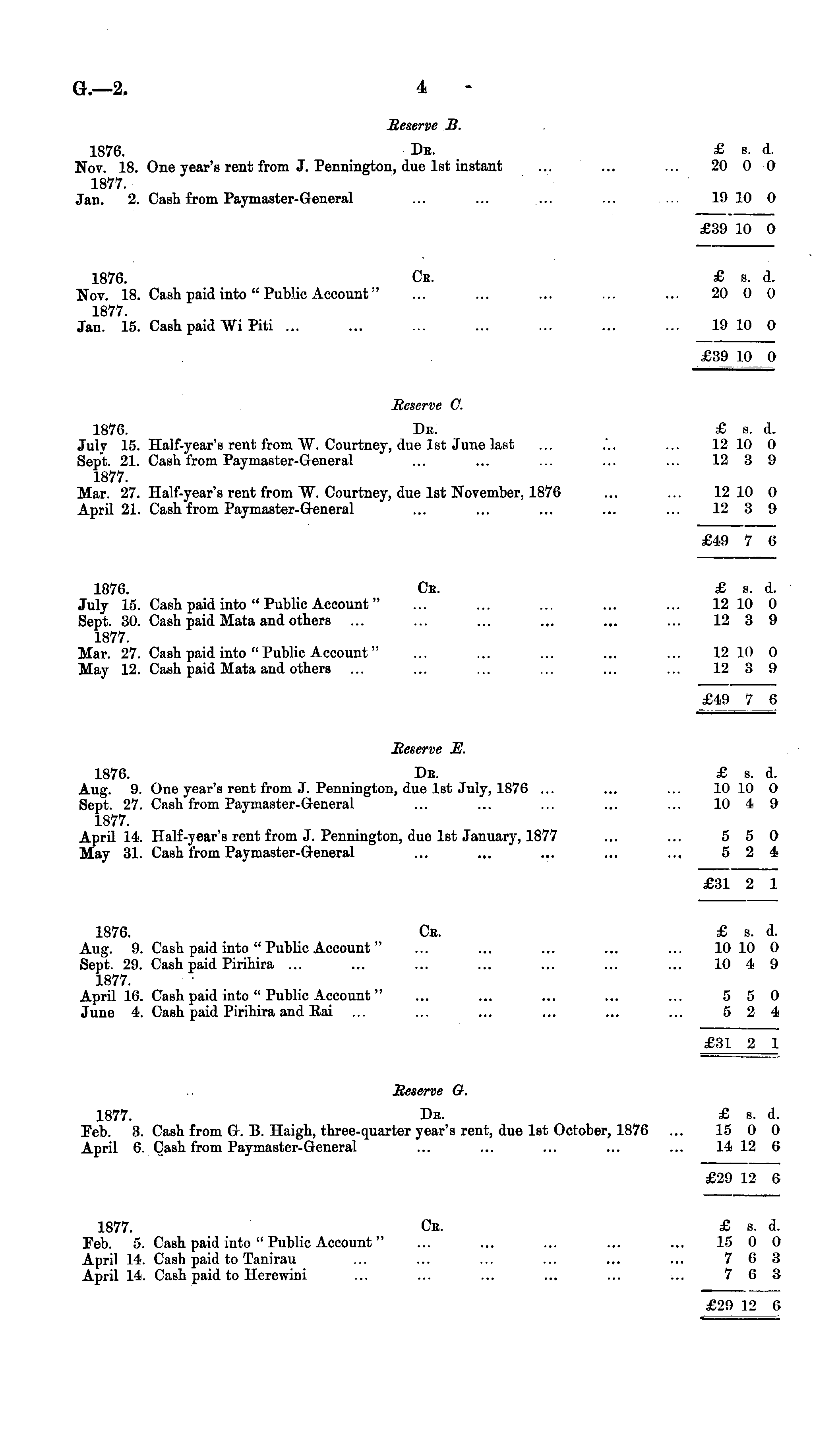 1876. De- £ s. d. Nov. 18. One year's rent from J. Pennington, due Ist instant ... ... ... 20 0 0 1877. Jan. 2. Cash from Paymaster-General ... ... ... ... .... 10 10 0 £39 10 0 1876. Ce. £ s. d. Nov. 18. Cash paid into " Public Account" ... ... ... ... ... 20 0 0 1877. Jan. 15. Cash paid Wi Piti ... ... ... ... ... ... ... 19 10 0 £39 10 0 Reserve 0. 1876. Db. £ s. d. July 15. Half-year's rent from "W. Courtney, due Ist June last ... .'.. ... 12 10 0 Sept. 21. Cash from Paymaster-General ... ... ... ... ... 12 3 9 1877. Mar. 27. Half-year's rent from "W. Courtney, due Ist November, 1876 ... ... 12 10 0 April 21. Cash from Paymaster-General ... ... ... ... ... 12 3 9 £49 7 6 1876. Ce. £ s. d. July 15. Cash paid into " Public Account" ... ... ... ... ... 12 10 0 Sept. 30. Cash paid Mata and others ... ... ... ... ... ... 12 3 9 1877. Mar. 27. Cash paid into " Public Account" ... ... ... ... ... 12 10 0 May 12. Cash paid Mata and others ... ... ... ... ... ... 12 3 9 £49 7 6 Reserve E. 1876. Dr. £ s. d. Aug. 9. One year's rent from J. Pennington, due Ist July, 1876 ... ... ... 10 10 0 Sept. 27. Cash from Paymaster-General ... ... ... ... ... 10 4 9 1877. April 14. Half-year's rent from J. Pennington, due Ist January, 1877 ... ... 5 5 0 May 31. Cash from Paymaster-General ... ... ... ... ... 5 2 4 £31 2 1 1876. Ce. £ s. d. Aug. 9. Cash paid into" Public Account" ... ... ... ... ... 10 10 0 Sept. 29. Cash paid Pirihira ... ... ... ... ... ... ... 10 4 9 1877. April 16. Cash paid into " Public Account" ... ... ... ... ... 5 5 0 June 4. Cash paid Pirihira and Eai ... ... ... ... ... ... 5 2 4 £31 2 1 Reserve O. 1877. Dk. £ s. d. Feb. 3. Cash from G. B. Haigh, three-quarter year's rent, due Ist October, 1876 ... 15 0 0 April 6. Cash from Paymaster-General ... ... ... ... ... 14 12 6 £29 12 6 1877. Ce. £ s. d. Feb. 5. Cash paid into " Public Account" ... ... ... ... ... 15 0 0 April 14. Cash paid to Tanirau ... ... ... ... ... ... 7 6 3 April 14. Cash paid to Herewini ... ... ... ... ... ... 7 6 3 £29 12 6