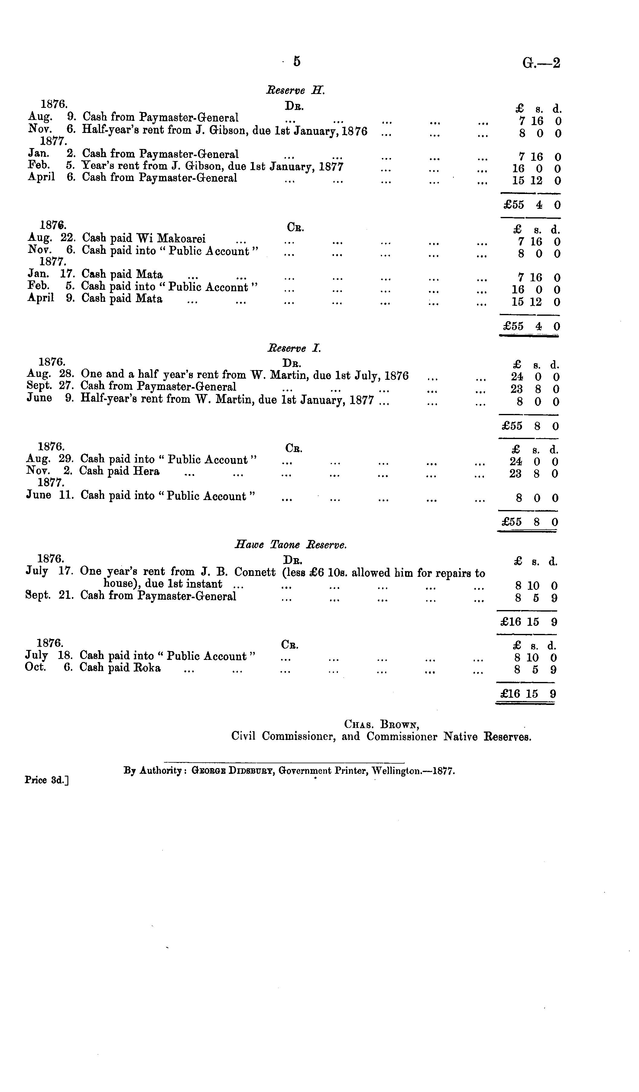 Reserve H. 1876- Db. £ s . d. Aug. 9. Cash from Paymaster-General ... ... ... ... 716 0 Nov. 6. Half-year's rent from J. G-ibson, due Ist January, 1876 8 0 0 1877. Jan. 2. Cash from Paymaster-General ... ... ... ... ... 716 0 Feb. 5. Year's rent from J. Gribson, due Ist January, 1877 ... ... ... 16 0 0 April 6. Cash from Paymaster-General ... ... ... ... ... 15 12 0 £55 4 0 1876. Cb. £ 8 d Aug. 22. Cash paid Wi Makoarei ... ... ... ... ... ... 7 16 0 Nov. 6. Cash paid into " Public Account" ... ... 8 0 0 1877. Jan. 17. Cash paid Mata ... ... ... ... ... ... ... 716 0 Feb. 5. Cash paid into " Public Acconnt" ... ... ... ... ... 16 0 0 April 9. Cash paid Mata ... ... ... ... ... ... 15 \i o £55 4 0 Reserve I. 1876. Dk. £ s. d. Aug. 28. One and a half year's rent from W. Martin, due Ist July, 1876 ... ... 24 0 0 Sept. 27. Cash from Paymaster-General ... ... ... ... 23 8 0 June 9. Half-year's rent from W. Martin, due Ist January, 1877 ... ... 8 0 0 £55 8 0 1876. Cb. £ s. d. Aug. 29. Cash paid into " Public Account" ... ... ... ... ... 24 0 0 Nov. 2. Cash paid Hera ... 23 8 0 1877. June 11. Cash paid into " Public Account" ... ... ... ... ... 8 0 0 £55 8 0 Jlawe Taone Reserve. 1876. De. £ s. d. July 17. One year's rent from J. B. Connett (less £6 10s. allowed him for repairs to house), due Ist instant ... ... ... ... ... ... 8 10 0 Sept. 21. Cash from Paymaster-General ... ... ... ... ... 8 5 9 £16 15 9 1876. Cb. £ s. d. July 18. Cash paid into " Public Account" ... ... ... ... ... 8 10 0 Oct. 6. Cash paid Eoka ... ... ... ... ... ... ... 8 5 9 £16 15 9 Chas. Brown, Civil Commissioner, and Commissioner Native Reserves.