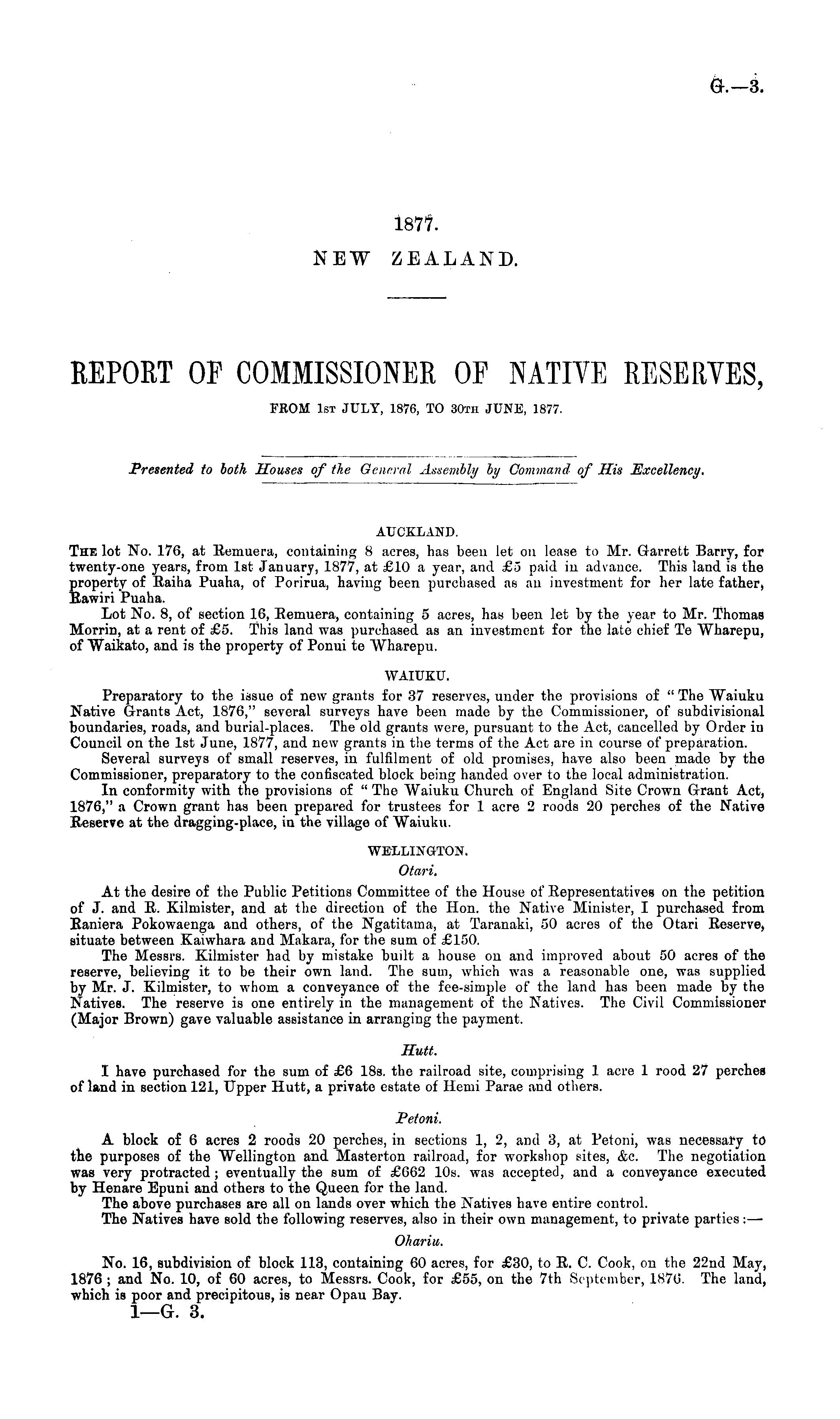 Presented to both Houses of the General Assembly by Command of His Excellency, AUCKLAND. The lot No. 176, at Eemuera, containing 8 acres, has been let on lease to Mr. Garrett Barry, for twenty-one years, from Ist January, 1877, at £10 a year, and £5 paid in advance. This land is the property of Eaiha Puaha, of Porirua, having been purchased as an investment for her late father, Eawiri Puaha. Lot No. 8, of section 16, Eemuera, containing 5 acres, has been let by the year to Mr. Thomas Morrin, at a rent of £5. This land was purchased as an investment for the late chief Te Wharepu, of Waikato, and is the property of Ponui te Wharepu. WAIUKU. Preparatory to the issue of new grants for 37 reserves, under the provisions of " The Waiuku Native Grants Act, 1876," several surveys have been made by the Commissioner, of subdivisional boundaries, roads, and burial-places. The old grants were, pursuant to the Act, cancelled by Order in Council on the Ist June, 1877, and new grants in the terms of the Act are in course of preparation. Several surveys of small reserves, in fulfilment of old promises, have also been made by the Commissioner, preparatory to the confiscated block being handed over to the local administration. In conformity with the provisions of " The Waiuku Church of England Site Crown Grant Act, 1876," a Crown grant has been prepared for trustees for 1 acre 2 roods 20 perches of the Native Eeserve at the dragging-place, in the village of Waiuku. WELLINGTON. Otari. At the desire of the Public Petitions Committee of the House of Eepresentatives on the petition of J. and E. Kilmister, and at the direction of the Hon. the Native Minister, I purchased from Eaniera Pokowaenga aud others, of the Ngatitama, at Taranaki, 50 acres of the Otari Eeserve, situate between Kaiwhara and Makara, for the sum of £150. The Messrs. Kilmister had by mistake built a house on and improved about 50 acres of the reserve, believing it to be their own land. The sum, which was a reasonable one, was supplied by Mr. J. Kilmister, to whom a conveyance of the fee-simple of the land has been made by the Natives. The reserve is one entirely in the management of the Natives. The Civil Commissioner (Major Brown) gave valuable assistance in arranging the payment. Hutt. I have purchased for the sum of £6 18s. the railroad site, comprising 1 acre 1 rood 27 perches of land in section 121, Upper Hutt, a private estate of Hemi Parae and others. Petoni. A block of 6 acres 2 roods 20 perches, in sections 1, 2, and 3, at Petoni, was necessary to the purposes of the Wellington and Masterton railroad, for workshop sites, &c. The negotiation was very protracted ; eventually the sum of £662 10s. was accepted, and a conveyance executed by Henare Epuni and others to the Queen for the land. The above purchases are all on lands over which the Natives have entire control. The Natives have sold the following reserves, also in their own management, to private parties:— Ohariu. No. 16, subdivision of block 113, containing 60 acres, for £30, to E. C. Cook, on the 22nd May, 1876 ; and No. 10, of 60 acres, to Messrs. Cook, for £55, on the 7th September, 1870. The land, which is poor and precipitous, is near Opau Bay. I—G. 3.