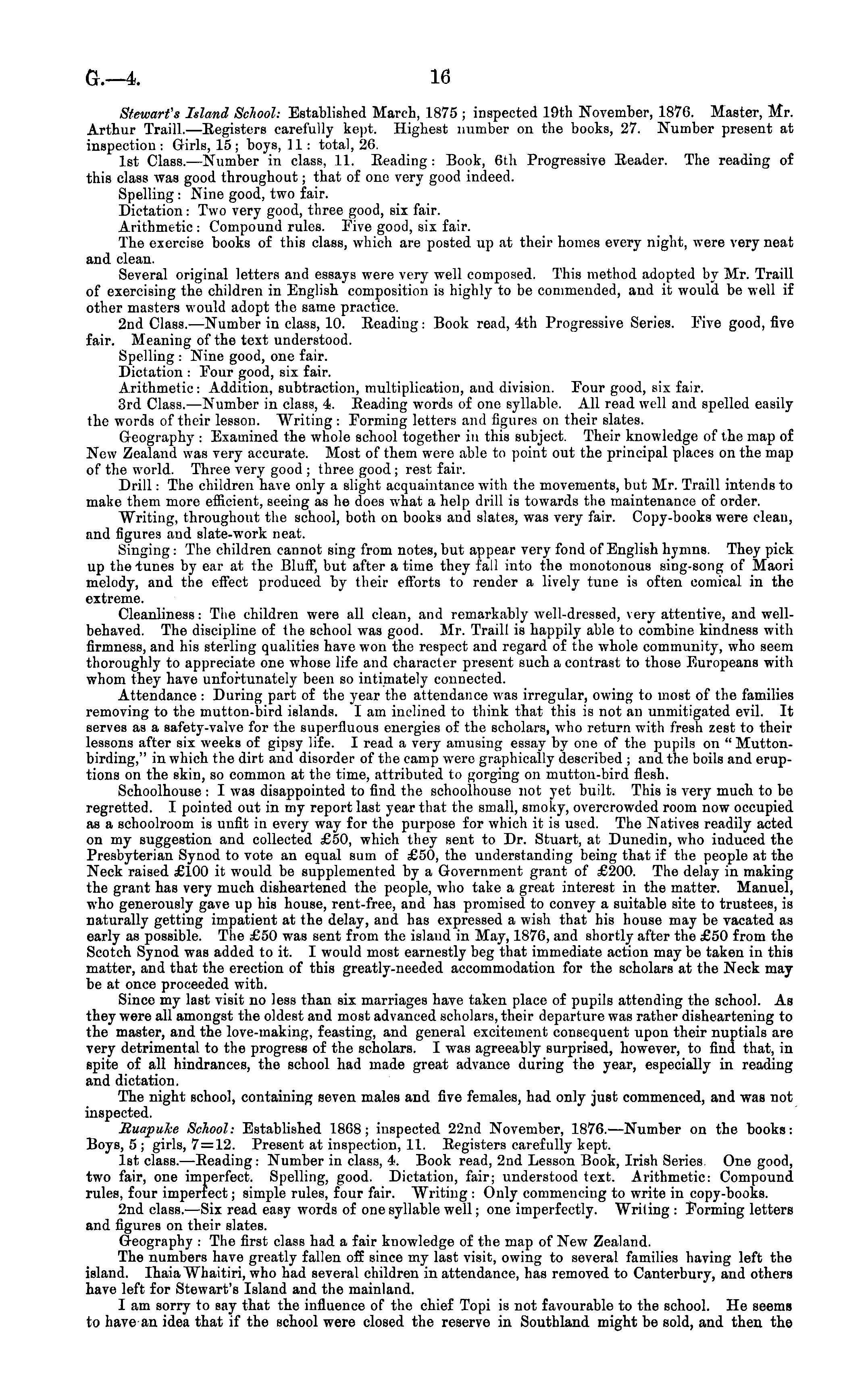 Stewart's Island ScJiooh Established March, 1875 ; inspected 19th November, 187 G. Master, Mr. Arthur Traill.—Registers carefully kept. Highest number on the books, 27. Number present at inspection: Girls, 15; boys, 11: total, 26. Ist Class.—Number in class, 11. Beading: Book, 6th Progressive Reader. The reading of this class was good throughout; that of one very good indeed. Spelling: Nine good, two fair. Dictation: Two very good, three good, six fair. Arithmetic : Compound rules. Five good, six fair. The exercise books of this class, which are posted up at their homes every night, were very neat and clean. Several original letters and essays were very well composed. This method adopted by Mr. Traill of exercising the children in English composition is highly to be commended, and it would be well if other masters would adopt the same practice. 2nd Class. —Number in class, 10. Reading: Book read, 4th Progressive Series. Five good, five fair. Meaning of the text understood. Spelling : Nine good, one fair. Dictation : Four good, six fair. Arithmetic: Addition, subtraction, multiplication, and division. Four good, six fair. 3rd Class. —Number in class, 4. Reading words of one syllable. All read well and spelled easily the words of their lesson. Writing: Forming letters and figures on their slates. Geography : Examined the whole school together in this subject. Their knowledge of the map of New Zealand was very accurate. Most of them were able to point out the principal places on the map of the world. Three very good ; three good ; rest fair. Drill: The children have only a slight acquaintance with the movements, but Mr. Traill intends to make them more efficient, seeing as he does what a help drill is towards the maintenance of order. Writing, throughout the school, both on books and slates, was very fair. Copy-books were clean, and figures and slate-work neat. Singing : The children cannot sing from notes, but appear very fond of English hymns. They pick up the-tunes by ear at the Bluff, but after a time they fall into the monotonous sing-song of Maori melody, and the effect produced by their efforts to render a lively tune is often comical in the extreme. Cleanliness: The children were all clean, and remarkably well-dressed, very attentive, and wellbehaved. The discipline of the school was good. Mr. Traill is happily able to combine kindness with firmness, and his sterling qualities have won the respect and regard of the whole community, who seem thoroughly to appreciate one whose life and character present such a contrast to those Europeans with whom they have unfortunately been so intimately connected. Attendance : During part of the year the attendance was irregular, owing to most of the families removing to the mutton-bird islands. lam inclined to think that this is not an unmitigated evil. It serves as a safety-valve for the superfluous energies of the scholars, who return with fresh zest to their lessons after six weeks of gipsy life. I read a very amusing essay by one of the pupils on " Muttonbirding," in which the dirt and disorder of the camp were graphically described ; and the boils and eruptions on the skin, so common at the time, attributed to gorging on mutton-bird flesh. Schoolhouse : I was disappointed to find the schoolhouse not yet built. This is very much to be regretted. I pointed out in my report last year that the small, smoky, overcrowded room now occupied as a schoolroom is unfit in every way for the purpose for which it is used. The Natives readily acted on my suggestion and collected £50, which they sent to Dr. Stuart, at Dunedin, who induced the Presbyterian Synod to vote an equal sum of £50, the understanding being that if the people at the Neck raised £100 it would be supplemented by a Government grant of £200. The delay in making the grant has very much disheartened the people, who take a great interest in the matter. Manuel, who generously gave up his house, rent-free, and has promised to convey a suitable site to trustees, is naturally getting impatient at the delay, and has expressed a wish that his house may be vacated as early as possible. The £50 was sent from the island in May, 1876, and shortly after the £50 from the Scotch Synod was added to it. I would most earnestly beg that immediate action may be taken in this matter, and that the erection of this greatly-needed accommodation for the scholars at the Neck may be at once proceeded with. Since my last visit no less than six marriages have taken place of pupils attending the school. As they were all amongst the oldest and most advanced scholars, their departure was rather disheartening to the master, and the love-making, feasting, and general excitement consequent upon their nuptials are very detrimental to the progress of the scholars. I was agreeably surprised, however, to find that, in spite of all hindrances, the school had made great advance during the year, especially in reading and dictation. The night school, containing seven males and five females, had only just commenced, and was not inspected. Huapuke School: Established 18G8; inspected 22nd November, 1876.—Number on the books: Boys, 5 ; girls, 7 = 12. Present at inspection, 11. Registers carefully kept. Ist class. —Reading: Number in class, 4. Book read, 2nd Lesson Book, Irish Series One good, two fair, one imperfect. Spelling, good. Dictation, fair; understood text. Arithmetic: Compound rules, four imperfect; simple rules, four fair. Writing : Only commencing to write in copy-books. 2nd class. —Six read easy words of one syllable well; one imperfectly. Writing : Forming letters and figures on their slates. Geography : The first class had a fair knowledge of the map of New Zealand. The numbers have greatly fallen off since my last visit, owing to several families having left the island. Ihaia Whaitiri, who had several children in attendance, has removed to Canterbury, and others have left for Stewart's Island and the m