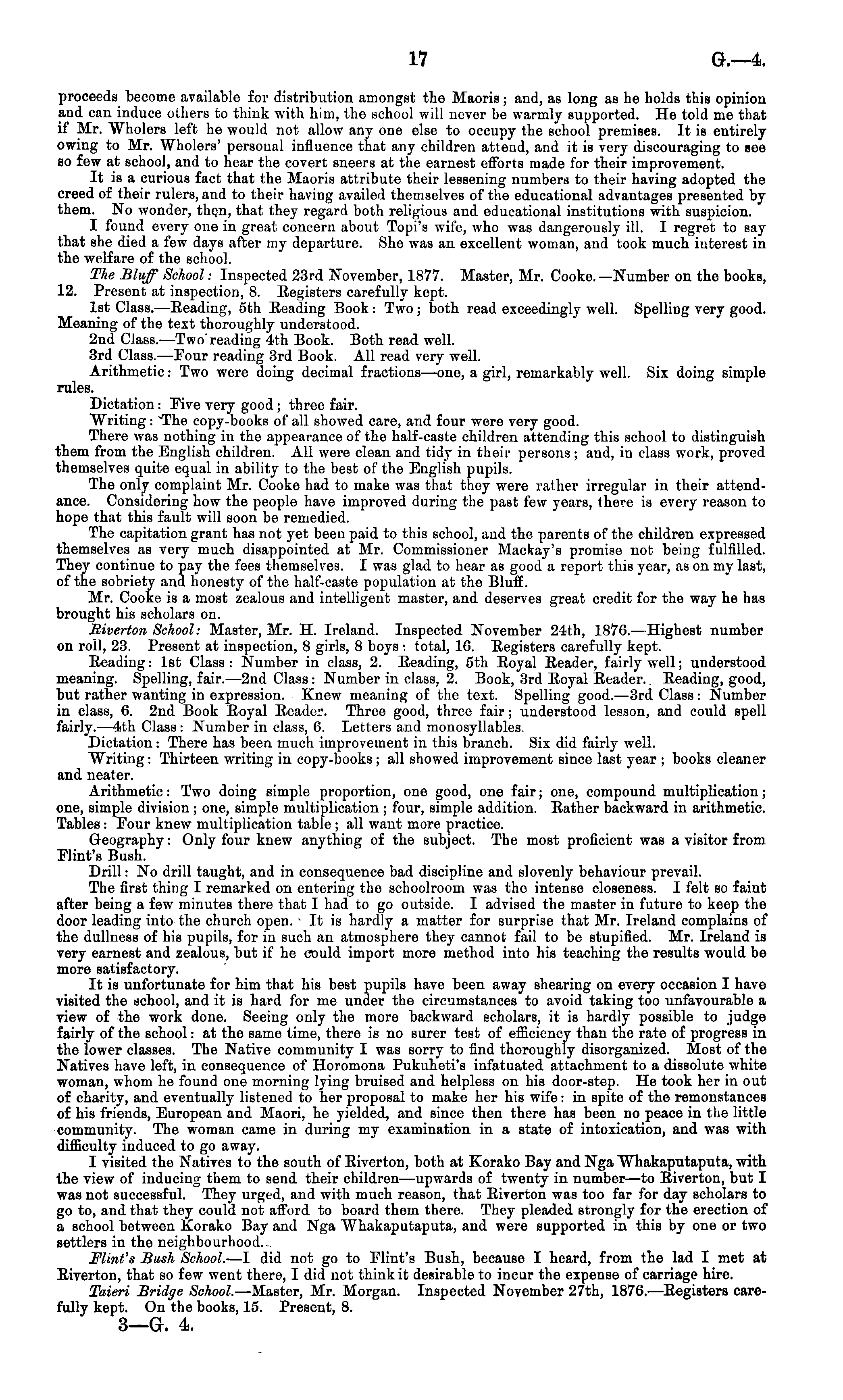 proceeds become available for distribution amongst the Maoris; and, as long as he holds this opinion aud can induce others to think with him, the school will never be warmly supported. He told me that if Mr. Wholers left he would not allow any one else to occupy the school premises. It is entirely owing to Mr. Wholers' personal influence that any children attend, and it is very discouraging to see so few at school, and to hear the covert sneers at the earnest efforts made for their improvement. It is a curious fact that the Maoris attribute their lessening numbers to their having adopted the creed of their rulers, and to their having availed themselves of the educational advantages presented by them. No wonder, then, that they regard both religious and educational institutions with suspicion. I found every one in great concern about Topi's wife, who was dangerously ill. I regret to say that she died a few days after my departure. She was an excellent woman, and took much interest in the welfare of the school. The Bluff School: Inspected 23rd November, 1877. Master, Mr. Cooke. —Number on the books, 12. Present at inspection, 8. Registers carefully kept. Ist Class.—Reading, sth Reading Book : Two; both read exceedingly well. Spelling very good. Meaning of the text thoroughly understood. 2nd Class.—Two'reading 4th Book. Both read well. 3rd Class. —Four reading 3rd Book. All read very well. Arithmetic: Two were doing decimal fractions—one, a girl, remarkably well. Six doing simple rules. Dictation: Five very good; three fair. Writing: The copy-books of all showed care, and four were very good. There was nothing in the appearance of the half-caste children attending this school to distinguish them from the English children. All were clean and tidy in their persons; and, in class work, proved themselves quite equal in ability to the best of the English pupils. The only complaint Mr. Cooke had to make was that they were rather irregular in their attendance. Considering how the people have improved during the past few years, there is every reason to hope that this fault will soon be remedied. The capitation grant has not yet been paid to this school, and the parents of the children expressed themselves as very much disappointed at Mr. Commissioner Mackay's promise not being fulfilled. They continue to pay the fees themselves. I was glad to hear as good a report this year, as on my last, of the sobriety and honesty of the half-caste population at the Bluff. Mr. Cooke is a most zealous and intelligent master, and deserves great credit for the way he has brought his scholars on. Riverton School: Master, Mr. H. Ireland. Inspected November 24th, 1876. —Highest number on roll, 23. Present at inspection, 8 girls, 8 boys: total, 16. Registers carefully kept. Reading: Ist Class : Number in class, 2. Reading, sth Royal Reader, fairly well; understood meaning. Spelling, fair.—2nd Class : Number in class, 2. Book, 3rd Royal Reader. Reading, good, but rather wanting in expression. Knew meaning of the text. Spelling good. —3rd Class: Number in class, 6. 2nd Book Royal Reader. Three good, three fair; understood lesson, and could spell fairly. —4th Class : Number in class, 6. Letters and monosyllables. Dictation : There has been much improvement in this branch. Six did fairly well. Writing : Thirteen writing in copy-books ; all showed improvement since last year ; books cleaner and neater. Arithmetic: Two doing simple proportion, one good, one fair; one, compound multiplication; one, simple division ; one, simple multiplication ; four, simple addition. Rather backward in arithmetic. Tables : Four knew multiplication table ; all want more practice. Geography: Only four knew anything of the subject. The most proficient was a visitor from Flint's Bush. Drill: No drill taught, and in consequence bad discipline and slovenly behaviour prevail. The first thing I remarked on entering the schoolroom was the intense closeness. I felt so faint after being a few minutes there that I had to go outside. I advised the master in future to keep the door leading into the church open. ■ It is hardly a matter for surprise that Mr. Ireland complains of the dullness of his pupils, for in such an atmosphere they cannot fail to be stupified. Mr. Ireland is very earnest and zealous, but if he could import more method into his teaching the results would be more satisfactory. It is unfortunate for him that his best pupils have been away shearing on every occasion I have visited the school, and it is hard for me under the circumstances to avoid taking too unfavourable a view of the work done. Seeing only the more backward scholars, it is hardly possible to judge fairly of the school: at the same time, there is no surer test of efficiency than the rate of progress in the lower classes. The Native community I was sorry to find thoroughly disorganized. Most of the Natives have left, in consequence of Horomona Pukuheti's infatuated attachment to a dissolute white woman, whom he found one morning lying bruised and helpless on his door-step. He took her in out of charity, and eventually listened to her proposal to make her his wife: in spite of the remonstances of his friends, European and Maori, he yielded, and since then there has been no peace in the little community. The woman came in during my examination in a state of intoxication, and was with difficulty induced to go away. I visited the Natives to the south of Riverton, both at Korako Bay and Nga Whakaputaputa, with the view of inducing them to send their children —upwards of twenty in number —to Riverton, but I was not successful. They urged, and with much reason, that Riverton was too far for day scholars to go to, and that they could not afford to board them there. They pleaded strongly for the erection of a school between Korako Bay and Nga Whakaputaputa, and were supported in this by one or two settlers in the neighbourhood. Flint's Bush School. —l did not