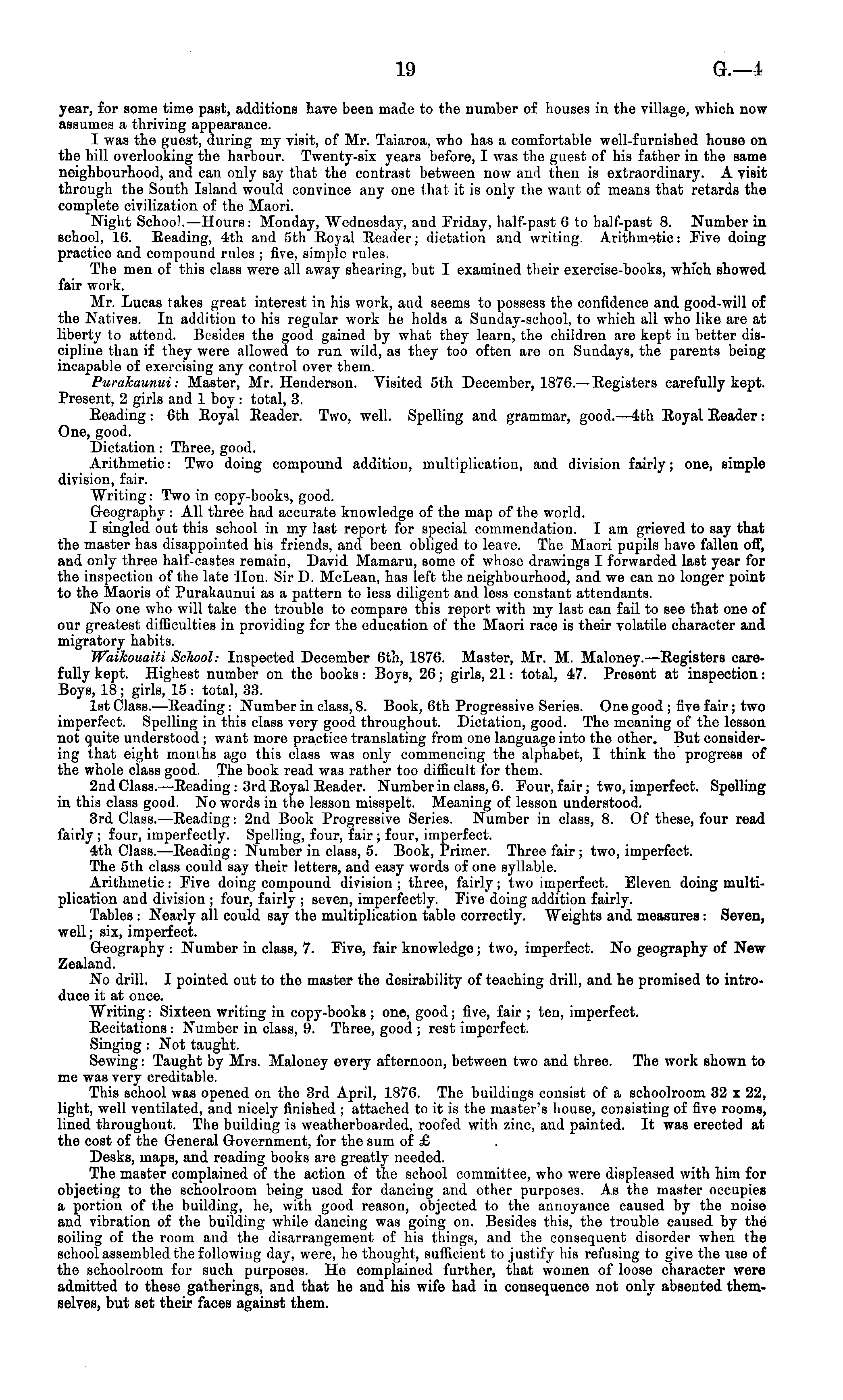 year, for some time past, additions have been made to the number of houses in the village, which now assumes a thriving appearance. I was the guest, during my visit, of Mr. Taiaroa, who has a comfortable well-furnished house on the hill overlooking the harbour. Twenty-six years before, I was the guest of his father in the same neighbourhood, and can only say that the contrast between now and then is extraordinary. A visit through the South Island would convince any one that it is only the want of means that retards the complete civilization of the Maori. Night School.—Hours: Monday, Wednesday, and Friday, half-past 6to half-past 8. Number in school, 16. Reading, 4th and sth Royal Reader; dictation and writing. Arithmetic: Five doing practice and compound rules ; five, simple rules. The men of this class were all away shearing, but I examined their exercise-books, which showed fair work. Mr. Lucas takes great interest in his work, aud seems to possess the confidence and good-will of the Natives. In addition to his regular work he holds a Sunday-school, to which all who like are at liberty to attend. Besides the good gained by what they learn, the children are kept in better discipline than if they were allowed to run wild, as they too often are on Sundays, the parents being incapable of exercising any control over them. Purakaunui: Master, Mr. Henderson. Visited sth December, 1876. — Registers carefully kept. Present, 2 girls and 1 boy: total, 3. Reading: 6th Royal Reader. Two, well. Spelling and grammar, good.—4th Royal Reader: One, good. Dictation: Three, good. Arithmetic: Two doing compound addition, multiplication, and division fairly; one, simple division, fair. Writing: Two in copy-books, good. Geography : All three had accurate knowledge of the map of the world. I singled out this school in my last report for special commendation. I am grieved to say that the master has disappointed his friends, and been obliged to leave. The Maori pupils have fallen off, and only three half-castes remain, David Mamaru, some of whose drawings I forwarded last year for the inspection of the late Hon. Sir D. McLean, has left the neighbourhood, and we can no longer point to the Maoris of Purakaunui as a pattern to less diligent and less constant attendants. No one who will take the trouble to compare this report with my last can fail to see that one of our greatest difficulties in providing for the education of the Maori race is their volatile character and migratory habits. Waikouaiti School: Inspected December 6th, 1876. Master, Mr. M. Maloney. —Registers carefully kept. Highest number on the books : Boys, 26; girls, 21: total, 47. Present at inspection: Boys, 18 ; girls, 15 : total, 33. Ist Class.—Reading : Number in class, 8. Book, 6th Progressive Series. One good ; five fair ; two imperfect. Spelling in this class very good throughout. Dictation, good. The meaning of the lesson not quite understood ; want more practice translating from one language into the other. But considering that eight months ago this class was only commencing the alphabet, I think the progress of the whole class good. The book read was rather too difficult for them. 2nd Class. —Reading : 3rd Royal Reader. Number in class, 6. Four, fair; two, imperfect. Spelling in this class good. No words in the lesson misspelt. Meaning of lesson understood. 3rd Class.—Reading: 2nd Book Progressive Series. Number in class, 8. Of these, four read fairly; four, imperfectly. Spelling, four, fair; four, imperfect. 4th Class. —Reading : Number in class, 5. Book, Primer. Three fair ; two, imperfect. The sth class could say their letters, and easy words of one syllable. Arithmetic : Five doing compound division ; three, fairly; tw ro imperfect. Eleven doing multiplication and division ; four, fairly ; seven, imperfectly. Five doing addition fairly. Tables : Nearly all could say the multiplication table correctly. Weights and measures: Seven, well; six, imperfect. Geography : Number in class, 7. Five, fair knowledge; two, imperfect. No geography of New Zealand. No drill. I pointed out to the master the desirability of teaching drill, and he promised to introduce it at once. Writing: Sixteen writing in copy-books ; one, good; five, fair ; ten, imperfect. Recitations : Number in class, 9. Three, good ; rest imperfect. Singing : Not taught. Sewing: Taught by Mrs. Maloney every afternoon, between two and three. The work shown to me was very creditable. This school was opened on the 3rd April, 1876. The buildings consist of a schoolroom 32 x 22, light, well ventilated, and nicely finished ; attached to it is the master's house, consisting of five rooms, lined throughout. The building is weatherboarded, roofed with zinc, and painted. It was erected at the cost of the General Government, for the sum of £ Desks, maps, and reading books are greatly needed. The master complained of the action of the school committee, who were displeased with him for objecting to the schoolroom being used for dancing and other purposes. As the master occupies a portion of the building, he, with good reason, objected to the annoyance caused by the noise and vibration of the building while dancing was going on. Besides this, the trouble caused by the soiling of the room aud the disarrangement of his things, and the consequent disorder when the school assembled the following day, were, he thought, sufficient to justify his refusing to give the use of the schoolroom for such purposes. He complained further, that women of loose character were admitted to these gatherings, and that he and his wife had in consequence not only absented themselves, but set their faces against them.