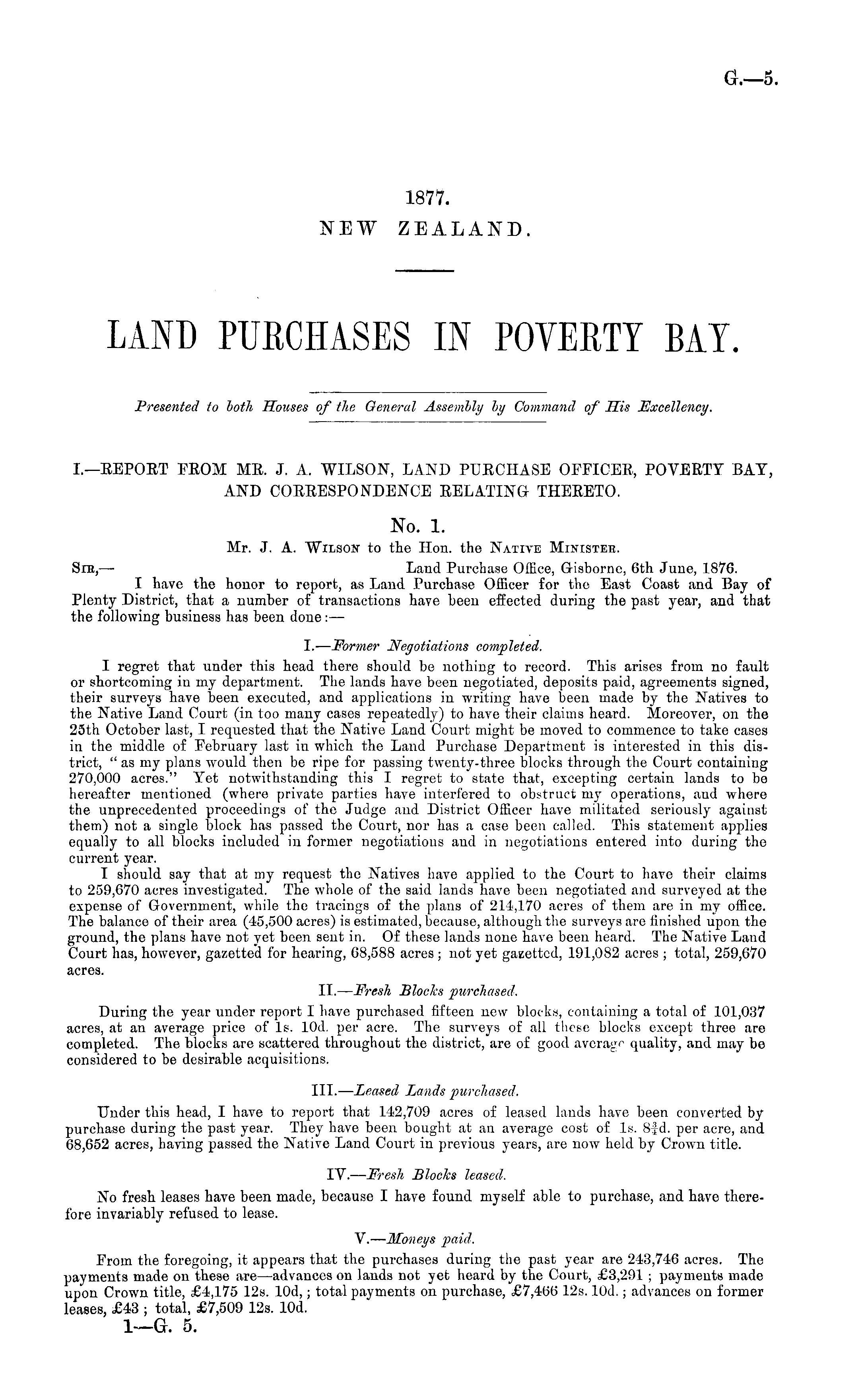 I.— EEPOET FEOM ME. J. A. WILSON, LAND PUECHASE OFFICES, POVERTY BAT, AND COEEESPONDENCE RELATING THEEETO. No. 1. Mr. J. A. Wilson to tie Hon. the Native Ministeb. Sib, — Land Purchase Office, Gisborne, 6th June, 1876. I have the honor to report, as Land Purchase Officer for the East Coast and Bay of Plenty District, that a number of transactions have been effected during the past year, and that the following business has been done: — I.— Former Negotiations completed. I regret that under this head there should be nothing to record. This arises from no fault or shortcoming in my department. The lands have been negotiated, deposits paid, agreements signed, their surveys have been executed, and applications in writing have been made by the Natives to the Native Land Court (in too many cases repeatedly) to have their claims heard. Moreover, on the 25th October last, I requested that the Native Land Court might be moved to commence to take cases in the middle of February last in which the Land Purchase Department is interested in this district, " as my plans would then be ripe for passing twenty-three blocks through the Court containing 270,000 acres." Tet notwithstanding this I regret to state that, excepting certain lands to be hereafter mentioned (where private parties have interfered to obstruct my operations, and where the unprecedented proceedings of the Judge and District Officer have militated seriously against them) not a single block has passed the Court, nor has a case been called. This statement applies equally to all blocks included in former negotiations and in negotiations entered into during the current year. I should say that at my request the Natives have applied to the Court to have their claims to 259,670 acres investigated. The whole of the said lands have been negotiated and surveyed at the expense of Government, while the tracings of the plans of 214,170 acres of them are in my office. The balance of their area (45,500 acres) is estimated, because, although the surveys are finished upon the ground, the plans have not yet been sent in. Of these lands none have been heard. The Native Laud Court has, however, gazetted for hearing, 68,588 acres; not yet gaeetted, 191,082 acres ; total, 259,670 acres. ll.— Fresh Blocks purchased. During the year under report I have purchased fifteen new blocks, containing a total of 101,037 acres, at an average price of Is. lOd. per acre. The surveys of all these blocks except three are completed. The blocks are scattered throughout the district, are of good average quality, and may be considered to be desirable acquisitions. 111. — Leased Lands purchased. Under this head, I have to report that 142,709 acres of leased lands have been converted by purchase during the past year. They have been bought at an average cost of Is. 8f d. per acre, and 68,652 acres, having passed the Native Land Court in previous years, are now held by Crown title. IV. — Fresh Slocks leased. No fresh leases have been made, because I have found myself able to purchase, and have therefore invariably refused to lease. V. — Moneys paid. From the foregoing, it appears that the purchases during the past year are 243,746 acres. The payments made on these are —advances on lands not yet heard by the Court, £3,291 ; payments made upon Crown title, £4,175 12s. 10d,; total payments on purchase, £7,466 12s. lOd.; advances on former leases, £43 j total, £7,509 12s. lOd. I—G. 5.