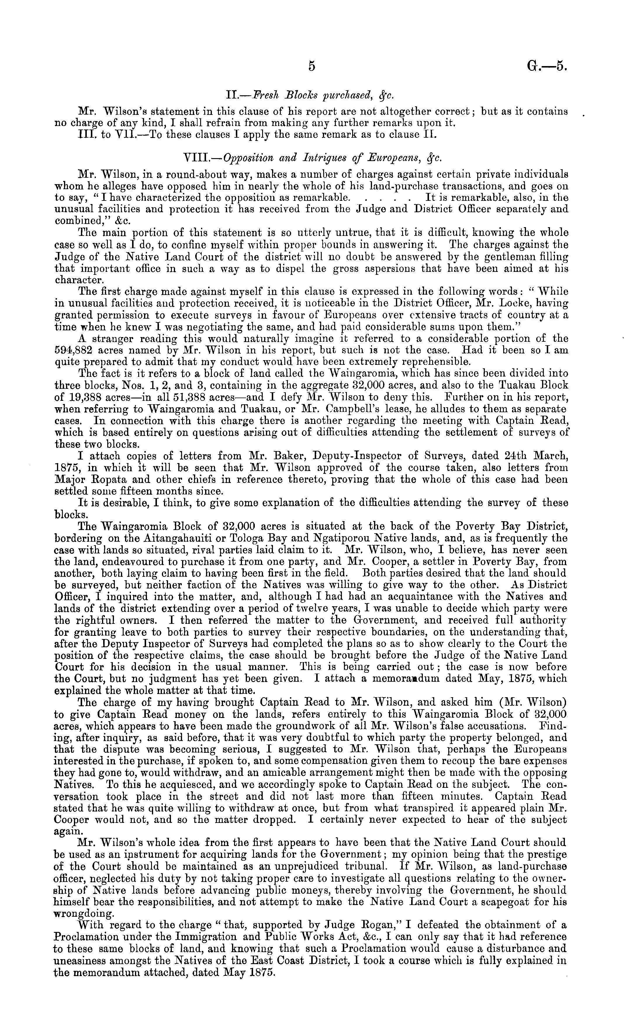 ll.— Fresh Slocks purchased, Sfc. Mr. Wilson's statement in this clause of his report are not altogether correct; but as it contains no charge of any kind, I shall refrain from making any further remarks upon it, 111, to VII. —To these clauses I apply the same remark as to clause 11. Vlll.— Opposition and Intrigues of Europeans, fyc. Mr. Wilson, in a round-about way, makes a number of charges against certain private individuals whom he alleges have opposed him in nearly the whole of his land-purchase transactions, and goes on to say, " I have characterized the opposition as remarkable It is remarkable, also, in the unusual facilities and protection it has received from the Judge and District Officer separately and combined," &c. The main portion of this statement is so utterly untrue, that it is difficult, knowing the whole case so well as I do, to confine myself within proper bounds in answering it. The charges against the Judge of the Native Land Court of the district will no doubt be answered by the gentleman filling that important office in such a way as to dispel the gross aspersions that have been aimed at his character. The first charge made against myself in this clause is expressed in the following words: " While in unusual facilities and protection received, it is noticeable in the District Officer, Mr. Locke, having granted permission to execute surveys in favour of Europeans over extensive tracts of country at a time when he knew I was negotiating the same, and had paid considerable sums upon them." A stranger reading this would naturally imagine it referred to a considerable portion of the 594,882 acres named by Mr. Wilson in his report, but such is not the case. Had it been so lam quite prepared to admit that my conduct would have been extremely reprehensible. The fact is it refers to a block of land called the Waingaromia, which has since been divided into three blocks, Nos. 1, 2, and 3, containing in the aggregate 32,000 acres, and also to the Tuakau Block of 19,388 acres —in all 51,388 acres —and I defy Mr. Wilson to deny this. Further on in his report, when referring to Waingaromia and Tuakau, or Mr. Campbell's lease, he alludes to them as separate cases. In connection with this charge there is another regarding the meeting with Captain Bead, which is based entirely on questions arising out of difficulties attending the settlement of surveys of these two blocks. I attach copies of letters from Mr. Baker, Deputy-Inspector of Surveys, dated 24th March, 1875, in which it will be seen that Mr. Wilson approved of the course taken, also letters from Major Bopata and other chiefs in reference thereto, proving that the whole of this case had been settled some fifteen months since. It is desirable, I think, to give some explanation of the difficulties attending the survey of these blocks. The Waingaromia Block of 32,000 acres is situated at the back of the Poverty Bay District, bordering on the Aitangahauiti or Tologa Bay and Ngatiporou Native lands, and, as is frequently the case with lands so situated, rival parties laid claim to it. Mr. Wilson, who, I believe, has never seen the land, endeavoured to purchase it from one party, and Mr. Cooper, a settler in Poverty Bay, from another, both laying claim to having been first in the field. Both parties desired that the land should be surveyed, but neither faction of the Natives was willing to give way to the other. As District Officer, I inquired into the matter, and, although I had had an acquaintance with the Natives and lands of the district extending over a period of twelve years, I was unable to decide which party were the rightful owners. I then referred the matter to the Government, and received full authority for granting leave to both parties to survey their respective boundaries, on the understanding that, after the Deputy Inspector of Surveys had completed the plans so as to show clearly to the Court the position of the respective claims, the case should be brought before the Judge of the Native Land Court for his decision in the usual manner. This is being carried out; the case is now before the Court, but no judgment has yet been given. I attach a memorandum dated May, 1875, which explained the whole matter at that time. The charge of my having brought Captain Eead to Mr. Wilson, and asked him (Mr. Wilson) to give Captain Eead money on the lands, refers entirely to this Waingaromia Block of 32,000 acres, which appears to have been made the groundwork of all Mr. Wilson's false accusations. Finding, after inquiry, as said before, that it was very doubtful to which party the property belonged, and that the dispute was becoming serious, I suggested to Mr. Wilson that, perhaps the Europeans interested in the purchase, if spoken to, and some compensation given them to recoup the bare expenses they had gone to, would withdraw, and an amicable arrangement might then be made with the opposing Natives. To this he acquiesced, and we accordingly spoke to Captain Eead on the subject. The conversation took place in the street and did not last more than fifteen minutes. Captain Eead stated that he was quite willing to withdraw at once, but from what transpired it appeared plain Mr. Cooper would not, and so the matter dropped. I certainly never expected to hear of the subject again. Mr. Wilson's whole idea from the first appears to have been that the Native Land Court should be used as an instrument for acquiring lands for the Government; my opinion being that the prestige of the Court should be maintained as an unprejudiced tribunal. If Mr. Wilson, as land-purchase officer, neglected his duty by not taking proper care to investigate all questions relating to the ownership of Native lands before advancing public moneys, thereby involving the Government, he should himself bear the responsibilities, and not attempt to make the Native Land Court a scapegoat for his wrongdoing. With regard to the charge " that, supported by Judg