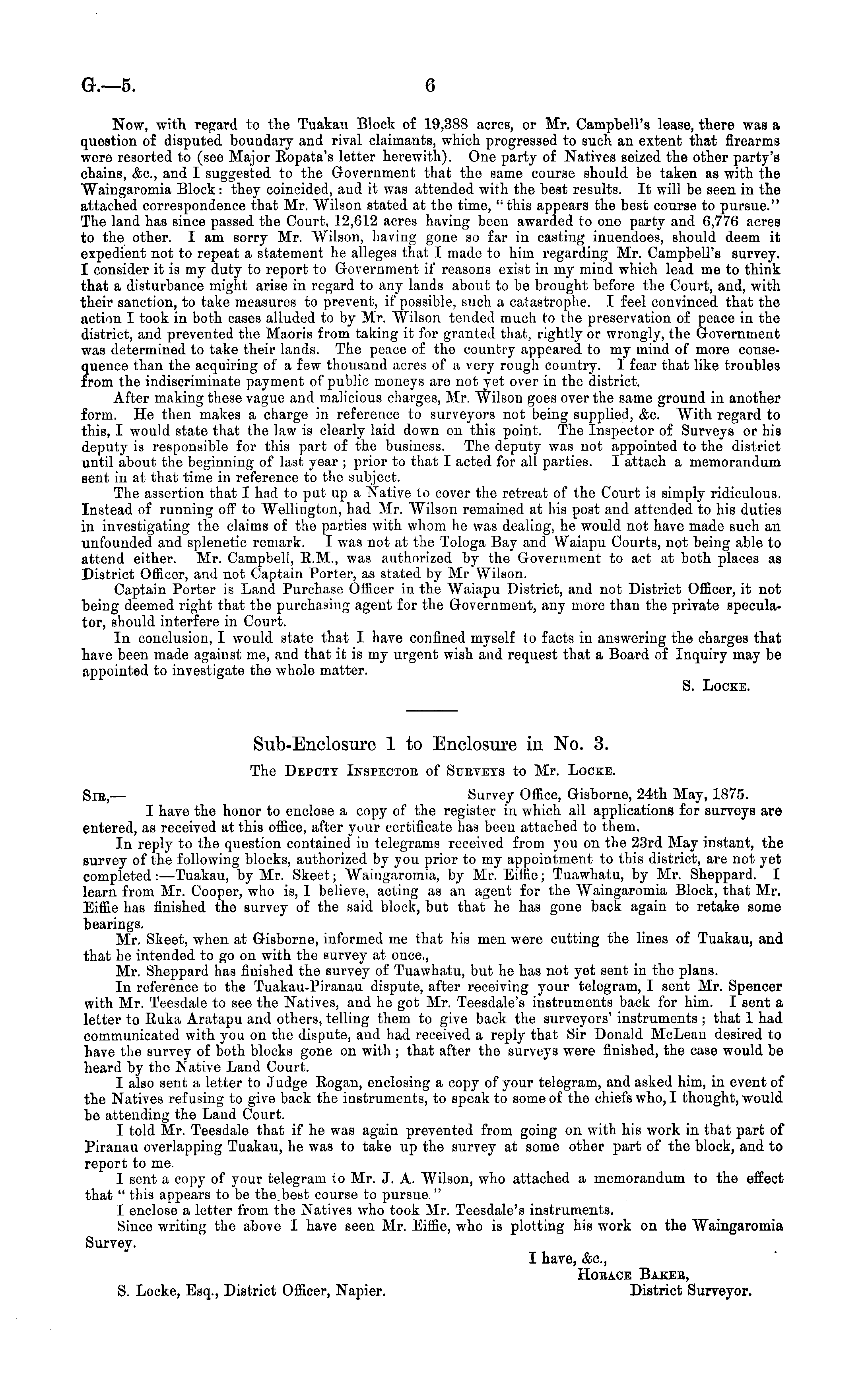 Now, with regard to the Tuakau Block of 19,388 acres, or Mr. Campbell's lease, there was a question of disputed boundary and rival claimants, which progressed to such an extent that firearms were resorted to (see Major Eopata's letter herewith). One party of Natives seized the other party's chains, &c, and I suggested to the G-overnment that the same course should be taken as with the Waingaromia Block : they coincided, and it was attended with the best results. It will be seen in the attached correspondence that Mr. Wilson stated at the time, "this appears the best course to pursue." The land has since passed the Court, 12,612 acres having been awarded to one party and 6,776 acres to the other. I am sorry Mr. Wilson, having gone so far in casting inuendoes, should deem it expedient not to repeat a statement he alleges that I made to him regarding Mr. Campbell's survey. I consider it is my duty to report to G-overnment if reasons exist in my mind which lead me to think that a disturbance might arise in regard to any lands about to be brought before the Court, and, with their sanction, to take measures to prevent, if possible, such a catastrophe. I feel convinced that the action I took in both cases alluded to by Mr. Wilson tended much to the preservation of peace in the district, and prevented the Maoris from taking it for granted that, rightly or wrongly, the Government was determined to take their lands. The peace of the country appeared, to my mind of more consequence than the acquiring of a few thousand acres of a very rough country. I fear that like troubles from the indiscriminate payment of public moneys are not yet over in the district. After making these vague and malicious charges, Mr. Wilson goes over the same ground in another form. He then makes a charge in reference to surveyors not being supplied, &c. With regard to this, I would state that the law is clearly laid down on this point. The Inspector of Surveys or his deputy is responsible for this part of the business. The deput3r was not appointed to the district until about the beginning of last year ; prior to that I acted for all parties. I attach a memorandum sent in at that time in reference to the subject. The assertion that I had to put up a Native to cover the retreat of the Court is simply ridiculous. Instead of running off to Wellington, had Mr. Wilson remained at his post and attended to his duties in investigating the claims of the parties with whom he was dealing, he would not have made such an unfounded and splenetic remark. I was not at the Tologa Bay and Waiapu Courts, not being able to attend either. Mr. Campbell, R.M., was authorized by the Government to act at both places as District Officer, and not Captain Porter, as stated by Mr Wilson. Captain Porter is Land Purchase Officer in the Waiapu District, and not District Officer, it not being deemed right that the purchasing agent for the Government, any more than the private speculator, should interfere in Court. In conclusion, I would state that I have confined myself to facts in answering the charges that have been made against me, and that it is my urgent wish and request that a Board of Inquiry may be appointed to investigate the whole matter. S. Locke. Sub-Enclosure 1 to Enclosure in No. 3. The Deputy Inspectob of Subveys to Mr. Locke. Sib,— Survey Office, Gisborne, 24th May, 1875. I have the honor to enclose a copy of the register in which all applications for surveys are entered, as received at this office, after your certificate has been attached to them. In reply to the question contained in telegrams received from you on the 23rd May instant, the survey of the following blocks, authorized by you prior to my appointment to this district, are not yet completed : —Tuakau, by Mr. Skeet; Waingaromia, by Mr. Eiffie; Tuawhatu, by Mr. Sheppard. I learn from Mr. Cooper, who is, I believe, acting as an agent for the Waingaromia Block, that Mr. Eiffie has finished the survey of the said block, but that he has gone back again to retake some bearings. Mr. Skeet, when at Gisborne, informed me that his men were cutting the lines of Tuakau, and that he intended to go on with the survey at once., Mr. Sheppard has finished the survey of Tuawhatu, but he has not yet sent in the plans. In reference to the Tuakau-Piranau dispute, after receiving your telegram, I sent Mr. Spencer with Mr. Teesdale to see the Natives, and he got Mr. Teesdale's instruments back for him. I sent a letter to Euka Aratapu and others, telling them to give back the surveyors' instruments ; that 1 had communicated with you on the dispute, and had received a reply that Sir Donald McLean desired to have the survey of both blocks gone on with ; that after the surveys were finished, the case would be heard by the Native Land Court. I also sent a letter to Judge Eogan, enclosing a copy of your telegram, and asked him, in event of the Natives refusing to give back the instruments, to speak to some of the chiefs who, I thought, would be attending the Laud Court. I told Mr. Teesdale that if he was again prevented from going on with his work in that part of Piranau overlapping Tuakau, he was to take up the survey at some other part of the block, and to report to me. I sent a copy of your telegram to Mr. J. A. Wilson, who attached a memorandum to the effect that " this appears to be the.best course to pursue." I enclose a letter from the Natives who took Mr. Teesdale's instruments. Since writing the above I have seen Mr. Eiffie, who is plotting his work on the Waingaromia Survey. I haYe, &c, Hoeace Bakee, S. Locke, Esq., District Officer, Napier. District Surveyor.