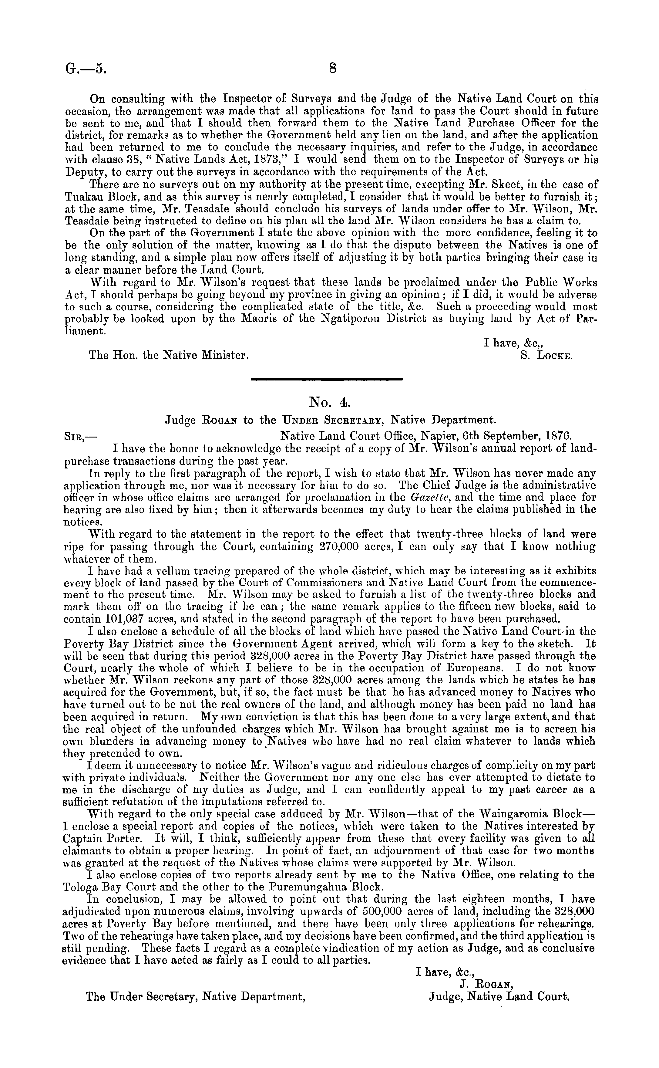 No. 4. Judge Eogan to the Under Seceexaet, Native Department. Sie,— Native Land Court Office, Napier, 6th September, 1876. I have the honor to acknowledge the receipt of a copy of Mr. Wilson's annual report of landpurchase transactions during the past year. In reply to the first paragraph of the report, I wish to state that Mr. Wilson has never made any application through me, nor was it necessary for him to do so. The Chief Judge is the administrative officer in whose office claims are arranged for proclamation in the Gazette, and the time and place for hearing are also fixed by him ; then it afterwards becomes my duty to hear the claims published in the notices. With regard to the statement in the report to the effect that twenty-three blocks of land were ripe for passing through the Court, containing 270,000 acres, I can only say that I know nothing whatever of them. I have had a vellum tracing prepared of the whole district, which may be interesting as it exhibits every block of land passed by the Court of Commissioners and Native Land Court from the commencement to the present time. Mr. Wilson may be asked to furnish a list of the twenty-three blocks and mark them off on the tracing if he can; the same remark applies to the fifteen new blocks, said to contain 101,037 acres, and stated in the second paragraph of the report to have been purchased. I also enclose a schedule of all the blocks of land which have passed the Native Land Court-in the Poverty Bay District since the Government Agent arrived, which will form a key to the sketch. It will be seen that during this period 328,000 acres in the Poverty Bay District have passed through the Court, nearly the whole of which I believe to be in the occupation of Europeans. I do not know whether Mr. Wilson reckons any part of those 328.000 acres among the lands which he states he has acquired for the Government, but, if so, the fact must be that he has advanced money to Natives who have turned out to be not the real owners of the land, and although money has been paid no land has been acquired in return. My own conviction is that this has been done to a very large extent, and that the real object of the unfounded charges which Mr. Wilson has brought against me is to screen his own blunders in advancing money to Natives who have had no real claim whatever to lands which they pretended to own. I deem it unnecessary to notice Mr. Wilson's vague and ridiculous charges of complicity on my part with private individuals. Neither the Government nor any one else has ever attempted to dictate to me in the discharge of my duties as Judge, and I can confidently appeal to my past career as a sufficient refutation of the imputations referred to. With regard to the only special case adduced by Mr. Wilson —that of the Waingaromia Block — I enclose a special report and copies of the notices, which were taken to the Natives interested by Captain Porter. It will, I think, sufficiently appear from these that every facility was given to all claimants to obtain a proper hearing. In point of fact, an adjournment of that case for two months was granted at the request of the Natives whose claims were supported by Mr. Wilson. I also enclose copies of two reports already sent by me to the Native Office, one relating to the Tologa Bay Court and the other to the Puremungahua Block. In conclusion, I may be allowed to point out that during the last eighteen months, I have adjudicated upon numerous claims, involving upwards of 500,000 acres of land, including the 328,000 acres at Poverty Bay before mentioned, and there have been only three applications for rehearings. Two of the rehearings have taken place, and my decisions have been confirmed, and the third application is still pending. These facts I regard as a complete vindication of my action as Judge, and as conclusive evidence that I have acted as fairly as I could to all parties. I have, &c, J. Kogan, The Under Secretary, Native Department, Judge, Native Land Court.