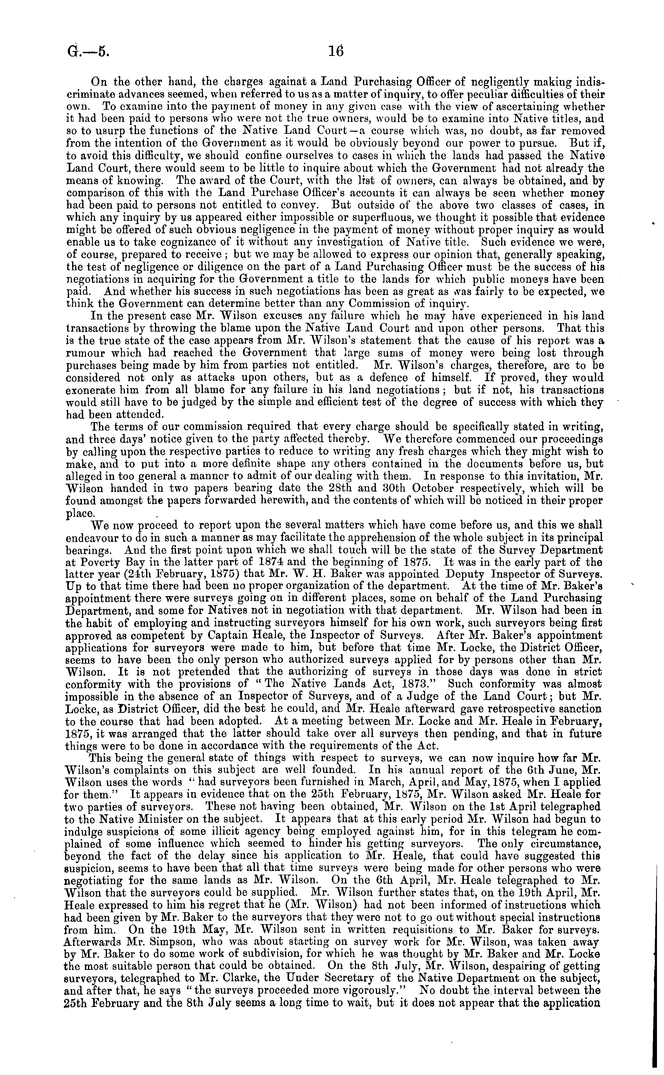 On the other hand, the charges againat a Land Purchasing Officer of negligently making indiscriminate advances seemed, when referred to us as a matter of inquiry, to offer peculiar difficulties of their own. To examine into the payment of money in any given case with the view of ascertaining whether it had been paid to persons who were not the true owners, would be to examine into Native titles, and so to usurp the functions of the Native Land Court—a course which was, no doubt, as far removed from the intention of the Government as it would be obviously beyond our power to pursue. But if, to avoid this difficulty, we should confine ourselves to cases in which the lands had passed the Native Land Court, there would seem to be little to inquire about which the Government had not already the moans of knowing. The award of the Court, with the lrst of owners, can always be obtained, and by comparison of this with the Land Purchase Officer's accounts it can always be seen whether money had been paid to persons not entitled to convey. But outside of the above two classes of cases, in which any inquiry by us appeared either impossible or superfluous, we thought it possible that evidence might be offered of such obvious negligence in the payment of money without proper inquiry as would enable us to take cognizance of it without any investigation of Native title. Such evidence we were, of course, prepared to receive ; but we may be allowed to express our opinion that, generally speaking, the test of negligence or diligence on the part of a Land Purchasing Officer must be the success of his negotiations in acquiring for the Government a title to the lands for which public moneys have been paid. And whether his success in such negotiations has been as great as >vas fairly to be expected, we think the Government can determine better than any Commission of inquiry. In the present case Mr. "Wilson excuses any failure which he may have experienced in his land transactions by throwing the blame upon the Native Land Court and upon other persons. That this is the true state of the case appears from Mr. Wilson's statement that the cause of his report was a rumour which had reached the Government that large sums of money were being lost through purchases being made by him from parties not entitled. Mr. "Wilson's charges, therefore, are to be considered not only as attacks upon others, but as a defence of himself. If proved, they would exonerate him from all blame for any failure in his land negotiations ; but if not, his transactions would still have to be judged by the simple and efficient test of the degree of success with which they had been attended. The terms of our commission required that every charge should be specifically stated in writing, and three days' notice given to the party affected thereby. We therefore commenced our proceedings by calling upon the respective parties to reduce to writing any fresh charges which they might wish to make, and to put into a more definite shape any others contained in the documents before us, but alleged in too general a manner to admit of our dealing with them. In response to thia invitation, Mr. "Wilson handed in two papers bearing date the 28th and 30th October respectively, which will be found amongst the papers forwarded herewith, and the contents of which will be noticed in their proper place. "We now proceed to report upon the several matters which have come before us, and this we shall endeavour to do in such a manner as may facilitate the apprehension of the whole subject in its principal bearings. And the first point upon which we shall touch will be the state of the Survey Department at Poverty Bay in the latter part of 1874 and the beginning of 1875. It was in the early part of the latter year (24th February, 1875) that Mr. W. H. Baker was appointed Deputy Inspector of Surveys. Up to that time there had been no proper organization of the department. At the time of Mr. Baker's appointment there were surveys going on in different places, some on behalf of the Land Purchasing Department, and some for Natives not in negotiation with that department. Mr. "Wilson had been in the habit of employing and instructing surveyors himself for his own work, such surveyors being first approved as competent by Captain Heale, the Inspector of Surveys. After Mr. Baker's appointment applications for surveyors were made to him, but before that time Mr. Locke, the District Officer, seems to have been the only person who authorized surveys applied for by persons other than Mr. Wilson. It is not pretended that the authorizing of surveys in those days was done in strict conformity with the provisions of " The Native Lands Act, 1873." Such conformity was almost impossible in the absence of an Inspector of Surveys, and of a Judge of the Land Court; but Mr. Locke, as District Officer, did the best he could, and Mr. Heale afterward gave retrospective sanction to the course that had been adopted. At a meeting between Mr. Locke and Mr. Heale in February, 1875, it was arranged that the latter should take over all surveys then pending, and that in future things were to be done in accordance with the requirements of the Act. This being the general state of things with respect to surveys, we can now inquire how far Mr. Wilson's complaints on this subject are well founded. In his annual report of the Gth June, Mr. Wilson uses the words l; had surveyors been furnished in March, April, and May, 1875, when I applied for them." It appears in evidence that on the 25th February, 1875, Mr. Wilson asked Mr. Heale for two parties of surveyors. These not having been obtained, Mr. Wilson on the Ist April telegraphed to the Native Minister on the subject. It appears that at this early period Mr. Wilson had begun to indulge suspicions of some illicit agency being employed against him, for in this telegram he complained of some influence which seemed to hinder his getting surveyors. The only circ