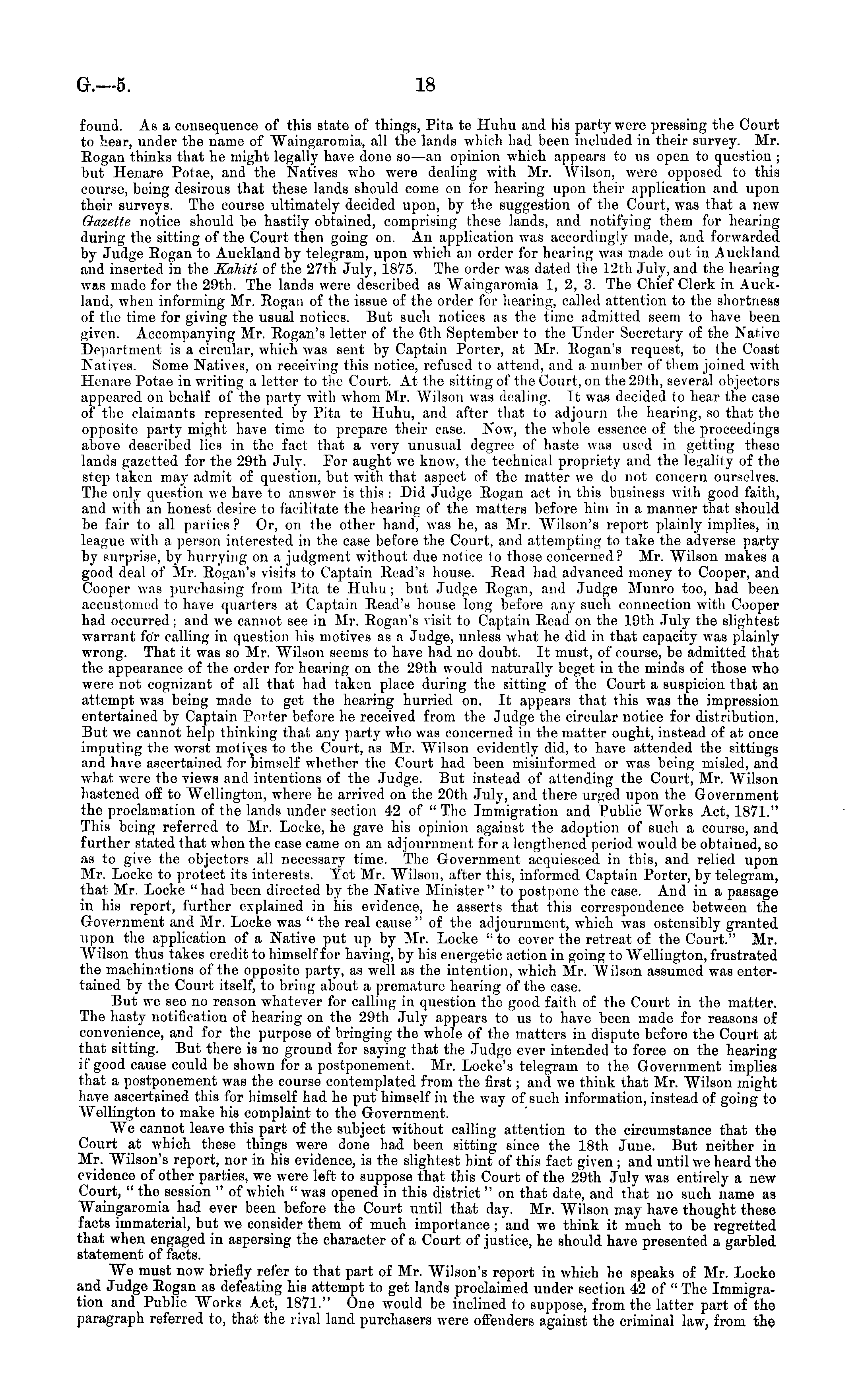 found. As a consequence of this state of things, Pita te Huhu and his party were pressing the Court to hear, under the name of Waingaromia, all the lands which had been included in their survey. Mr. Eogan thinks that he might legally have done so —an opinion which appears to us open to question ; but Henare Potae, and the Natives who were dealing with Mr. "Wilson, were opposed to this course, being desirous that these lands should come on for hearing upon their application and upon their surveys. The course ultimately decided upon, by the suggestion of the Court, was that a new Gazette notice should be hastily obtained, comprising these lands, and notifying them for hearing during the sitting of the Court then going on. An application was accordingly made, and forwarded by Judge Eogan to Auckland by telegram, upon which an order for hearing was made out in Auckland and inserted in the Kahiti of the 27th July, 1875. The order was dated the 12th July, and the hearing was made for the 29th. The lands were described as Waingaromia 1, 2, 3. The Chief Clerk in Auckland, when informing Mr. Eogan of the issue of the order for hearing, called attention to the shortness of the time for giving the usual notices. But such notices as the time admitted seem to have been given. Accompanying Mr. Eogan's letter of the Gth September to the Under Secretary of the Native Department is a circular, which was sent by Captain Porter, at Mr. Eogan's request, to the Coast Natives. Some Natives, on receiving this notice, refused to attend, and a number of them joined with Henare Potae in writing a letter to the Court. At the sitting of the Court, on the 29th, several objectors appeared on behalf of the party with whom Mr. Wilson was dealing. It was decided to hear the case of the claimants represented by Pita te Huhu, and after that to adjourn the hearing, so that the opposite party might have time to prepare their case. Now, the whole essence of the proceedings above described lies in the fact that a very unusual degree of haste was used in getting these lands gazetted for the 29th July. For aught we know, the technical propriety and the legality of the step taken may admit of question, but with that aspect of the matter we do not concern ourselves. The only question we have to answer is this : Did Judge Eogan act in this business with good faith, and with an honest desire to facilitate the hearing of the matters before him in a manner that should be fair to all parties ? Or, on the other hand, was he, as Mr. Wilson's report plainly implies, in league with a person interested in the case before the Court, and attempting to take the adverse party by surprise, by hurrying on a judgment without due notice to those concerned? Mr. Wilson makes a good deal of Mr. Eogan's visits to Captain Head's house. Bead had advanced money to Cooper, and Cooper was purchasing from Pita te Huhu ; but Judge Eogan, and Judge Munro too, had been accustomed to have quarters at Captain Eead's house long before any such connection with Cooper had occurred; and we cannot see in Mr. Eogan's visit to Captain Eead on the 19th July the slightest warrant for calling in question his motives as a Judge, unless what he did in that capacity was plainly wrong. That it was so Mr. Wilson seems to have had no doubt. It must, of course, be admitted that the appearance of the order for hearing on the 29th would naturally beget in the minds of those who were not cognizant of all that had taken place during the sitting of the Court a suspicion that an attempt was being made to get the hearing hurried on. It appears that this was the impression entertained by Captain Porter before he received from the Judge the circular notice for distribution. But we cannot help thinking that any party who was concerned in the matter ought, instead of at once imputing the worst motives to the Court, as Mr. Wilson evidently did, to have attended the sittings and have ascertained for himself whether the Court had been misinformed or was being misled, and what were the views and intentions of the Judge. But instead of attending the Court, Mr. Wilson hastened off to Wellington, where he arrived on the 20th July, and there urged upon the Government the proclamation of the lands under section 42 of " The Immigration and Public Works Act, 1871." This being referred to Mr. Locke, he gave his opinion against the adoption of such a course, and further stated that when the case came on an adjournment for a lengthened period would be obtained, so as to give the objectors all necessary time. The Government acquiesced in this, and relied upon Mr. Locke to protect its interests. Yet Mr. Wilson, after this, informed Captain Porter, by telegram, that Mr. Locke "had been directed by the Native Minister" to postpone the case. And in a passage in his report, further explained in his evidence, he asserts that this correspondence between the Government and Mr. Locke was " the real cause" of the adjournment, which was ostensibly granted upon the application of a Native put up by Mr. Locke "to cover the retreat of the Court." Mr. Wilson thus takes credit to himself for having, by his energetic action in going to Wellington, frustrated the machinations of the opposite party, as well as the intention, which Mr. "Wilson assumed was entertained by the Court itself, to bring about a premature hearing of the case. But we see no reason whatever for calling in question the good faith of the Court in the matter. The hasty notification of hearing on the 29th July appears to us to have been made for reasons of convenience, and for the purpose of bringing the whole of the matters in dispute before the Court at that sitting. But there is no ground for saying that the Judge ever intended to force on the hearing if good cause could be shown for a postponement. Mr. Locke's telegram to the Government implies that a postponement was the course contemplated from the first; and we think that Mr. Wilson might have a
