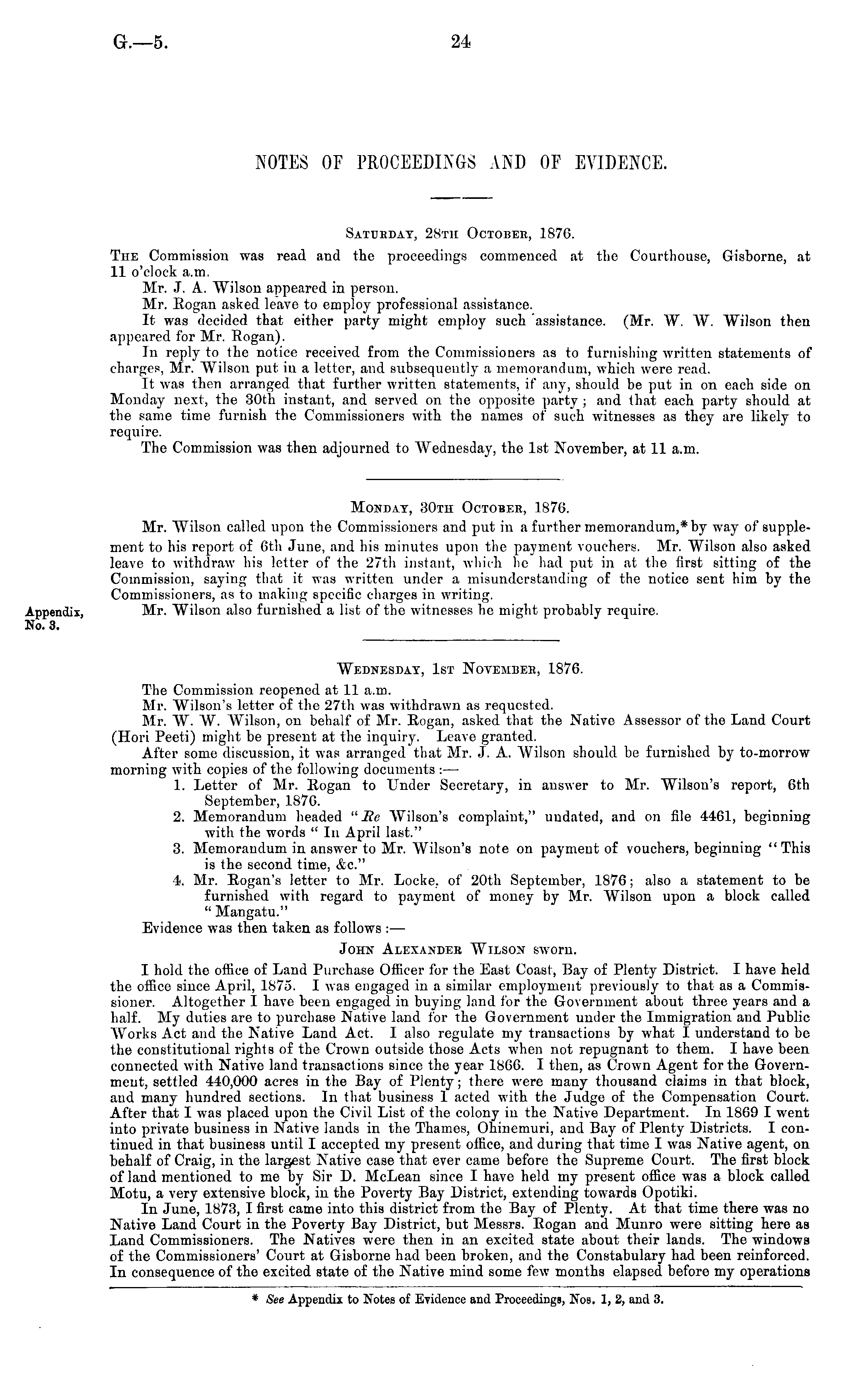NOTES OF PROCEEDINGS AND OF EVIDENCE. Saturday, 28th October, 1876. The Commission was read and the proceedings commenced at the Courthouse, Gisborne, at 11 o'clock a.m. Mr. J. A. Wilson appeared in person. Mr. Eogan asked leave to employ professional assistance. It was decided that either party might employ such assistance. (Mr. W. W. Wilson then appeared for Mr. Eogan). In reply to the notice received from the Commissioners as to furnishing written statements of charges, Mr. Wilson put in a letter, and subsequently a memorandum, which were read. It was then arranged that further written statements, if any, should be put in on each side on Monday next, the 30th instant, and served on the opposite party ; and that each party should at the same time furnish the Commissioners with the names of such witnesses as they are likely to require. The Commission was then adjourned to Wednesday, the Ist November, at 11 a.m.