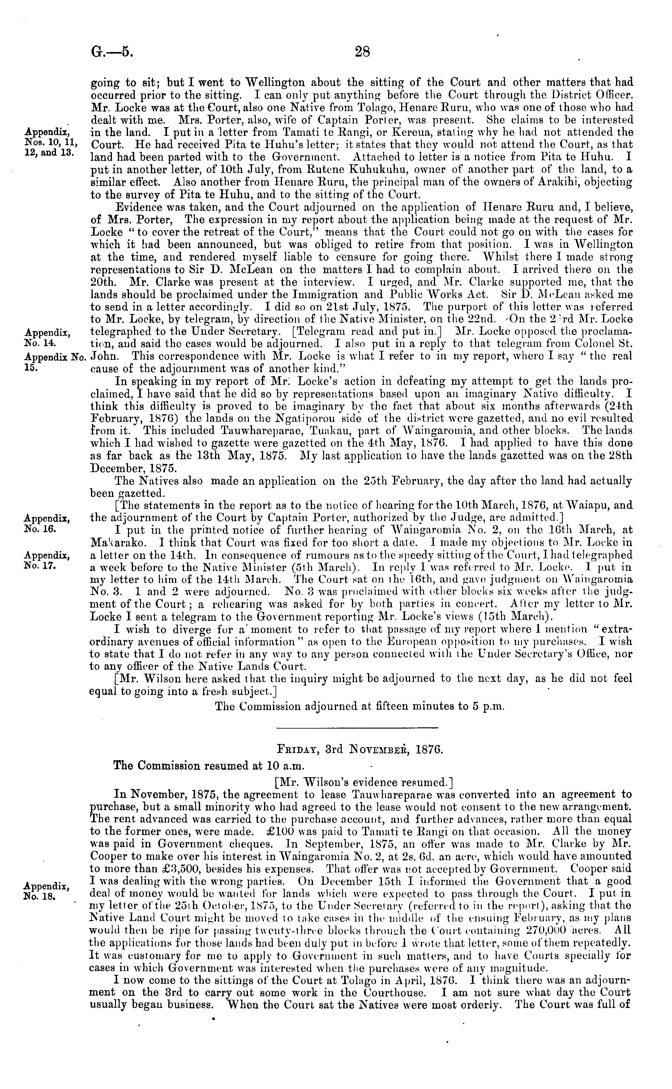 Friday, 3rd Noyehbek, 1876. The Commission resumed at 10 a.m. [Mr. Wilson's evidence resumed.] In November, 1875, the agreement to lease Tauwhareparae was converted into an agreement to purchase, but a small minority who had agreed to the lease would not consent to the new arrangement. The rent advanced was carried to the purchase account, and further advances, rather more than equal to the former ones, were made. £100 was paid to Tamati te Eangi on that occasion. All the money was paid in Government cheques. In September, 1875, an offer was made to Mr. Clarke by Mr. Cooper to make over his interest in Waingaromia No. 2, at 2s. 6d. an acre, whicli would have amounted to more than £3,500, besides his expenses. That offer was not accepted by Government. Cooper said I was dealing with the wrong parties. On December 15th I informed the Government that a good deal of money would be wanted for lands which were expected to pass through the Court. I put in my letter.ot'the 25ih October, 1875, to the Under Secretary (referred to in the report), asking that the Native Land Court might be moved to take cases in the middle of the ensuing February, as my plans would tht-n be ripe for passing twenty-three blocks through the Court containing 270,0u0 acres. All the applications for those lands had been duly put in before 1 wrote that letter, some of them repeatedly. It was customary for me to apply to Government in such matters, and to have Courts specially for cases in which Government was interested when the purchases were of any magnitude. I now come to the sittings of the Court at Tolago in April, 1870. I think there was an adjournment on the 3rd to carry out some work in the Courthouse. lam not sure what day the Court usually began business. When the Court sat the Natives were most orderly. The Court was full of