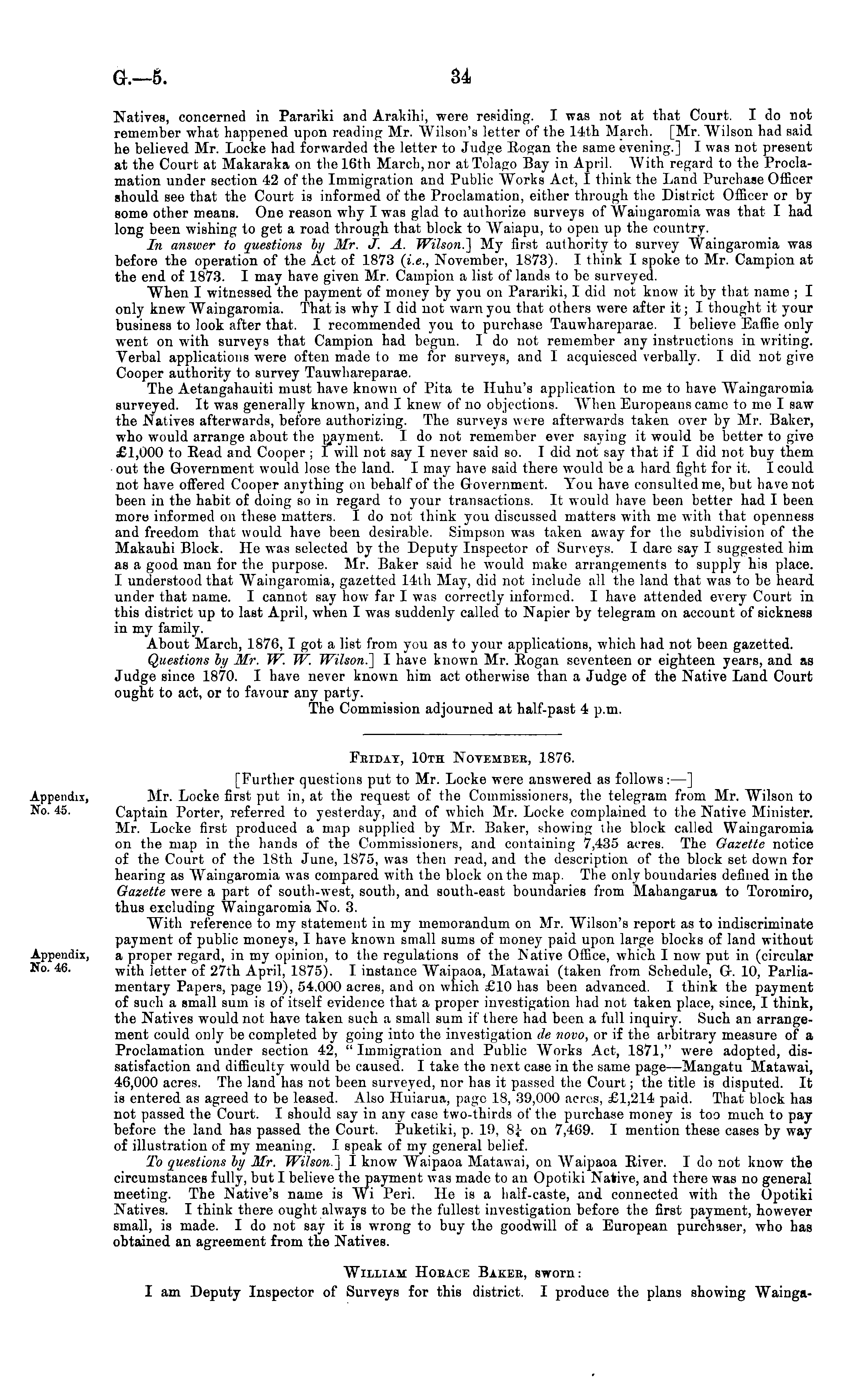 Friday, 10th Notembek, 1876. [Further questions put to Mr. Locke were answered as follows: —] Mr. Locke first put in, at the request of the Commissioners, the telegram from Mr. Wilson to Captain Porter, referred to yesterday, and of which Mr. Locke complained to the Native Minister. Mr. Locke first produced a map supplied by Mr. Baker, showing the block called Waingaromia on the map in the hands of the Commissioners, and containing 7,435 acres. The Gazette notice of the Court of the 18th June, 1875, was then read, and the description of the block set down for hearing as Waingaromia was compared with the block on the map. The only boundaries defined in the Gazette were a part of south-west, south, and south-east boundaries from Mahangarua to Toromiro, thus excluding Waingaromia No. 3. With reference to my statement in my memorandum on Mr. Wilson's report as to indiscriminate payment of public moneys, I have known small sums of money paid upon large blocks of land without a proper regard, in my opinion, to the regulations of the Native Office, which I now put in (circular with letter of 27th April, 1875). I instance Waipaoa, Matawai (taken from Schedule, G. 10, Parliamentary Papers, page 19), 54.000 acres, and on which £10 has been advanced. I think the payment of such a small sum is of itself evidence that a proper investigation had not taken place, since, I think, the Natives would not have taken such a small sum if there had been a full inquiry. Such an arrangement could only be completed by going into the investigation de novo, or if the arbitrary measure of a Proclamation under section 42, "Immigration and Public Works Act, 1871," were adopted, dissatisfaction and difficulty would be caused. I take the next case in the same page —Mangatu Matawai, 40,000 acres. The land has not been surveyed, nor has it passed the Court; the title is disputed. It is entered as agreed to be leased. Also Huiarua, page 18, 39,000 acres, £1,214 paid. That block has not passed the Court. I should say in any case two-thirds of the purchase money is too much to pay before the land has passed the Court. Puketiki, p. 19, 8j on 7,469. I mention these cases by way of illustration of my meaning. I speak of my general belief. To questions by Mr. Wilson.~\ I know Waipaoa Matawai, on Waipaoa River. Ido not know the circumstances fully, but I believe the payment was made to an Opotiki Native, and there was no general meeting. The Native's name is Wi Peri. He is a half-caste, and connected with the Opotiki Natives. I think there ought always to be the fullest investigation before the first payment, however small, is made. I do not say it is wrong to buy the goodwill of a European purchaser, who has obtained an agreement from the Natives. William Hobace Bakeb, sworn: I am Deputy Inspector of Surveys for this district. I produce the plans showing Wainga-