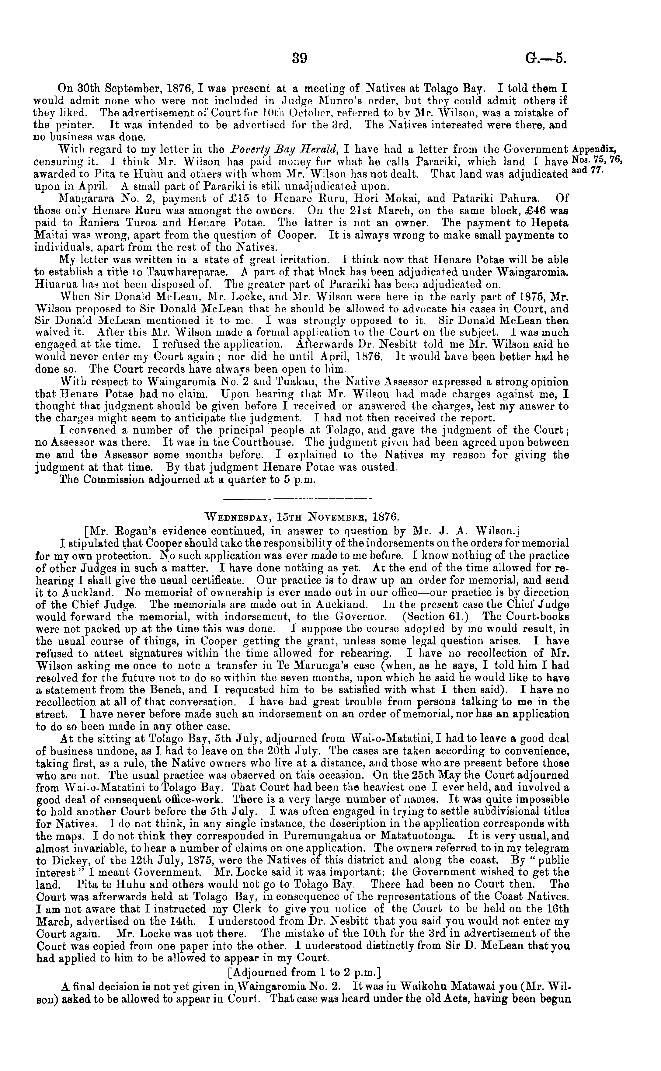 On 30th September, 1876, I was present at a meeting of Natives at Tolago Bay. I told them I would admit none who were not included in Judge Munro's order, but they could admit others if they liked. The advertisement of Court for 10th October, referred to by Mr. Wilson, was a mistake of the printer. It was intended to be advertised for the 3rd. The Natives interested were there, and no business was done. With regard to my letter in the Poverty Bay Herald, I have had a letter from the Government censuring it. I think Mr. Wilson has paid money for what he calls Parariki, which land I have awarded to Pita te Huhu and others with whom Mr. Wilson has not dealt. That land was adjudicated upon in April. A small part of Parariki is still unadjudicated upon. Mangarara No. 2, payment of £15 to Henare Kuru, Hori Mokai, and Patariki Pahura. Of those only Henare Euru was amongst the owners. On the 21st March, on the same block, £46 was paid to Baniera Turoa and Henare Potae. The latter is not an owner. The payment to Hepeta Maitai was wrong, apart from the question of Cooper. It is always wrong to make small payments to individuals, apart from the rest of the Natives. My letter was written in a state of great irritation. I think now that Henare Potae will be able to establish a title to Tauwhareparae. A part of that block has been adjudicated under Waingaromia. Hiuarua has not been disposed of. The greater part of Parariki has been adjudicated on. When .Sir Donald McLean, Mr. Locke, and Mr. Wilson were here in the early part of 1875, Mr. Wilson proposed to Sir Donald McLean that he should be allowed to advocate his cases in Court, and Sir Donald McLean mentioned it to me. I was strongly opposed to it. Sir Donald McLean then waived it. After this Mr. Wilson made a formal application to the Court on the subject. I was much engaged at the time. I refused the application. Afterwards Dr. Nesbitt told me Mr. Wilson said he would never enter my Court again ; nor did he until April, 1876. It would have been better had he done so. The Court records have always been open to him. With respect to Waingaromia No. 2 and Tuakau, the Native Assessor expressed a strong opinion that Henare Potae had no claim. Upon hearing that Mr. Wilson had made charges against me, I thought that judgment should be given before I received or answered the charges, lest my answer to the charges might seem to anticipate the judgment. I had not then received the report. I convened a number of the principal people at Tolago, and gave the judgment of the Court; no Assessor was there. It was in the Courthouse. The judgment given had been agreed upon between me and the Assessor some months before. I explained to the Natives my reason for giving the judgment at that time. By that judgment Henare Potae was ousted. The Commission adjourned at a quarter to 5 p.m.