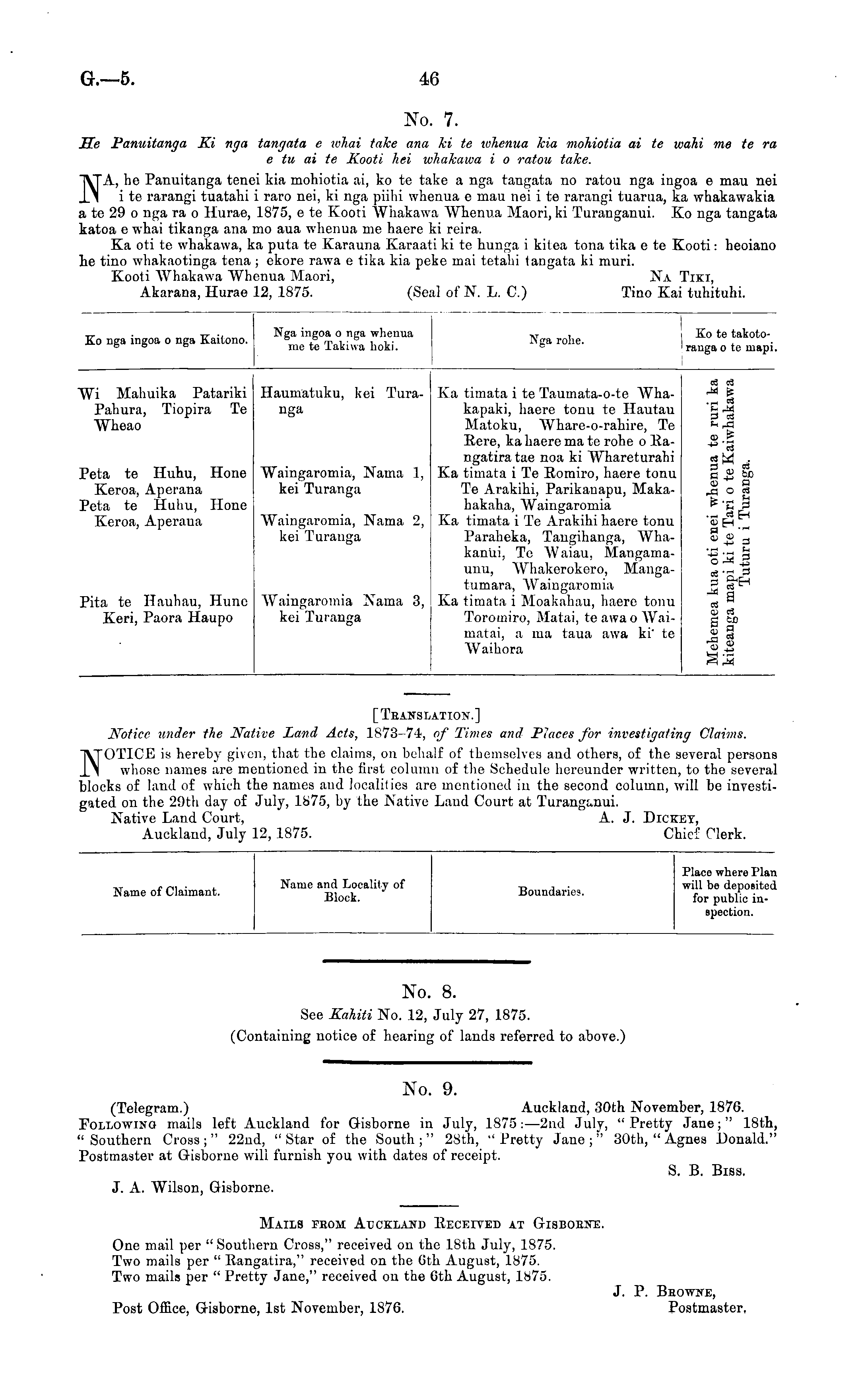 No. 7. He Panuitanga Ki nga tangata e ivhai take ana Jci te ivhenua hia mohiotia ai te wahi me te ra e tu ai te Kooti hei whakawa i o ratou take. NA, he Panuitanga tenei kia mohiotia ai, ko te take a nga tangata no ratou nga ingoa e mau nei i te rarangi tuatahi i raro nei, ki nga piihi whenua e mau nei i te rarangi tuarua, ka whakawakia ate29 o nga ra o Hurae, 1875, ete Kooti Whakawa Whenua Maori, ki Turanganui. Ko nga tangata katoa e whai tikanga ana mo aua whenua me haere ki reira. Ka oti te whakawa, ka puta te Karauna Karaati ki te hunga i kitea tona tika ete Kooti: heoiano he tino whakaotinga tena ; ekore rawa e tika kia peke mai tetahi tangata ki muri. Kooti Whakawa Whenua Maori, Na Tiki, Akarana, Hurae 12, 1875. (Seal of N. L. C.) Tino Kai tuhituhi.