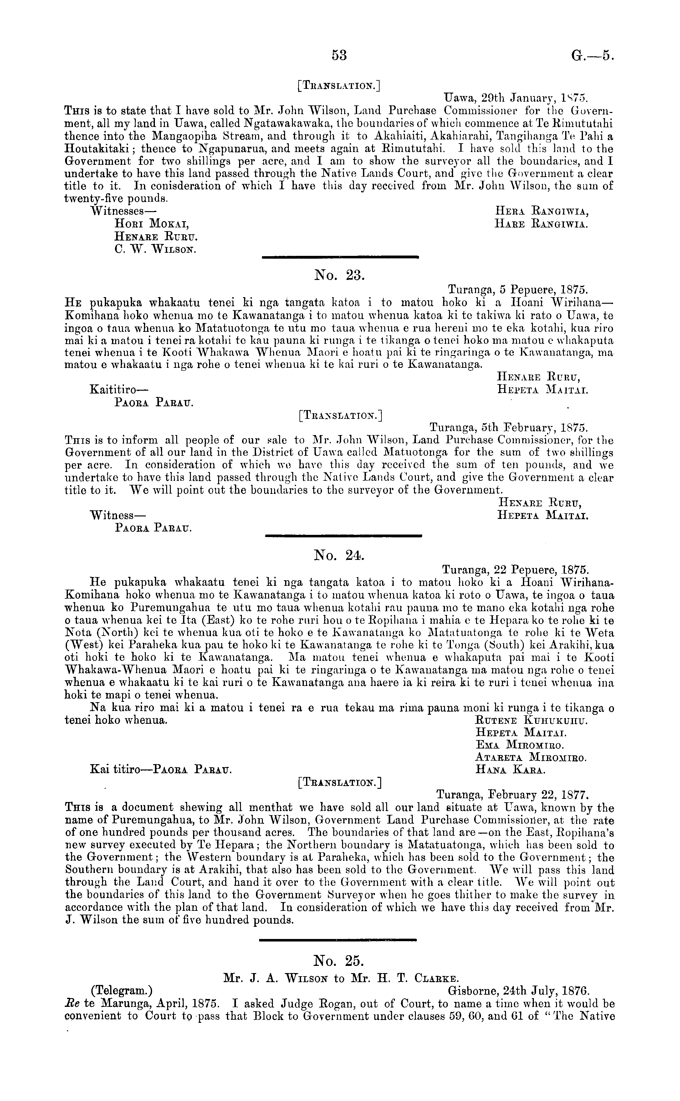 No. 23. Turanga, 5 Pepuere, 1875. He pukapuka whakaatu tenei ki nga tangata katoa i to matou hoko ki a Hoani Wirihana— Komihana hoko whenua mo te Kawanatanga i to matou whenua katoa ki te takiwa ki rato o Uawa, te ingoa o taua whenua ko Matatuotonga te utu mo taua whenua e rua hereni mo te eka kotahi, kua riro mai ki a matou i tenei ra kotahi te kau pauna ki runga i te tikanga o tenei hoko ma matou e whakaputa tenei whenua i te Kooti Whakawa Whenua Maori e hoatu pai ki te ringaringa o te Kawanatanga, ma matou e whakaatu i nga rohe o tenei whenua ki te kai ruri o te Kawanatanga. Henaee Eubtt, Kaititiro— Hepeta Maitai. Paoea Paeau. [Teanslation-.] Turanga, sth February, 1875. Tins is to inform all people of our sale to Mr. John Wilson, Land Purchase Commissioner, for the Government of all our land in the District of Uawa called Matuotonga for the sum of two shillings per acre. In consideration of which we have this day received the sum of ten pounds, and we undertake to have this land passed through the Native Lands Court, and give the Government a clear title to it. We will point out the boundaries to the surveyor of the Government. Hexaee Rubtj, Witness — Hepeta Maitai. Paoea Paeau.