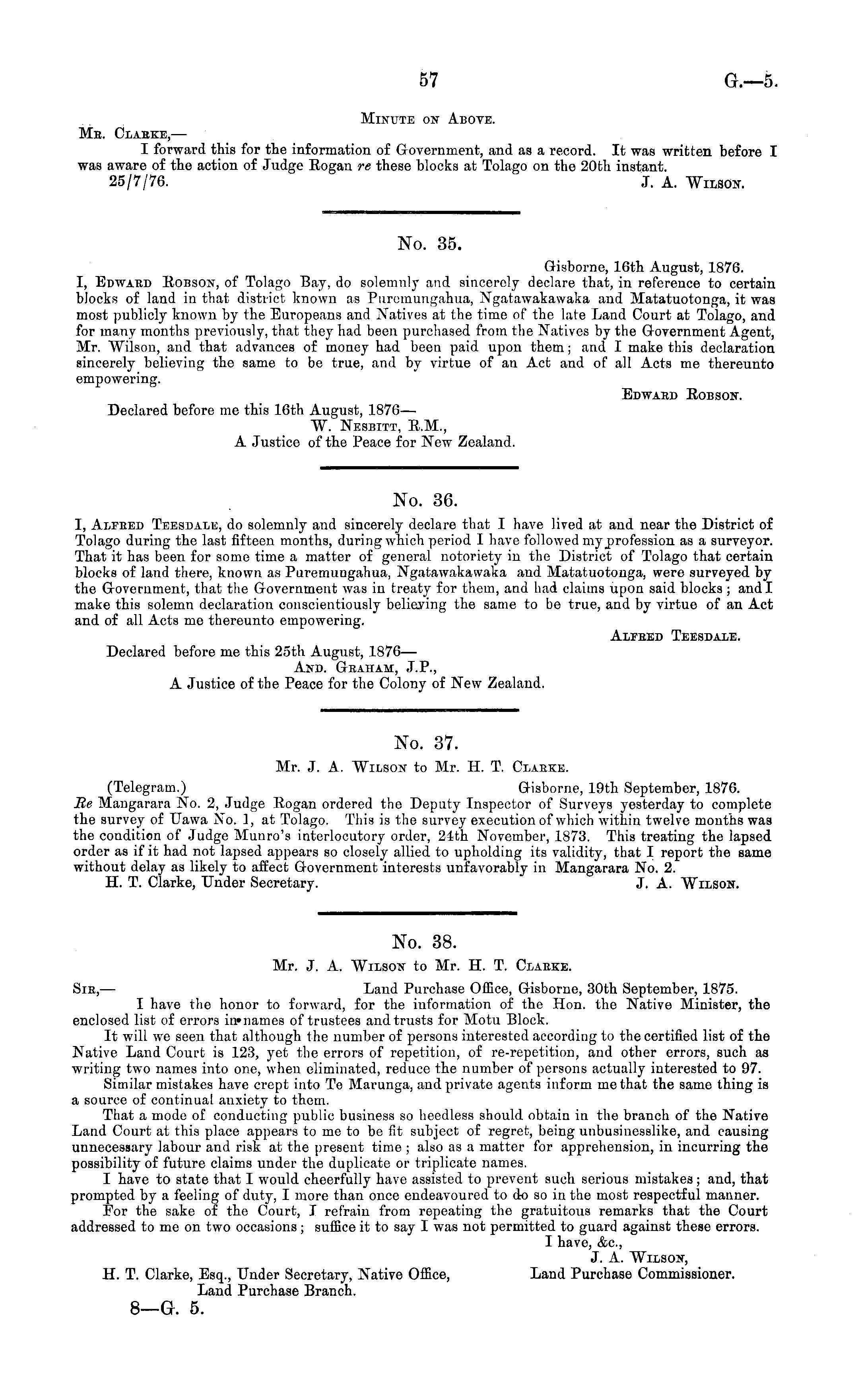 No. 35. Gisborne, 16th August, 1876. I, Edward Eobson, of Tolago Bay, do solemnly and sincerely declare that, in reference to certain blocks of land in that district known as Puremungahua, Ngatawakawaka and Matatuotonga, it was most publicly known by the Europeans and Natives at the time of the late Land Court at Tolago, and for many months previously, that they had been purchased from the Natives by the Government Agent, Mr. Wilson, and that advances of money had been paid upon them; and I make this declaration, sincerely believing the same to be true, and by virtue of an Act and of all Acts me thereunto empowering. Edward Eobson. Declared before me this 16th August, 1876— W. Nesbitt, E.M., A Justice of the Peace for New Zealand.