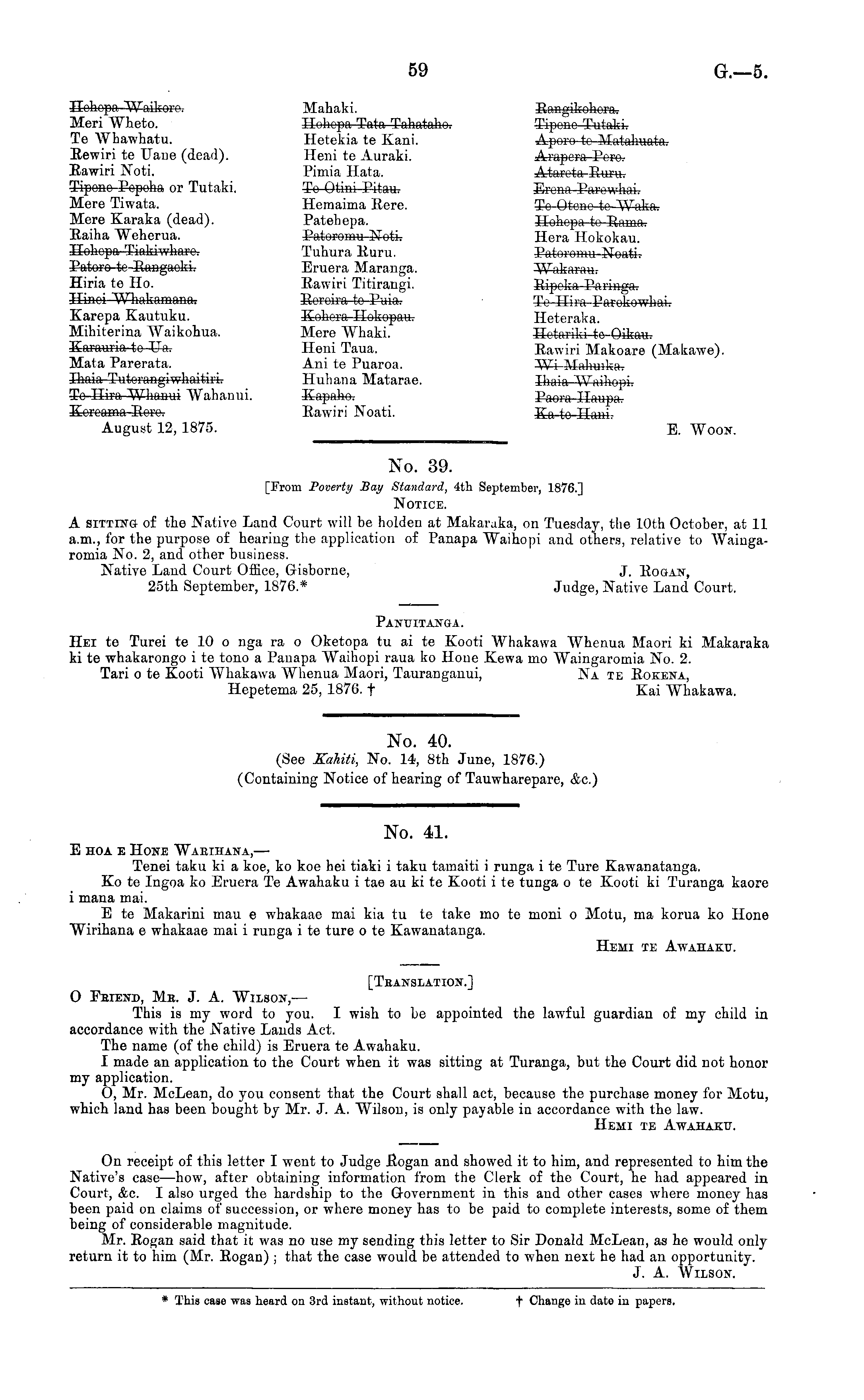 No. 40. (See Kahiti, No. 14, Bth June, 1876.) (Containing Notice of hearing of Tauwharepare, &c.)