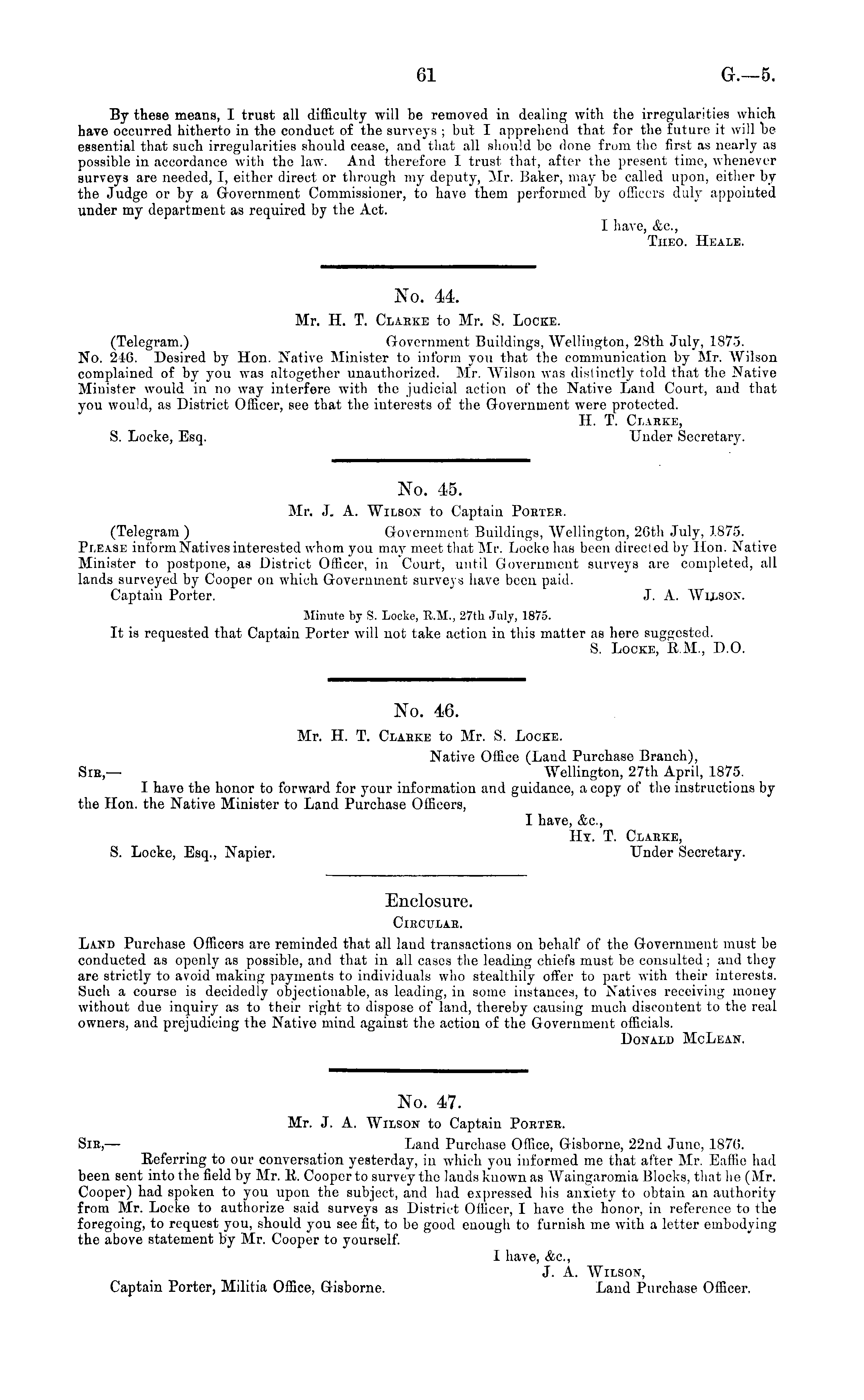 No. 44. Mr. H. T. Clabke to Mr. S. Locke. (Telegram.) Government Buildings, Wellington, 28th July, 1875. No. 246. Desired by Hon. Native Minister to inform you that the communication by Mr. Wilson complained of by you was altogether unauthorized. Mr. Wilson was distinctly told that the Native Minister would in no way interfere with the judicial action of the Native Land Court, and that you would, as District Officer, see that the interests of the Government were protected. H. T. Clarke, S. Locke, Esq. Under Secretary.