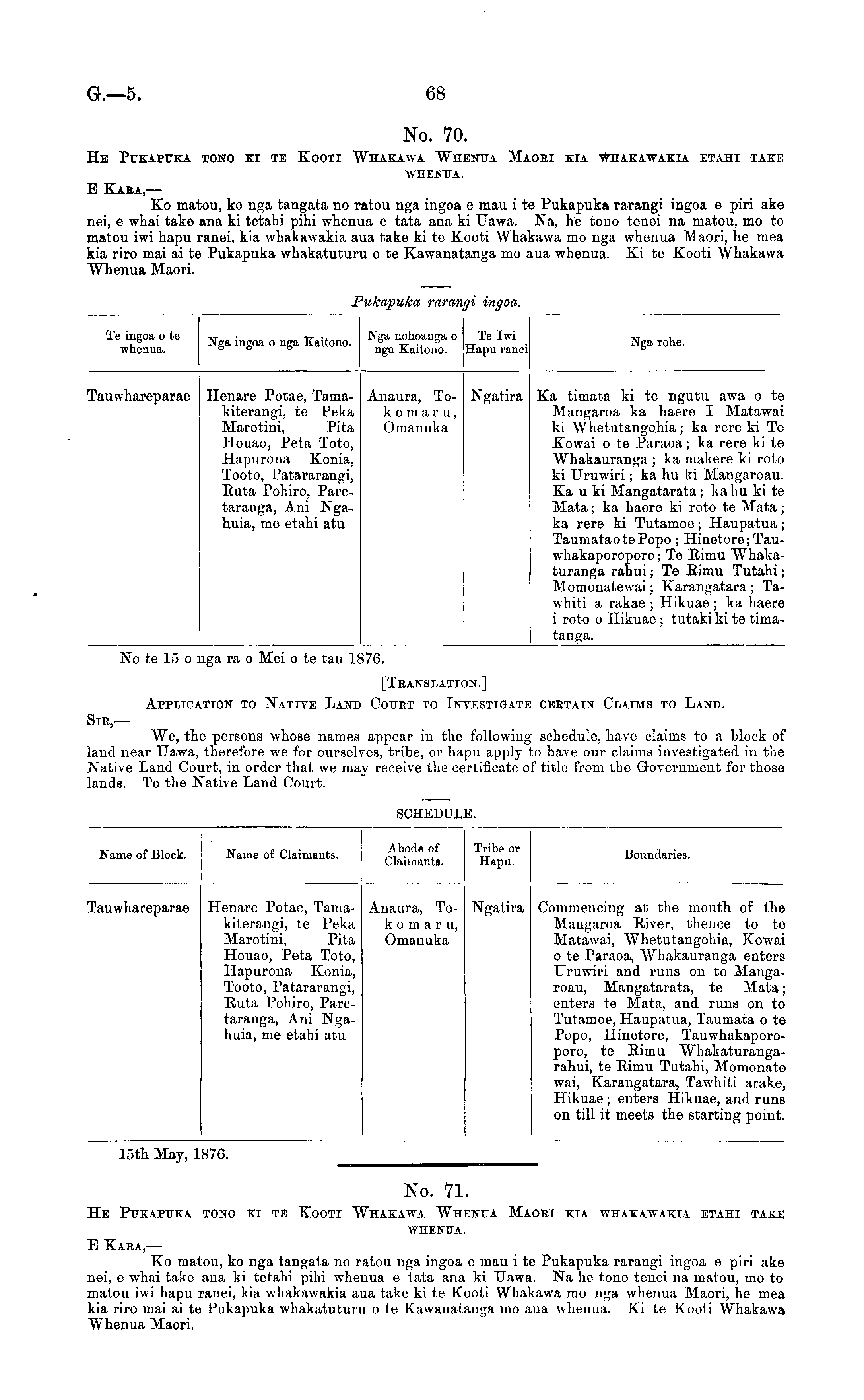 Te ingoa o te whenua. Nga ingoa o nga Kaitono. N"ga nohoanga o uga Kaitono. Te Iwi Hapu ranei Nga rohe. 'auwhareparae Henare Potae, Tamakiterangi, te Peka Marotini, Pita Houao, Peta Toto, Hapurona Konia, Tooto, Patararangi, Euta Pohiro, Paretaranga, Ani Ngahuia, me etahi atu Anaura, Tokomar u, Omanuka Ngatira Ka timata ki te ngutu awa o te Mangaroa ka haere I Matawai ki Whetutangohia; ka rere ki Te Kowai o te Paraoa; ka rere ki te Whakauranga ; ka makere ki roto ki Uruwiri; ka hu ki Mangaroau. Ka u ki Mangatarata; ka hu ki te Mata; ka haere ki roto te Mata; ka rere ki Tutamoe; Haupatua; TaumataotePopo ; Hinetore; Tauwhakaporoporo; Te Rimu Whakaturanga rahui; Te Eimu Tutahi; Momonatewai; Karangatara; Tawhiti a rakae ; Hikuae ; ka haere i roto o Hikuae; tutaki ki te timatanga. No te 15 o iga ra o Mei o te tau 1876.