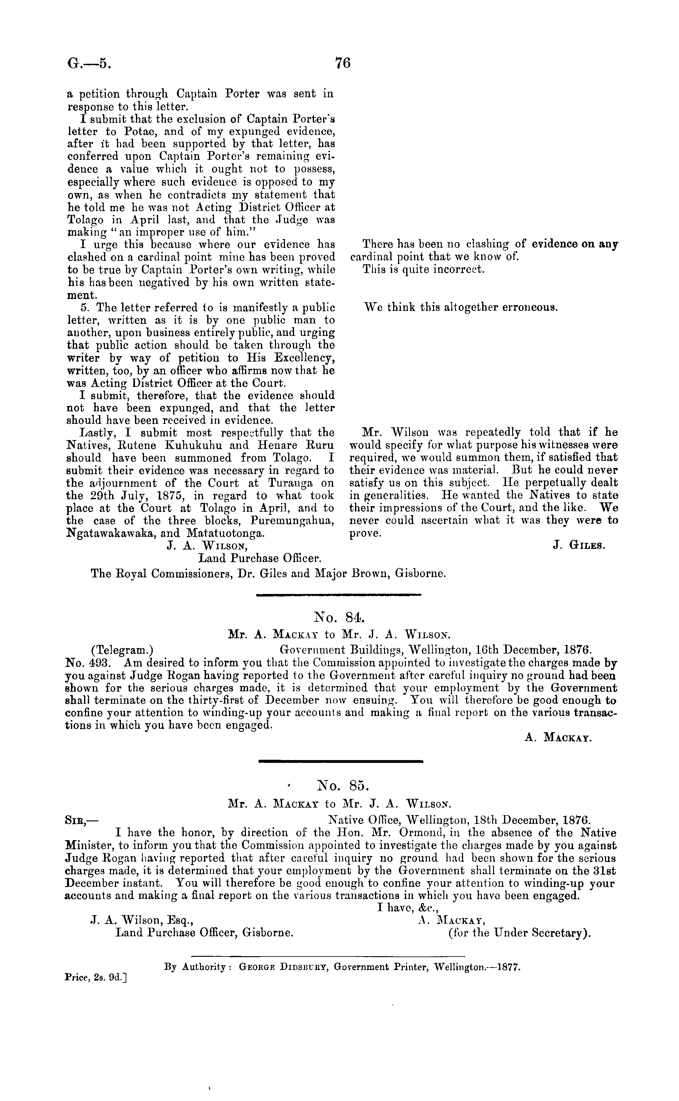 a petition through Captain Porter was sent in response to this letter. I submit that the exclusion of Captain Porter"s letter to Potae, and of my expunged evidence, after it had been supported by that letter, has conferred upon Captain Porter's remaining evidence a value which it ought not to possess, especially where such evidence is opposed to my own, as when he contradicts my statement that he told me he was not Acting District Officer at Tolago in April last, and that the Judge was making "an improper use of him." I urge this because where our evidence has There has been no clashing of evidence on any clashed on a cardinal point mine has been proved cardinal point that we know of. to be true by Captain Porter's own writing, while This is quite incorrect, his has been negatived by his own written statement. 5. The letter referred to is manifestly a public We think this altogether erroneous, letter, written as it is by one public man to another, upon business entirely public, and urging that public action should be taken through the writer by way of petition to His Excellency, written, too, by an officer who affirms now that he was Acting District Officer at the Court. I submit, therefore, that the evidence should not have been expunged, and that the letter should have been received in evidence. Lastly, I submit most respectfully that the Mr. Wilson was repeatedly told that if he Natives, Rutene Kuhukuhu and Henare Ruru would specify for what purpose his witnesses were should have been summoned from Tolago. I required, we would summon them, if satisfied that submit their evidence was necessary in regard to their evidence was material. But he could never the adjournment of the Court at Turanga on satisfy us on this subject. He perpetually dealt the 29th July, 1875, in regard to what took in generalities. He wanted the Natives to state place at the Court at Tolago in April, and to their impressions of the Court, and the like. We the case of the three blocks, Puremungahua, never could ascertain what it was they were to Ngatawakawaka, and Matatuotonga. prove. J. A. Wilson, J. Giles. Land Purchase Officer. The Royal Commissioners, Dr. Giles and Major Brown, Gisborne.