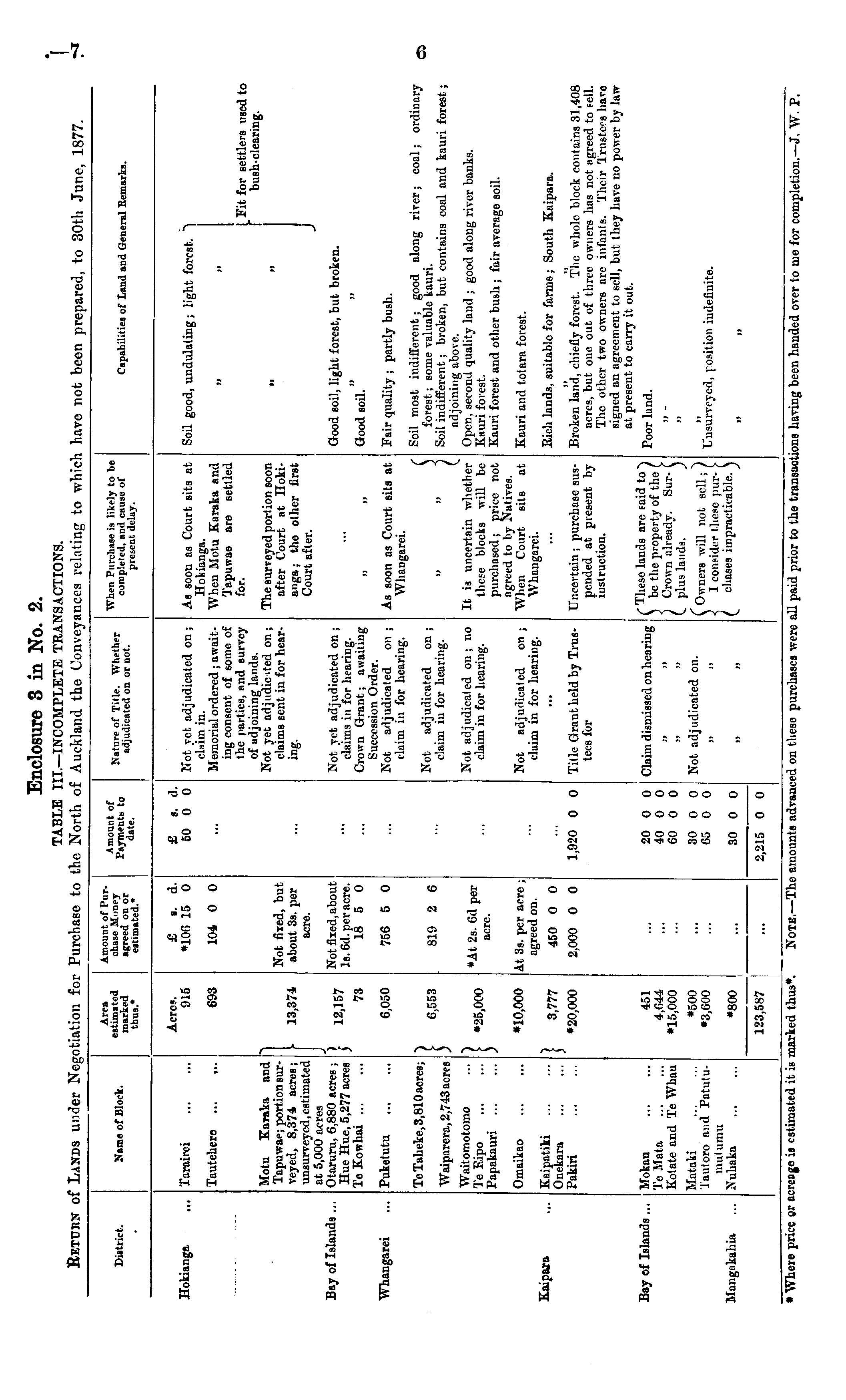 Enclosure 3 in No. 2. TABLE III.—INCOMPLETE TRANSACTIONS. RETUR of LANDS under Negotiation for Purchase to the North of Auckland the Conveyances relating to which have not been prepared, to 30th June, 1877.