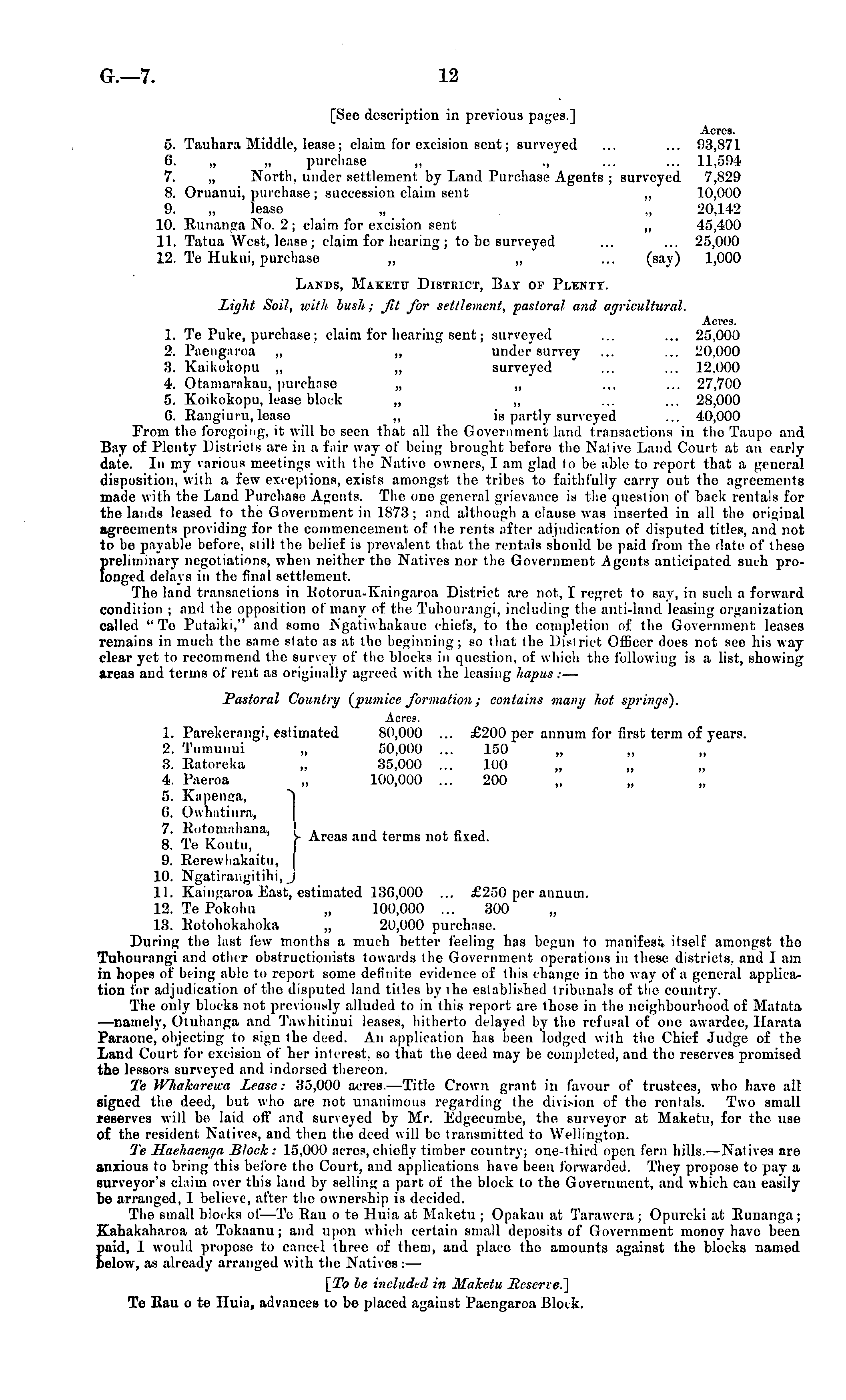 [See description in previous pages.] Acres. 5. Tauhara Middle, lease; claim for excision sent; surveyed ... ... 93,871 6. „ „ purchase ~ ~ ... ... 11,594 7. „ North, under settlement by Land Purchase Agents ; surveyed 7,829 8. Oruanui, purchase; succession claim sent „ 10,000 9. „ lease „ „ 20,142 10. Runanga No. 2; claim for excision sent „ 45,400 11. Tatua West, lease ; claim for hearing ;to be surveyed ... ... 25,000 12. Te Hukui, purchase „ „ ... (say) 1,000 Lands, Maketu District, Bay of Plenty. Light Soil, with bush ; fit for settlement, pastoral and agricultural. Acres. 1. Te Puke, purchase; claim for hearing sent; surveyed ... ... 25,000 2. Paengaroa „ ~ under survey ... ... 20,000 3. Kaikokopu ~ ~ surveyed ... ... 12,000 4. Otamarakau, purchase „ „ ... ... 27,700 5. Koikokopu, leaso block „ „ ... ... 28,000 6. Rangiuru, lease ~ is partly surveyed ... 40,000 From the foregoing, it will bo seen that all the Government land transactions in the Taupo and Bay of Plenty Districts are in a fair way of being brought before tho Native Land Court at an early date. In my various meetings with the Native owners, lam glad to be able to report that a general disposition, with a few exceptions, exists amongst the tribes to faithfully carry out the agreements made with the Land Purchase Agents. The one general grievance is the question of back rentals for the lands leased to the Government in 1573 ; and although a clause was iuserted in all the original agreements providing for the commencement of the rents after adjudication of disputed titles, and not to be payable before, still the belief is prevalent that the rentals should be paid from the date of theso preliminary negotiations, when neither the Natives nor the Government Agents anticipated such prolonged delays in tho final settlement. The land transactions in Botorua-Kaingaroa District are not, I regret to say, in such a forward condition ; and ihe opposition of many of the Tuhourangi, including the anti-land leasing organization called "Te Putaiki," and some Ngatiwhakaue chiefs, to the completion of the Government leases remains in much the same state as at the beginning; so that the District Officer does not see his way clear yet to recommend the survey of the blocks in question, of which the following is a list, showing areas and terms of rent as originally agreed with the leasing Kaput: — Pastoral Country (pumice formation; contains many hot springs). Acres. 1. Parekerangi, estimated 80,000 ... £200 per annum for first term of years. 2. Tumunui „ 50,000 ... 150 3. Ratoreka „ 35,000 ... 100 4. Paeroa „ 100,000 ... 200 5. Kapenca, "1 6. Owhatiura, 7. Rotomahana, . , . , r , „ n , ,- >- Areas and terms not fixed. 8. Te Ivoutu, 9. Rerewhakaitu, | 10. Ngatirangitihi, J 11. Kaingaroa East, estimated 136,000 ... £250 per annum. 12. Te Pokohu „ 100,000 ... 300 13. Rotohokahoka „ 20,000 purchase. During the last few months a much better feeling has begun to manifest itself amongst tho Tuhourangi and other obstructionists towards the Government operations iv these districts, and I am in hopes of being able to report some definite evidence of this change in the way of a general application for adjudication of the disputed land titles by the established tribunals of the country. The only blocks not previously alluded to in this report are those in the neighbourhood of Matata —namely, Otuhanga and Tawhitinui leases, hitherto delayed by the refusal of one awardee, Harata Paraone, objecting to sign the deed. An application has been lodged with the Chief Judge of the Land Court for excision of her interest, so that the deed may be completed, and the reserves promised the lessors surveyed and indorsed thereon. Te Whakarewa Lease: 35,000 acres. —Title Crown grant in favour of trustees, who have all signed the deed, but who are not unanimous regarding the division of the rentals. Two small reserves will be laid off and surveyed by Mr. Edgecumbe, the surveyor at Maketu, for the use of the resident Natives, and then the deed will be transmitted to Wellington. Te Haehaenga Block: 15,000 acres, chiefly timber country; one-third open fern hills.—Natives are anxious to bring this before the Court, and applications have been forwarded. They propose to pay a surveyor's claim over this laud by selling a part of the block to the Government, and which can easily be arranged, I believe, after the ownership is decided. The small blocks of—Te Rau o te Huia at Maketu ; Opakau at Tarawcra ; Opureki at Runanga; Kahakaharoa at Tokaanu; and upon which certain small deposits of Government money have been paid, 1 would propose to cancel three of them, and place the amounts against the blocks named below, as already arranged with the Natives: — [To be includi-d in Maketu Reserve.^ Te Rau o te Huia, advances to be placed against Paengaroa Block.