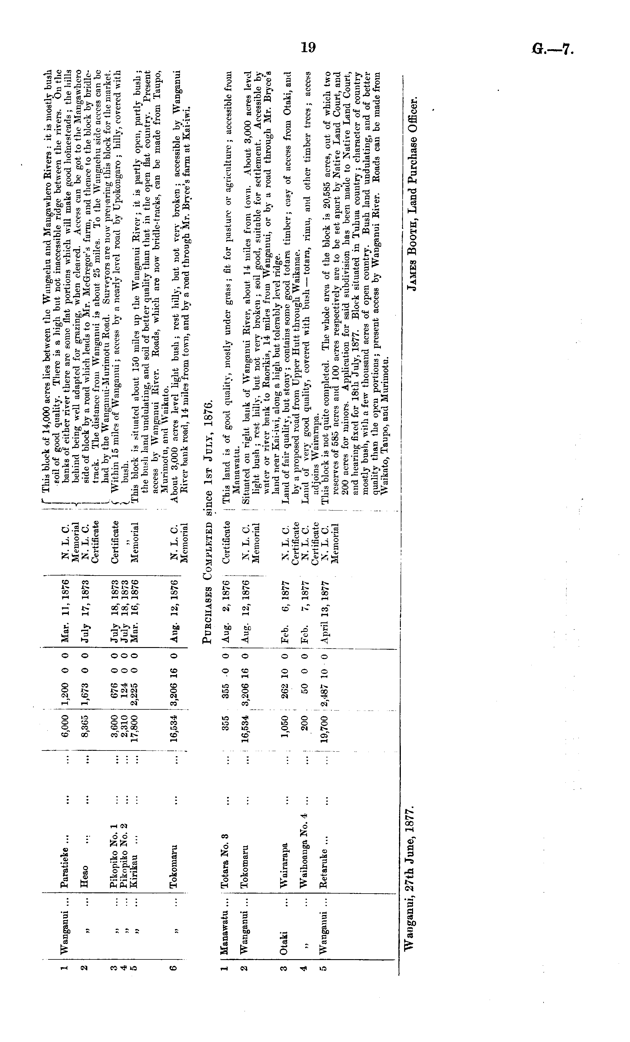 l 2 3 4 5 Wanganui ... ii ... ,, ... Paratieke ... Heao ... Pikopiko No. 1 Pikopiko No. 2 Kirikau Tokomaru 6,000 1,200 0 0 8,365 1,673 0 0 3,600 676 0 0 2,310 124 0 0 ... 17,800 2,225 0 0 ... 16,534 3,206 16 0 f This block of 14,000 acres lies between the Wangaehu and Mangawhero Rivers : it is mostly bush soil of good quality. There is a high but not inaccessible ridge between the rivers. On the Mar. 11, 1876 N. L. C. banks of cither river there are some flat portions which will make good homesteads ; the hills Memorial -{ behind being well adapted for grazing, when cleared. Access can be got to the Mangawhero July 17, 1873 N. L. C. side of block by a road which leads to Mr. McGregor's farm, and thence to the block by bridleCertificate track. The distance from Wanganui is about 25 miles. To the Wangaehu side access can be { had by the Wangamii-Murimotu Road. Surveyors are now preparing this block for the market. July 18,1873 Certificate f Within 15 miles of Wanganui; access bv a nearly level road by Upokongaro ; hilly, covered with July 18, 1873 „ i bush. ' Mar. 16, 1876 Memorial This block is situated about 150 miles up the Wanganui River; it is partly open, partly bush; the bush land undulating, and soil of better quality than that in the open flat country. "Present access by Wanganui Eiver. Roads, which are now bridle-tracks, can be made from Taupo, Murimotu, and Waikato. Aug. 12, 1876 N. L. C. About 3,000 acres level light bush ; rest hilly, but not very broken ; accessible by Wanganui Memorial River bank road, 14 miles from town, and by a road through Mr. lime's farm at Kai-iwi. ,, ... ,, 6 ,, 1 Manawatu ... PuitciiASES Completed since 1st July, 187G. 2 3 4 Wanganui ... Otaki Totara No. 3 Tokomaru Wairarapa Waihoanga No. 4 ... Retaruke ... 355 355 0 0 ... 16,534 3,206 16 0 1,050 262 10 0 200 50 0 0 ... 19,700 i 2,487 10 0 Aug. 2, 1876 Certificate ; This land is of good quality, mostly under grass ; fit for pasture or agriculture ; accessible froin Manawatu. Aug. 12, 1876 N. L. 0. ' Situated on right bank of Wanganui River, about 14 miles from (own. About 3,000 acres level Memorial light bush ; rest hilly, but not very broken ; soil good, suitable for settlement. Accessible bywater or river bank to Raorikia, 14 miles from Wanganui, or by a road through Mr. Bryee's land near Kai-iwi, along a high but tolerably level ridge. Feb. 6, 1877 N. L. C. Land of fair quality, but stony; contains some good totara timber; easy of access from Otaki, and Certificate by a proposed road from Upper Hutt through Waikanae. Feb. 7,1877 N. L. C. Land of very good quality, covered with bush. — totara, rimu, and other timber trees; access Certificate adjoins Wairarapa. April 13, 1877 N. L. C. This block is not quite completed. The whole area of the block is 20,585 acres, out of which two Memorial reserves of 585 acres and 100 acres respectively are to be set apart by Native Land Court, and 200 acres for minors. Application for said subdivision has been made to Native Land Court, and hearing fixed for 18th July, 1877. Block situated in Tuhua country ; character of country mostly hush, with a few thousand acres of open country. Bush land undulating, and of better quality than the open portions; present access by Wanganui River. Roads can be made from Waikato, Taupo, and Murimotu. 5 Wanganui ... I i "Wanganui, 27th June, 1877. James Booth, Land Purchase Officer.