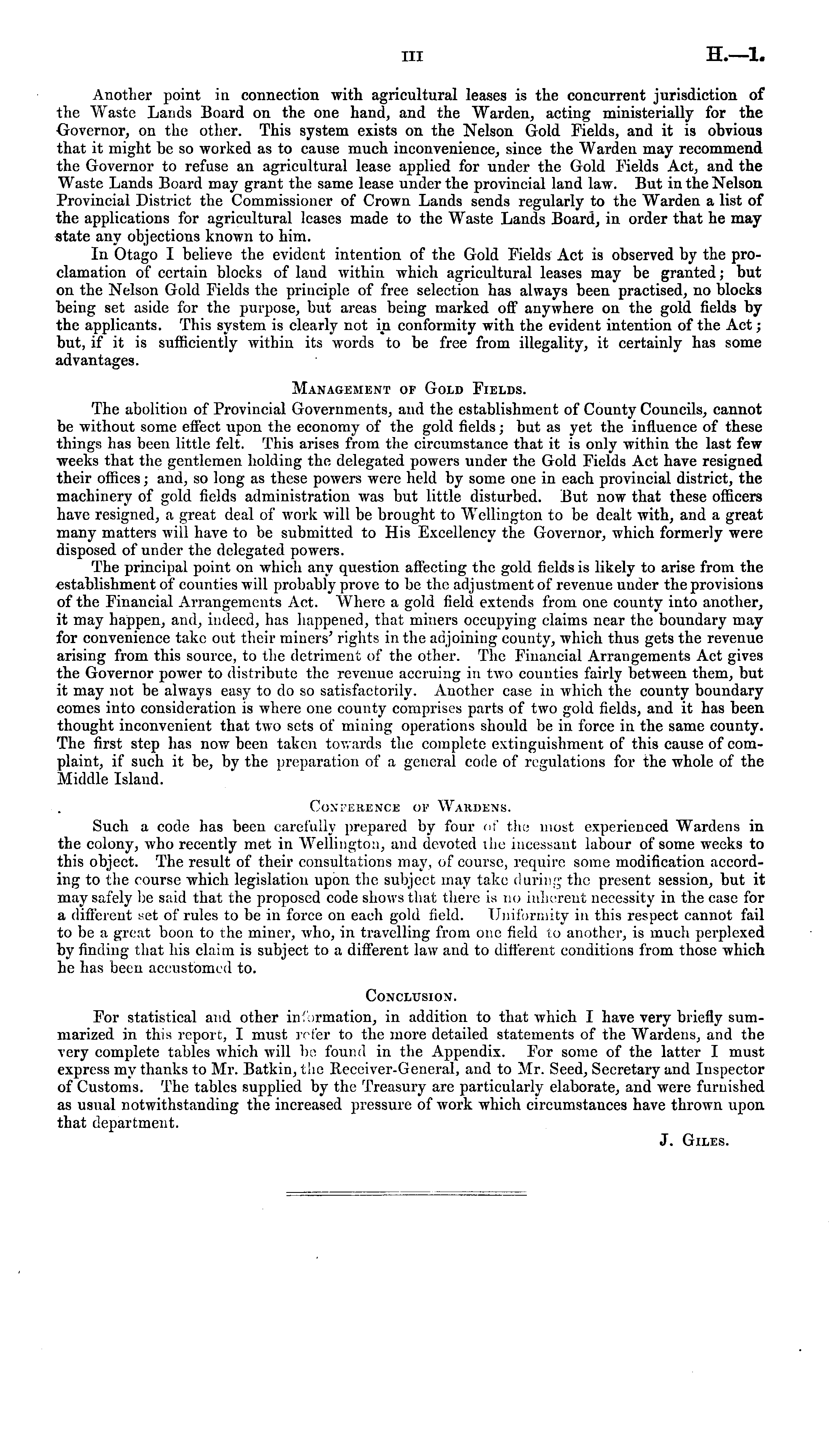 Another point in connection with agricultural leases is the concurrent jurisdiction of the Waste Lands Board on the one hand, and the Warden, acting ministerially for the Governor, on the other. This system exists on the Nelson Gold Fields, and it is obvious that it might be so worked as to cause much inconvenience, since the Warden may recommend the Governor to refuse an agricultural lease applied for under the Gold Fields Act, and the Waste Lands Board may grant the same lease under the provincial land law. But in the Nelson Provincial District the Commissioner of Crown Lands sends regularly to the Warden a list of the applications for agricultural leases made to the Waste Lands Board, in order that he may state any objections known to him. In Otago I believe the evident intention of the Gold Fields Act is observed by the proclamation of certain blocks of laud within which agricultural leases may be granted; but on the Nelson Gold Fields the principle of free selection has always been practised, no blocks being set aside for the purpose, but areas being marked off anywhere on the gold fields by the applicants. This system is clearly not in conformity with the evident intention of the Act; but, if it is sufficiently within its words to be free from illegality, it certainly has some advantages. Management of Gold Fields. The abolition of Provincial Governments, and the establishment of County Councils, cannot be without some effect upon the economy of the gold fields; but as yet the influence of these things has been little felt. This arises from the circumstance that it is only within the last few weeks that the gentlemen holding the delegated powers under the Gold Fields Act have resigned their offices; and, so long as these powers were held by some one in each provincial district, the machinery of gold fields administration was but little disturbed. But now that these officers have resigned, a great deal of work will be brought to Wellington to be dealt with, and a great many matters will have to be submitted to His Excellency the Governor, which formerly were disposed of under the delegated powers. The principal point on which any question affecting the gold fields is likely to arise from the establishment of counties will probably prove to be the adjustment of revenue under the provisions of the Financial Arrangements Act. Where a gold field extends from one county into another, it may happen, and, indeed, has happened, that miners occupying claims near the boundary may for convenience take out their miners' rights in the adjoining county, which thus gets the revenue arising from this source, to the detriment of the other. The Financial Arrangements Act gives the Governor power to distribute the revenue accruing in two counties fairly between them, but it may not be always easy to do so satisfactorily. Another ease in which the county boundary comes into consideration is where one county comprises parts of two gold fields, and it has been thought inconvenient that two sets of mining operations should be in force in the same county. The first step has now been taken towards the complete extinguishment of this cause of complaint, if such it he, by the preparation of a general code of regulations for the whole of the Middle Island. Conference of Wardens. Such a code has been carefully prepared by four of the most experienced Wardens in the colony, who recently met in AVellington, and devoted the incessant labour of some weeks to this object. The result of their consultations may, of course, require some modification according to the course which legislation upon the subject may take during the present session, but it may safely be said that the proposed code shows that there is no inherent necessity in the case for a different set of rules to be in force on each gold field. Uniformity in this respect cannot fail to be a great boon to the miner, who, in travelling from one field to another, is much perplexed by finding that his claim is subject to a different law and to different conditions from those which he has been accustomed to. Conclusion. For statistical and other information, in addition to that which I have very briefly summarized in this report, I must refer to the more detailed statements of the Wardens, and the very complete tables which will be found in the Appendix. For some of the latter I must express my thanks to Mr. Batkin, the Receiver-General, and to Mr. Seed, Secretary and Inspector of Customs. The tables supplied by the Treasury are particularly elaborate, and were furnished as usual notwithstanding the increased pressure of work which circumstances have thrown upon that department. J. Giles.
