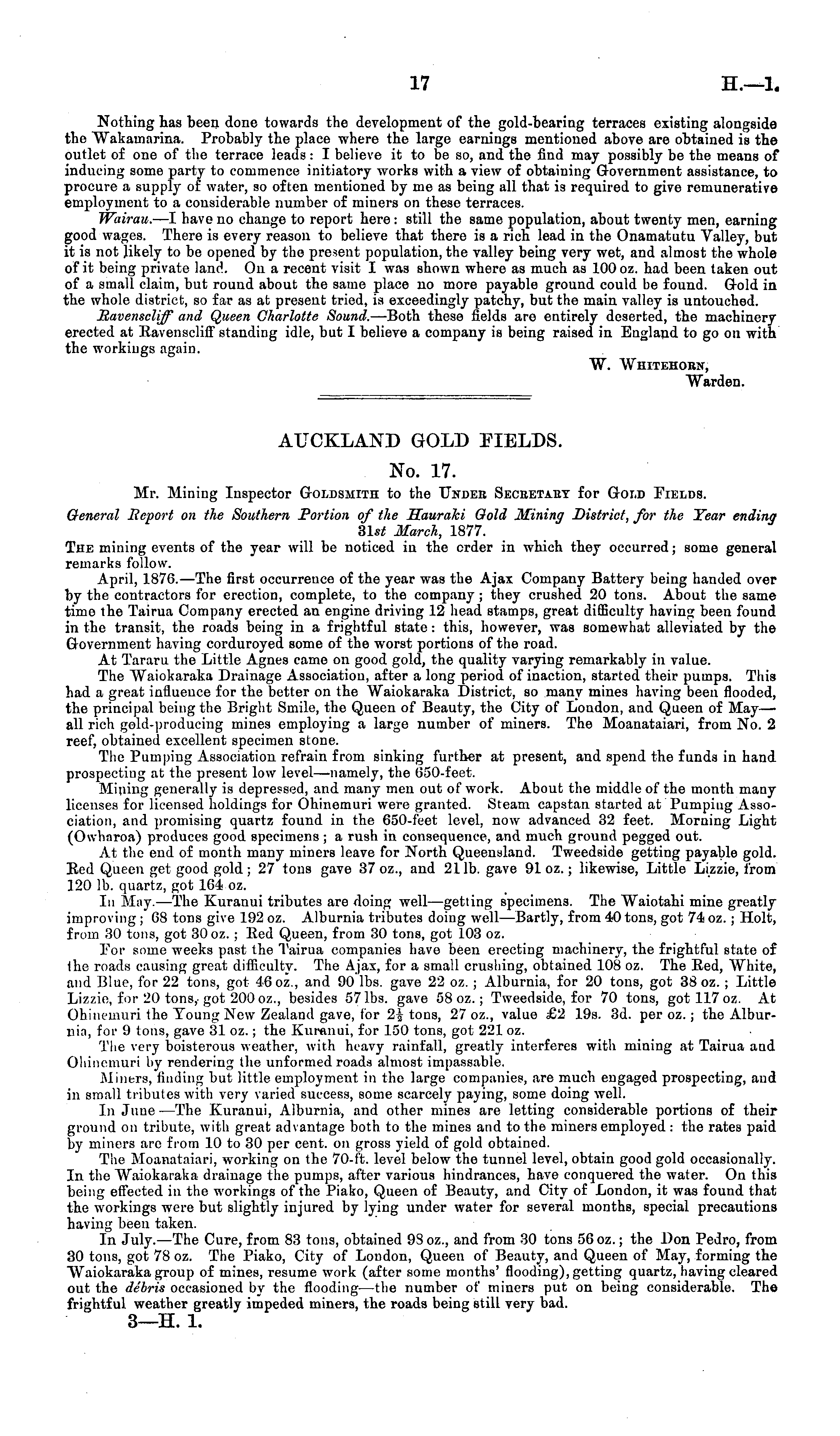 Nothing has been done towards the development of the gold-bearing terraces existing alongside the AVakainarina. Probably the place where the large earnings mentioned above are obtained is the outlet of one of the terrace leads: I believe it to be so, and the find may possibly be the means of inducing some party to commence initiatory works with a view of obtaining Government assistance, to procure a supply of water, so often mentioned by me as being all that is required to give remunerative employment to a considerable number of miners on these terraces. Wairau. —l have no change to report here: still the same population, about twenty men, earning good wages. There is every reason to believe that there is a rich lead in the Onamatutu Valley, but it is not likely to be opened by the present population, the valley being very wet, and almost the whole of it being private land. On a recent visit I was shown where as much as 100 oz. had been taken out of a small claim, but round about the same place no more payable ground could be found. Gold in the whole district, so far as at present tried, is exceedingly patchy, but the main valley is untouched. Bavenscliff and Queen Charlotte Sound. —Both these fields are entirely deserted, the machinery erected at Ravenscliff standing idle, but I believe a company is being raised in England to go on with the workings again. W. AVhitehoen, Warden.