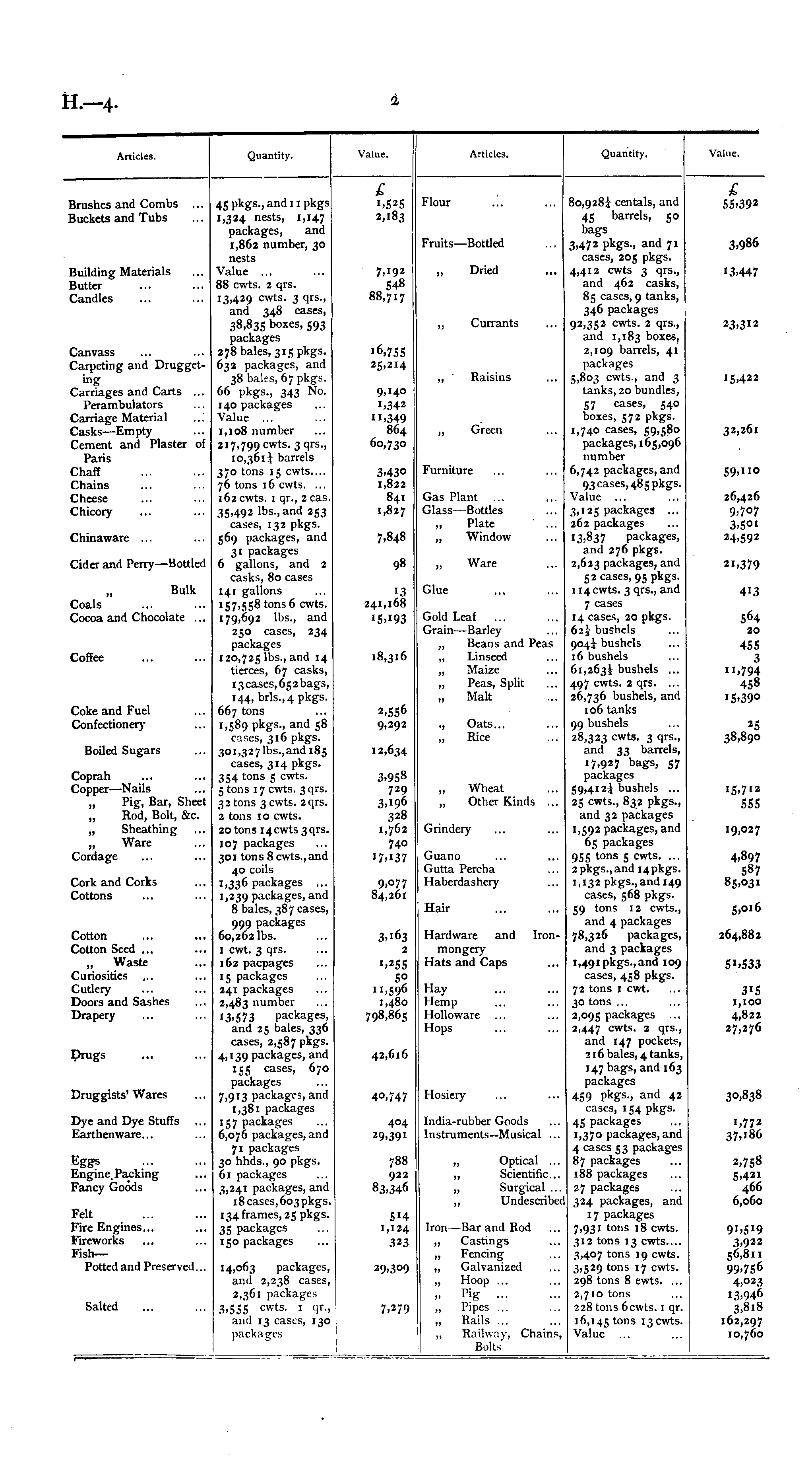 Articles. Quantity. Value. Articles. Quantity. Value. Brushes and Combs ... Buckets and Tubs 45 pkgs., and 11 pkgs 1,324 nests, 1,147 packages, and 1,862 number, 30 nests Value ... 88 cwts. 2 qrs. 13,429 cwts. 3 qrs., and 348 cases, 38,835 boxes, 593 packages 278 bales, 315 pkgs. 632 packages, and 38 bales, 67 pkgs. 66 pkgs., 343 No. 140 packages Value ... 1,108 number 217,799 cwts. 3 qrs., 10,36It barrels 370 tons 15 cwts.... 76 tons 16 cwts. ... 162 cwts. 1 qr., 2cas. 35,492 lbs., and 253 cases, 132 pkgs. 569 packages, and 31 packages 6 gallons, and 2 casks, 80 cases 141 gallons 157,558 tons 6 cwts. 179,692 lbs., and 250 cases, 234 packages 120,725 lbs., and 14 tierces, 67 casks, 13 cases, 65 2 bags, 144, brls.,4 pkgs. 667 tons 1,589 pkgs., and 58 cases, 316 pkgs. 301,32710s.,and 185 cases, 314 pkgs. 354 tons 5 cwts. 5 tons 17 cwts. 3 qrs. 32 tons 3 cwts. 2 qrs. 2 tons 10 cwts. 20 tons I4cwts3qrs. 107 packages 301 tons 8 cwts.,and 40 coils 1,336 packages ... 1,239 packages, and 8 bales, 387 cases, 999 packages 6o,262lbs. 1 cwt. 3 qrs. 162 pacpages 15 packages 241 packages 2,483 number "3.573 packages, and 25 bales, 336 cases, 2,587 pkgs. 4,139 packages, and 155 cases, 670 packages 7,913 packages, and 1,381 packages 157 packages 6,076 packages, and 71 packages 30 hhds., 90 pkgs. 61 packages 3,241 packages, and 18 cases, 603 pkgs. 134 frames, 25 pkgs. 35 packages 150 packages £ i,5 25 2,183 Flour 80,928! centals, and 45 barrels, 50 hags 3,472 pkgs., and 71 cases, 205 pkgs. 4,412 cwts 3 qrs., and 462 casks, 85 cases, 9 tanks, 346 packages 92,352 cwts. 2 qrs., and 1,183 boxes, 2,109 barrels, 41 packages 5,803 cwts., and 3 tanks, 20 bundles, 57 cases, 540 boxes, 572 pkgs. 1,740 cases, 59,580 packages, 165,096 number 6,742 packages, and 93 cases, 485 pkgs. Value ... 3,125 packages ... 262 packages •3,837 packages, and 276 pkgs. 2,623 packages, and 52 cases, 95 pkgs. 114 cwts. 3 qrs., and 7 cases 14 cases, 20 pkgs. 62^ bushels 9044 bushels 16 bushels 6 1,263 1 bushels ... 497 cwts. 2 qrs. ... 26,736 bushels, and 106 tanks 99 bushels 28,323 cwts. 3 qrs., and 33 barrels, 17,927'bags, 57 packages 59,4124- bushels ... 25 cwts., 832 pkgs., and 32 packages 1,592 packages, and 65 packages 955 tons 5 cwts. ... 2pkgs.,and I4pkgs. 1,132 pkgs.,andi49 cases, 568 pkgs. 59 tons 12 cwts., and 4 packages 78,326 packages, and 3 packages 1,491 pkgs.,and 109 cases, 458 pkgs. 72 tons 1 cwt. 30 tons ... 2,095 packages 2,447 ewts. 2 qrs., and 147 pockets, 216 bales, 4 tanks, 147 bags, and 163 packages 459 Pkgs., and 42 cases, 154 pkgs. 45 packages 1,370 packages, and 4 cases 53 packages 87 packages 188 packages 27 packages 324 packages, and 17 packages 7,931 tons 18 cwts. 312 tons 13 cwts.... 3,407 tons 19 cwts. 3,529 tons 17 cwts. 298 tons 8 ewts. ... 2,710 tons 228 tons 6 cwts. 1 qr. 16,145 tons 13 cwts. Value ... £ 55,392 Fruits—Bottled 3,986 Building Materials Butter Candles 7,192 548 88,717 ,, Dried 13,447 i6,755 25,214 „ Currants 23,3 12 Canvass Carpeting and Druggeting Carriages and Carts ... Perambulators Carriage Material Casks —Empty Cement and Plaster of Paris Chaff Chains Cheese Chicory 9,140 1.342 ".349 864 60,730 ,, Raisins „ Green '5,422 32,261 3.430 1,822 841 1,827 Furniture 59>"° Gas Plant Glass—Bottles „ Plate „ Window 26,426 9,707 3,5°' 24,592 Chinaware ... 7.848 Cider and Perry —Bottled 98 ,, Ware 2J.379 Bulk Coals Cocoa and Chocolate ... •3 241,168 JS.I93 Glue Gold Leaf Grain—Barley ,, Beans and Peas ,, Linseed „ Maize ,, Peas, Split Malt 413 564 20 455 3 ",794 458 15,390 Coffee 18,316 Coke and Fuel Confectionery 2,556 9,292 ., Oats... „ Rice 25 38,890 Boiled Sugars 12,634 Coprah Copper—Nails „ Pig, Bar, Sheet „ Rod, Bolt, &c. „ Sheathing „ Ware Cordage 3.958 729 3.I96 328 1,762 740 i7>'37 „ Wheat „ Other Kinds ... Grindery 15.712 555 19,027 Guano Gutta Percha Haberdashery 4,897 587 85,031 Cork and Corks Cottons 9>°77 84,261 Hair 5,016 Cotton Cotton Seed ... „ Waste Curiosities Cutlery Doors and Sashes Drapery 3.163 2 M55 5° n.596 1,480 798,865 Hardware and Ironmongery Hats and Caps 264,882 51,533 Hay Hemp Hollovvare Hops 315 1,100 4,822 27,276 Drugs 42,616 Druggists'Wares 40,747 Hosiery 30,838 Dye and Dye Stuffs Earthenware... 4°4 29.391 India-rubber Goods Instruments—Musical ... 1,772 37,186 Eggs Engine. Packing Fancy Goods 788 922 83>346 „ Optical ... „ Scientific... ,, Surgical ... ,, Undescribed 2,758 5,421 466 6,060 Felt Fire Engines... Fireworks FishPotted and Preserved... 5'4 1,124 323 Iron—Bar and Rod ,, Castings „ Fencing ,, Galvanized ,, Hoop ... ,. Kg „ Pipes ... „ Rails ... „ Railway, Chains, Belts' 91,519 3,922 56,811 99.756 4,023 13,946 3,818 162,297 10,760 Salted 14,063 packages, and 2,238 cases, 2,361 packages 3,555 cwts- ' V-> and 13 cases, 130 packages 29,309 7.279