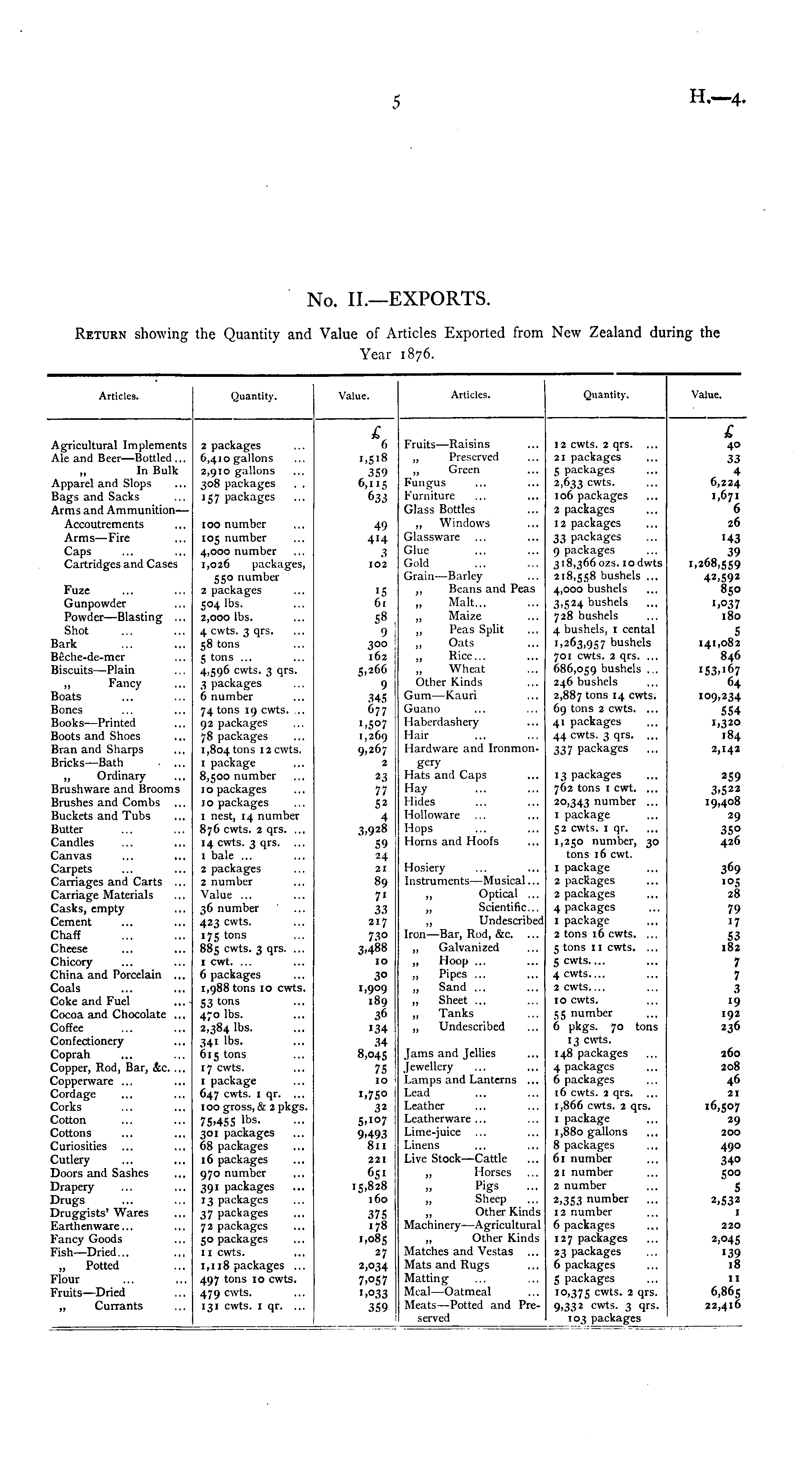 No. II.—EXPORTS. RETURN showing the Quantity and Value of Articles Exported from New Zealand during the Year 1876.