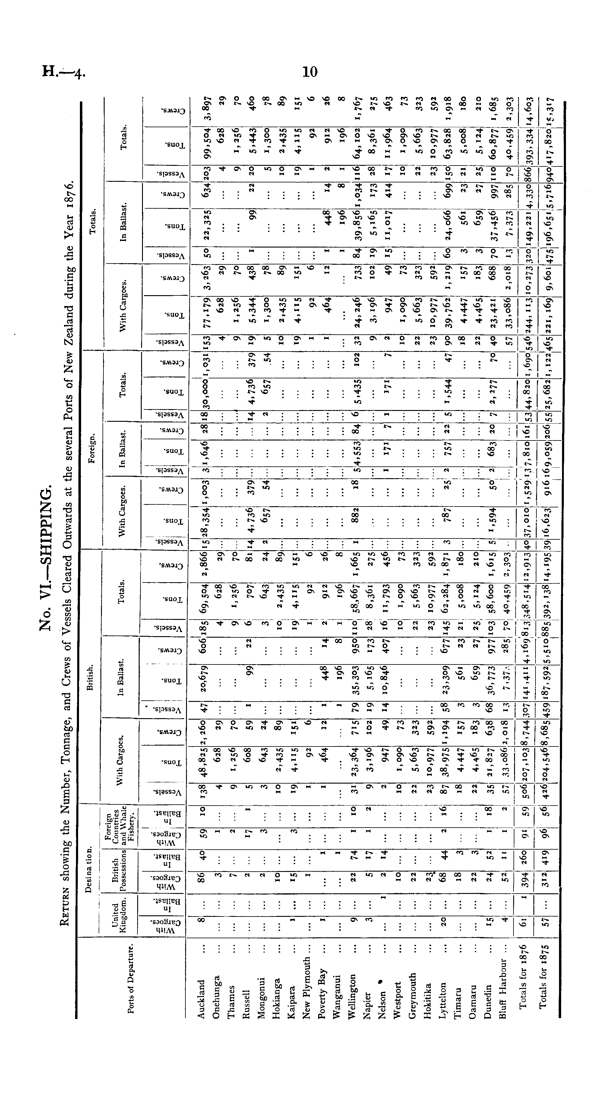 No. VI.—SHIPPING. RETURN showing the Number, Tonnage, and Crews of Vessels Cleared Outwards at the several Ports of New Zealand during the Year 1876.