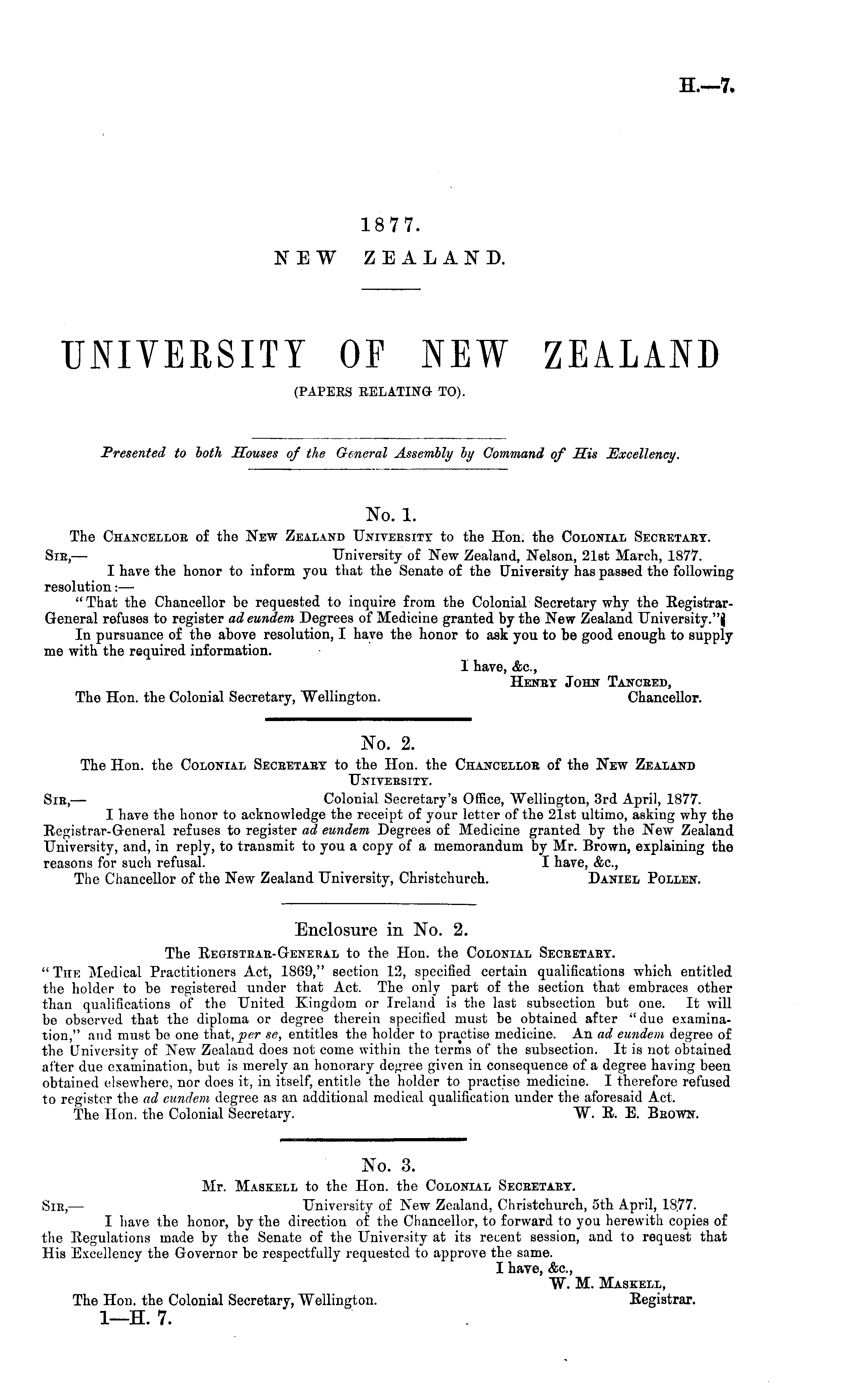 No. 1. The Chancellor of the New Zealand University to the Hon. the Colonial Secretary. Sir, — University of New Zealand, Nelson, 21st March, 1877. I have the honor to inform you that the Senate of the University has passed the following resolution: — "That the Chancellor be requested to inquire from the Colonial Secretary why the RegistrarGeneral refuses to register ad eundem Degrees of Medicine granted by the New Zealand University."j In pursuance of the above resolution, I have the honor to ask you to be good enough to supply me with the required information. I have, &c, Henry John Tancred, The Hon. the Colonial Secretary, Wellington. Chancellor.