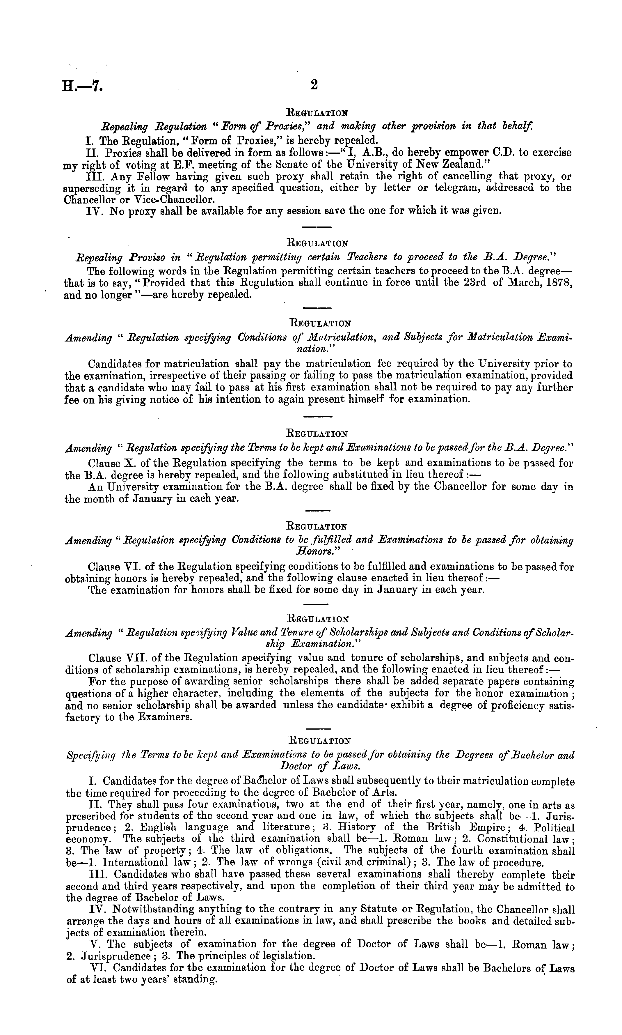 Regulation Repealing Regulation " Form of Proxies," and making other provision in that behalf. I. The Regulation. " Form of Proxies," is hereby repealed. 11. Proxies shall be delivered in form as follows:—" I, A.8., do hereby empower CD. to exercise my right of voting at E.F. meeting of the Senate of the University of New Zealand." 111. Any Fellow having given such proxy shall retain the right of cancelling that proxy, or superseding it in regard to any specified question, either by letter or telegram, addressed to the Chancellor or Vice-Chancellor. IV. No proxy shall be available for any session save the one for which it was given.