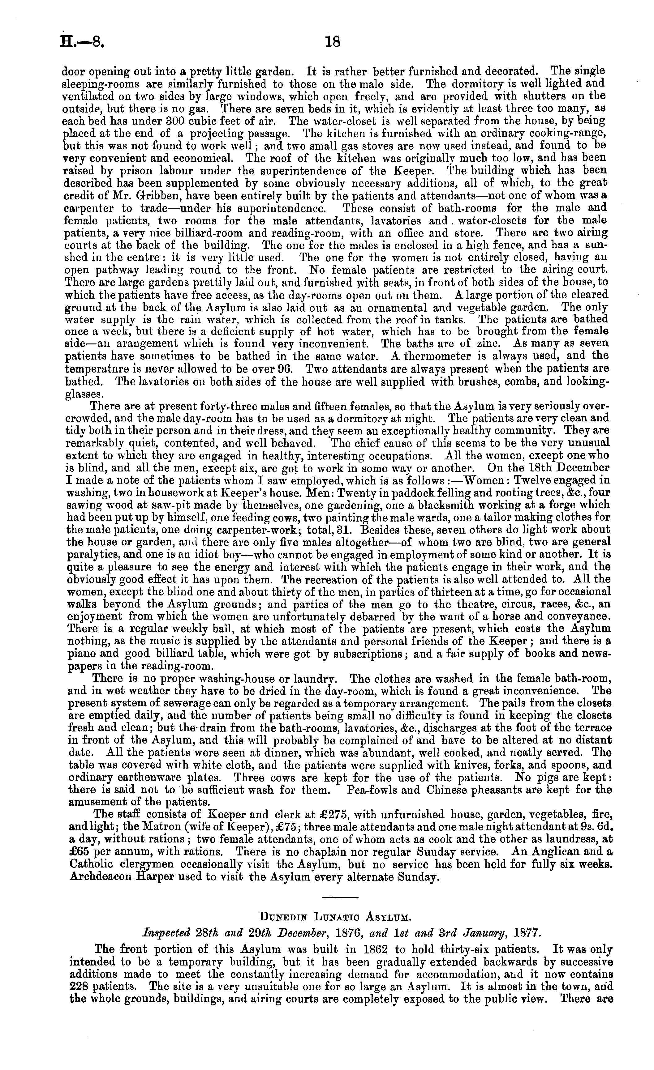 Dunedin Lunatic Asylum. Inspected 28th and 29th December, 1876, and Ist and 3rd January, 1877. The front portion of this Asylum was built in 1862 to hold thirty-six patients. It was only intended to be a temporary building, but it has been gradually extended backwards by successive additions made to meet the constantly increasing demand for accommodation, and it now contains 228 patients. The site is a very unsuitable one for so large an Asylum. It is almost in the town, and the whole grounds, buildings, and airing courts are completely exposed to the public view. There are
