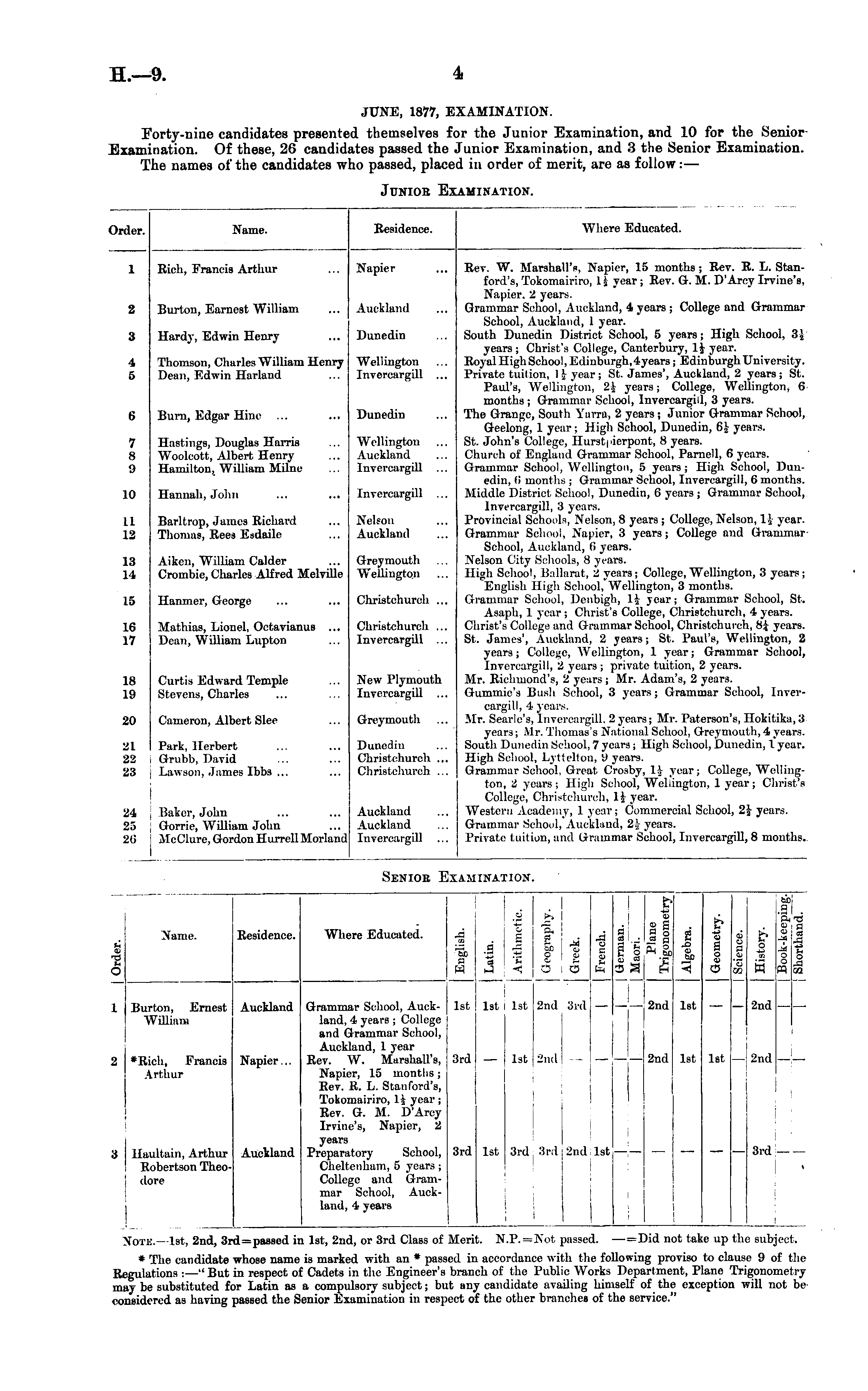 JUNE, 1877, EXAMINATION. Forty-nine candidates presented themselves for the Junior Examination, and 10 for the Senior Examination. Of these, 26 candidates passed the Junior Examination, and 3 the Senior Examination. The names of the candidates who passed, placed in order of merit, are as follow: —