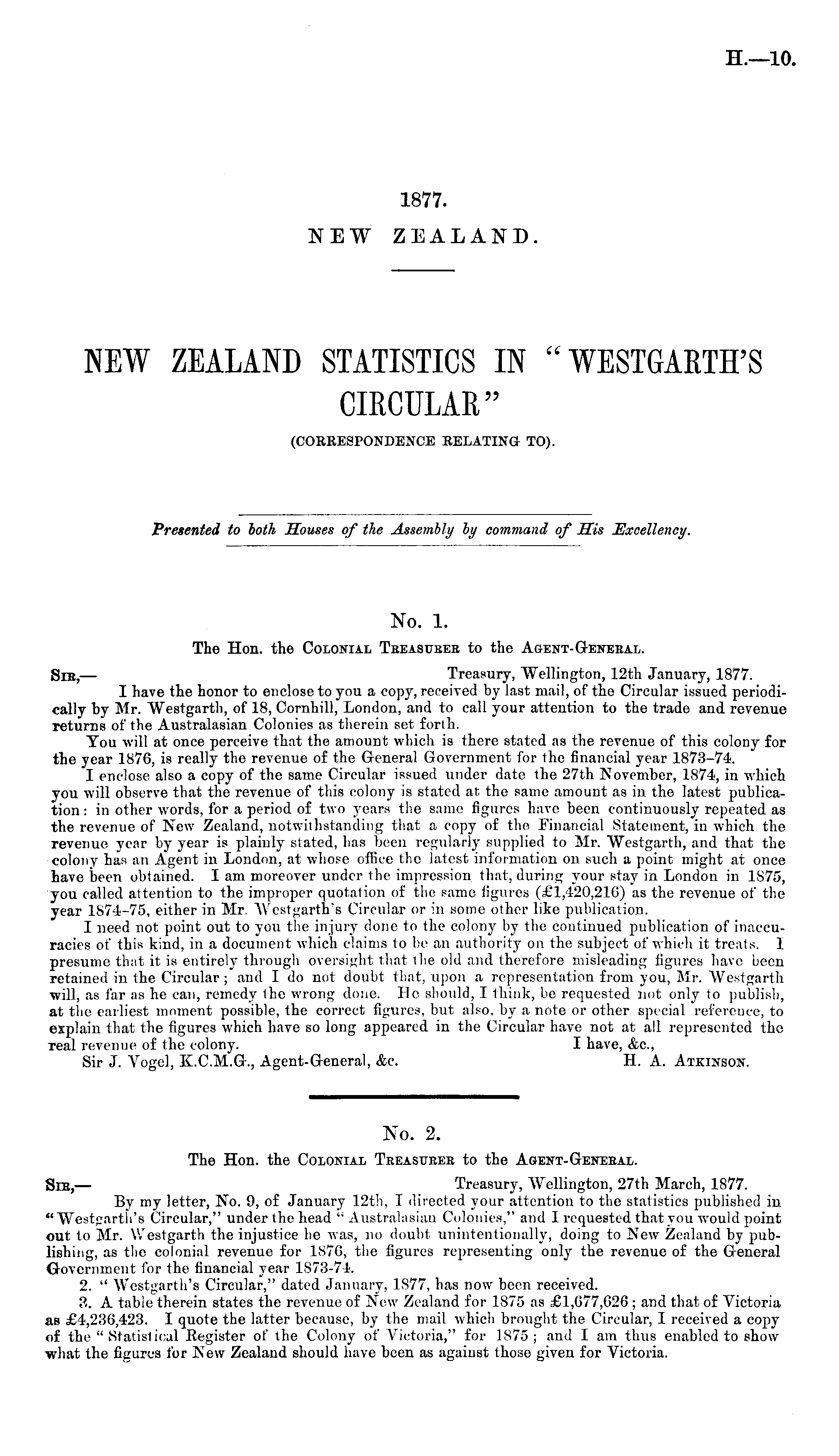 No. 1. The Hon. the Colonial Treasurer to the Agent-General. Sir, — Treasury, Wellington, 12th January, 1877. I have the honor to enclose to you a copy, received by last mail, of tho Circular issued periodically by Mr. Westgarth, of 18, Cornhill, London, and to call your attention to the trade and revenue returns of the Australasian Colonies as therein set forth. Tou will at once perceive that the amount which is there stated as the revenue of this colony for the year 1876, is really the revenue of the General Government for the financial year 1873-74. I enclose also a copy of the same Circular issued under date the 27th November, 1874, in which you will observe that the revenue of this colony is stated at the same amount as in the latest publication : in other words, for a period of two years the same figures have been continuously repeated as the revenue of New Zealand, notwirhstanding that a copy of the Financial Statement, in which the revenue year by year is plainly stated, has been regularly supplied to Mr. Westgarth, and that the colony has an Agent in London, at whose office the latest information on such a point might at once have been obtained. lam moreover under the impression that, during your stay in London in 1575, you called attention to the improper quotation of tho same figures (£1,420,216) as the revenue of the year 1874-75, either in Mr. Westgarth's Circular or in some other like publication. I need not point out to you the injury done to the colony by the continued publication of inaccuracies of this kind, in a document which claims to be an authority on the subject of which it treats. I presume that it is entirely through oversight that the old and therefore misleading figures have been retained in the Circular ; and I do not doubt that, upon a representation from you, Mr. Westgarth ■will, as far as he can, remedy the wrong done. He should, I think, be requested irot only to publish, at the earliest moment possible, the correct figures, but also, by a note or other special reference, to explain that the figures which have so long appeared in the Circular have not at all represented the real revenue of the colony. I have, &c., Sir J. Arogel, K.C.M.G., Agent-General, &c. H. A. Atkinson.
