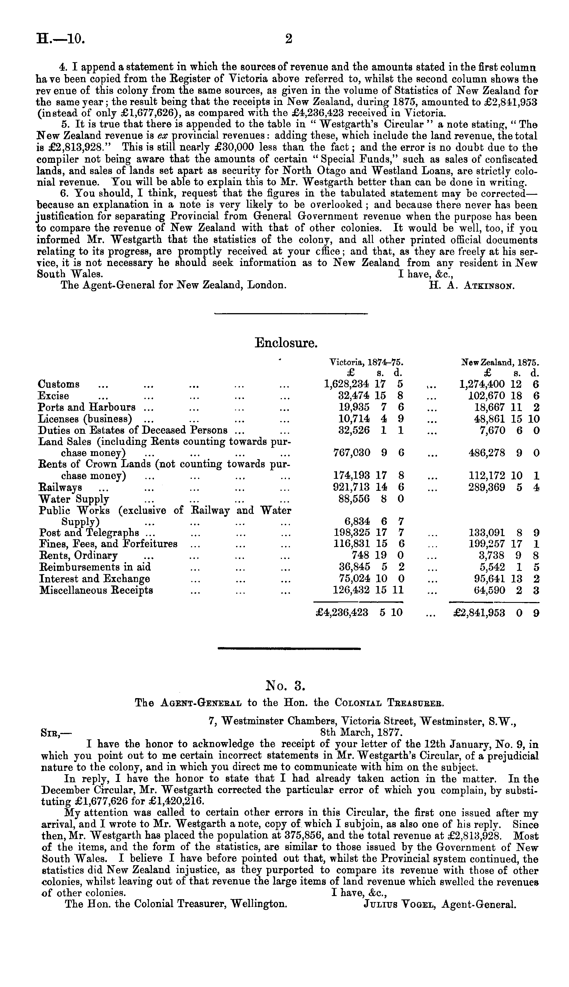 No. 3. The Agent-General to the Hon. the Colonial Treasurer. 7, Westminster Chambers, Victoria Street, Westminster, S.W., Sir,— Bth March, 1877. I have the honor to acknowledge the receipt of your letter of the 12th January, No. 9, in which you point out to me certain incorrect statements in Mr. Westgarth's Circular, of a prejudicial nature to the colony, and in which you direct me to communicate with him on the subject. In reply, I have the honor to state that I had already taken action in the matter. In the December Circular, Mr. Westgarth corrected the particular error of which you complain, by substituting £1,677,626 for £1,420,216. My attention was called to certain other errors in this Circular, the first one issued after my arrival, and I wrote to Mr. Westgarth a note, copy of which I subjoin, as also one of his reply. Since then, Mr. Westgarth has placed the population at 375,856, and the total revenue at £2,813,928. Most of the items, and the form of the statistics, are similar to those issued by the Government of New South Wales. I believe I have before pointed out that, whilst the Provincial system continued, the statistics did New Zealand injustice, as they purported to compare its revenue with those of other colonies, whilst leaving out of that revenue the large items of land revenue which swelled the revenues of other colonies. I have, Ac., The Hon. the Colonial Treasurer, Wellington. Julius Vogel, Agent-General.