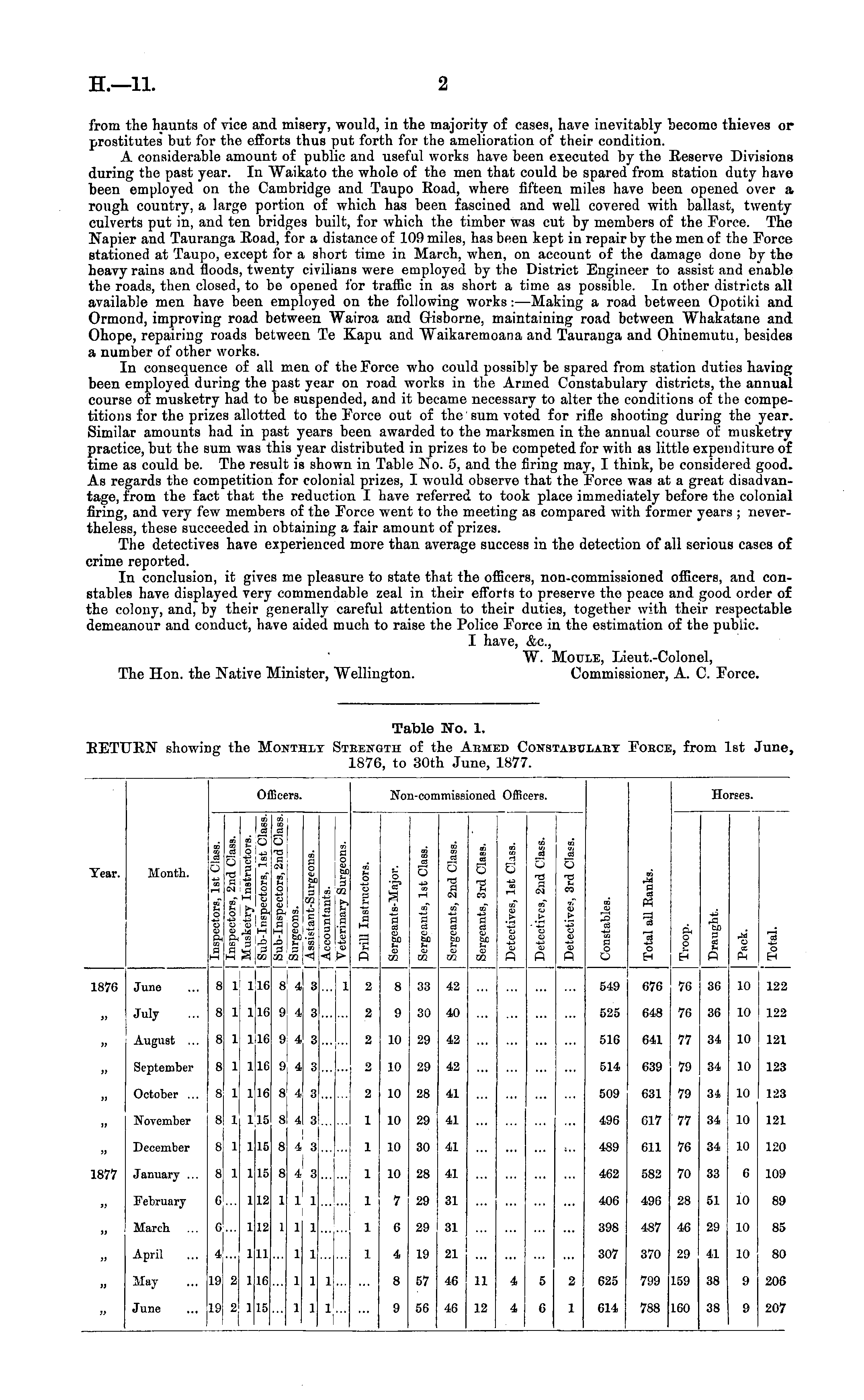 Table No. 1. RETURN showing the MONTHLY STRENGTH of the ARMED CONTABULARY FORCE, from 1st June, 1876, to 30th June, 1877.