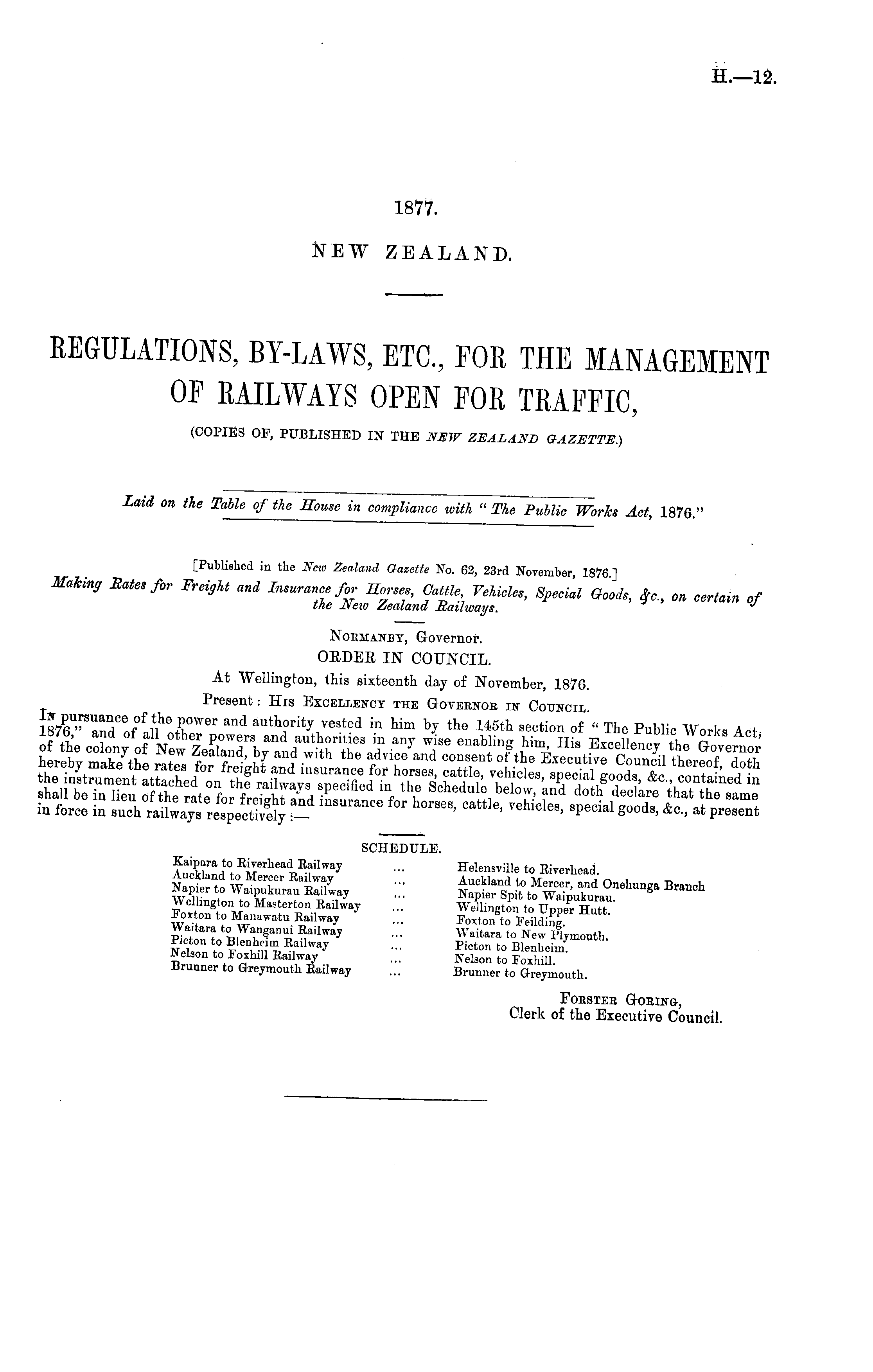 REGULATIONS, BY-LAWS, ETC., FOR THE MANAGEMENT OF RAILWAYS OPEN FOR TRAFFIC, (COPIES OF, PUBLISHED IN THE NEW ZEALAND GAZETTE.)